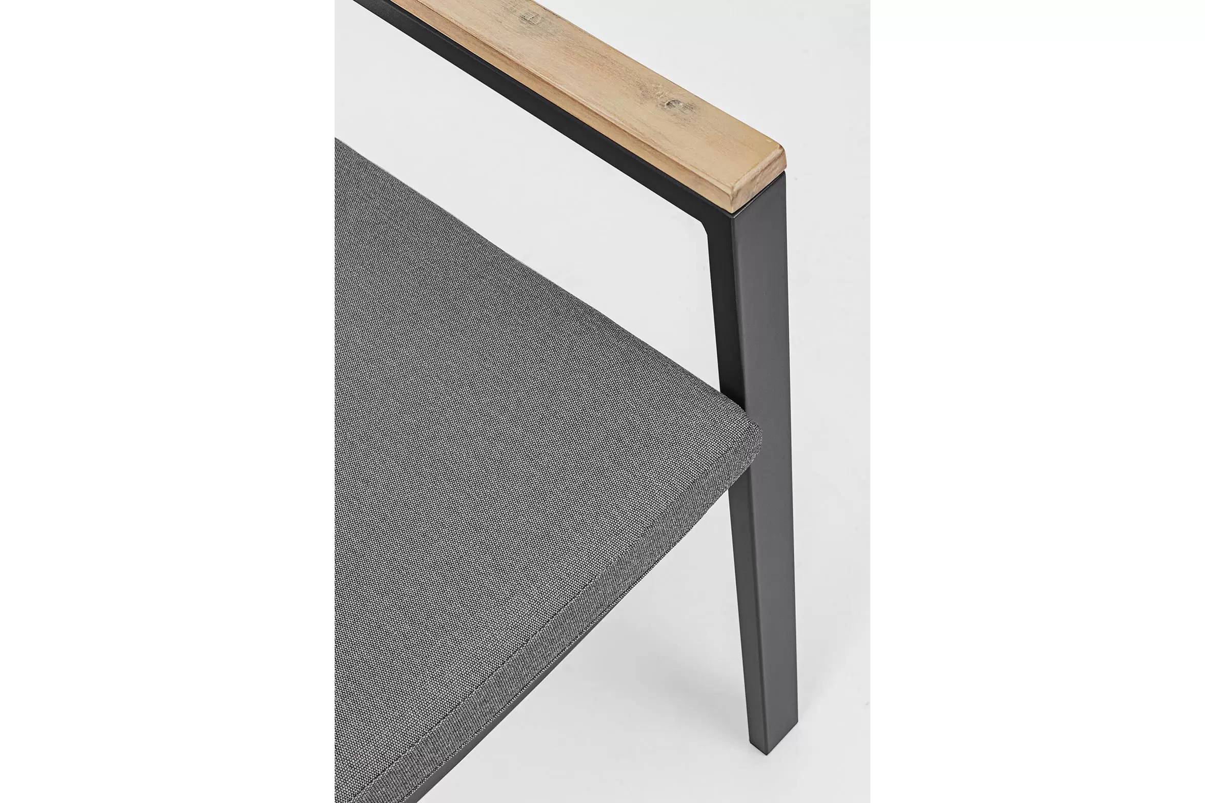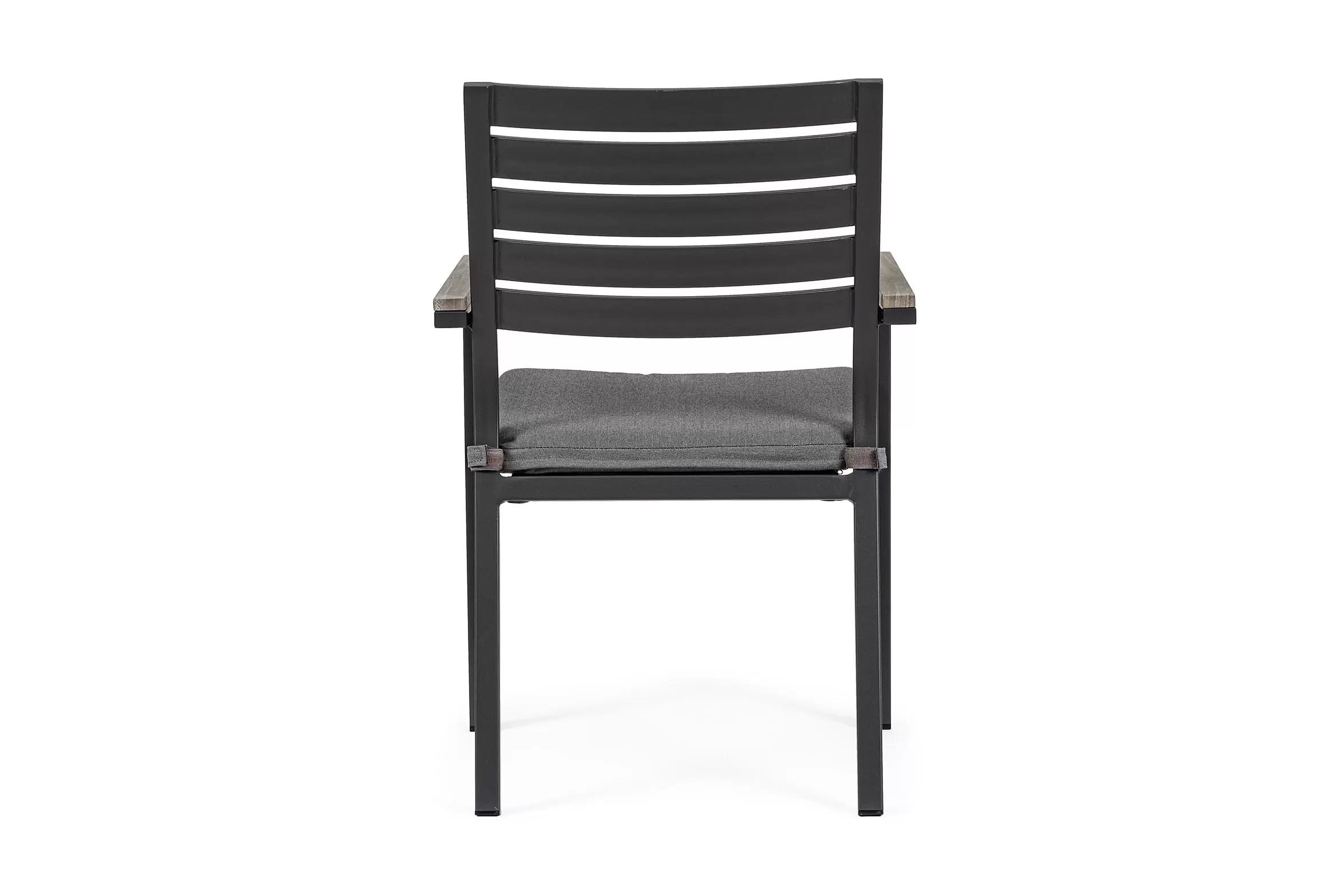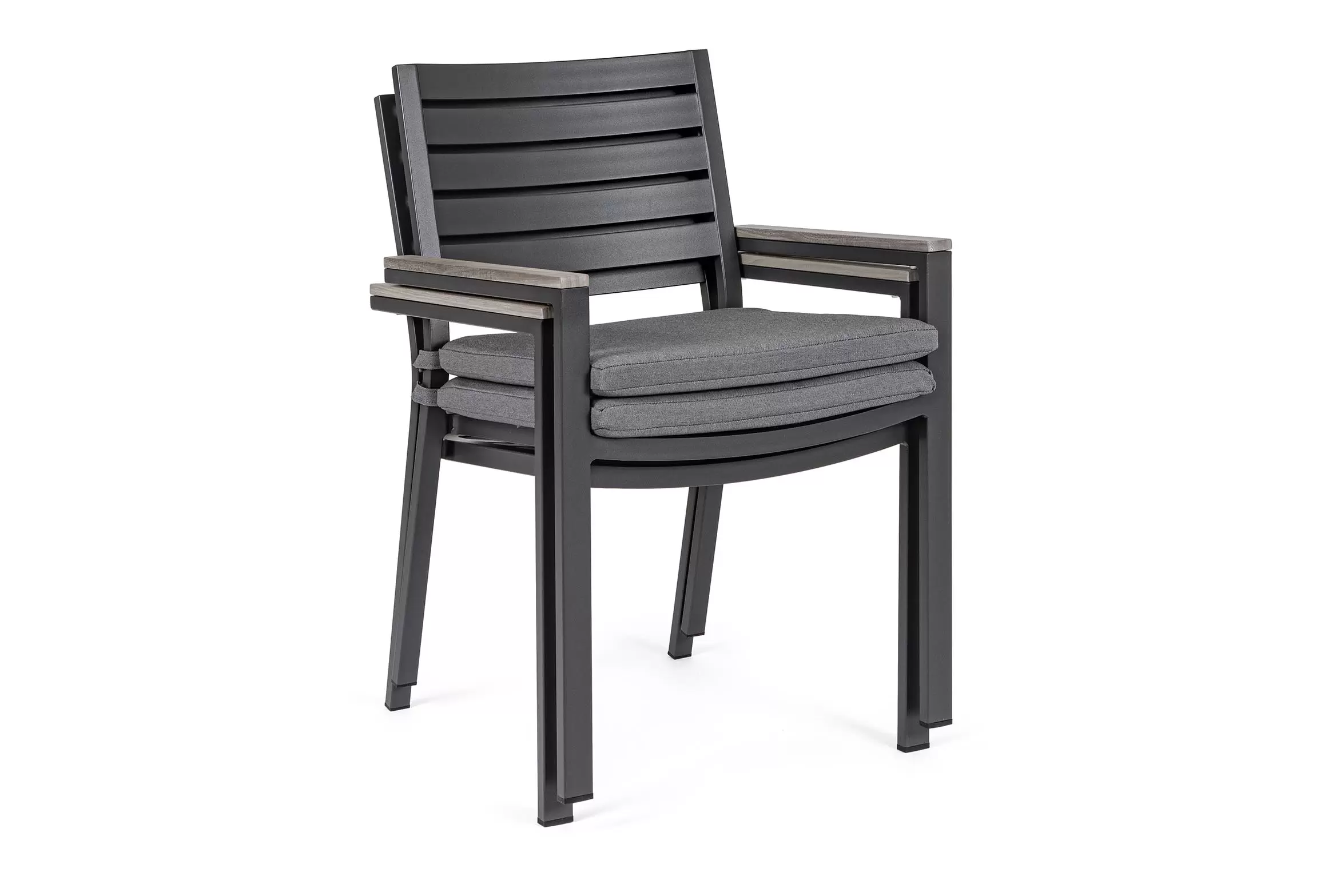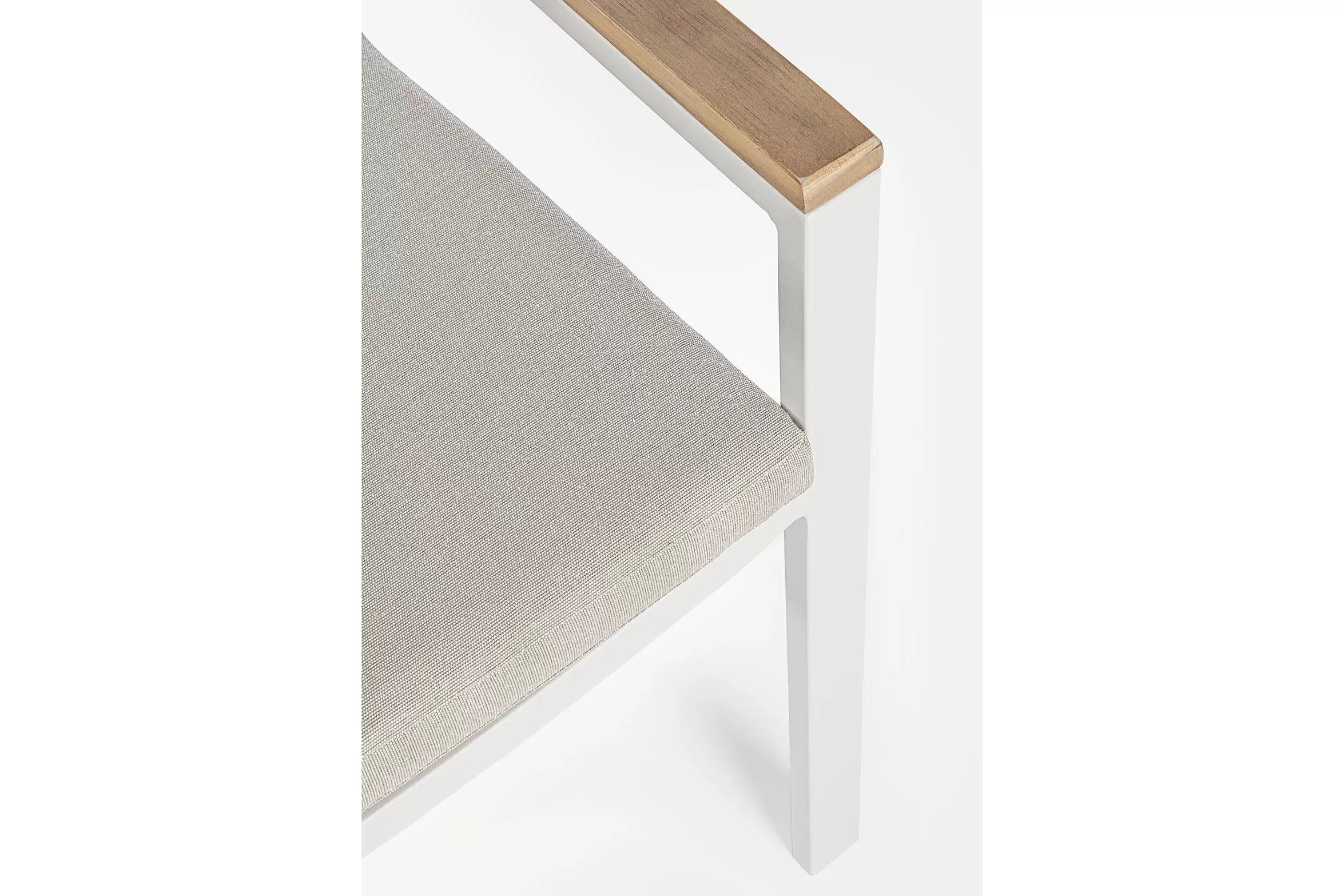 Aluminiowe krzesło ogrodowe z poduszką z podłokietnikami pokrytymi powłoką imitującą drewno.