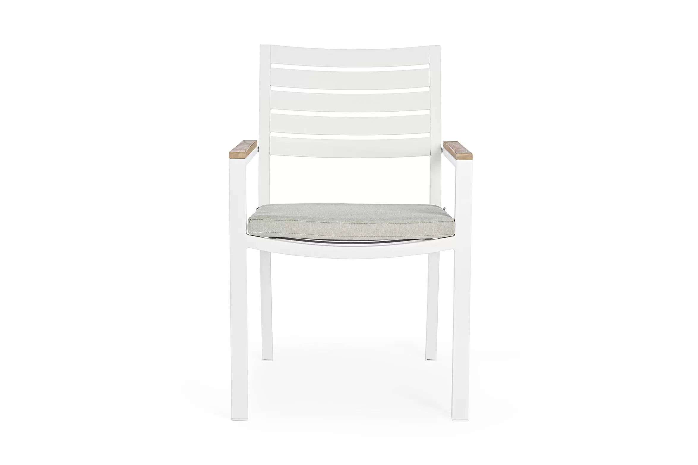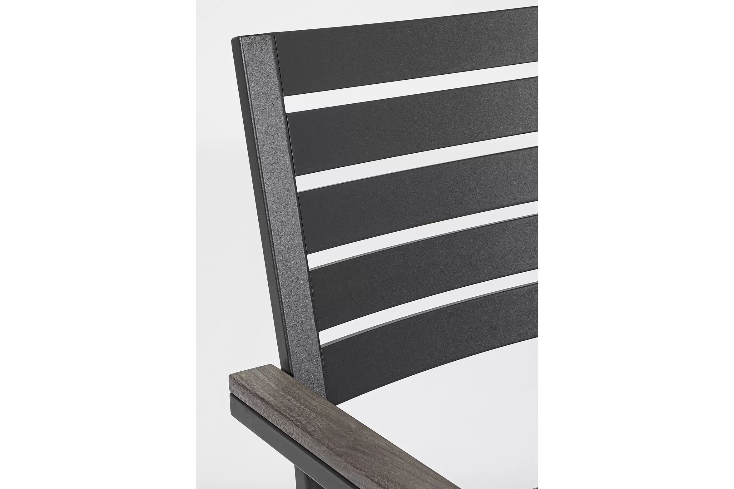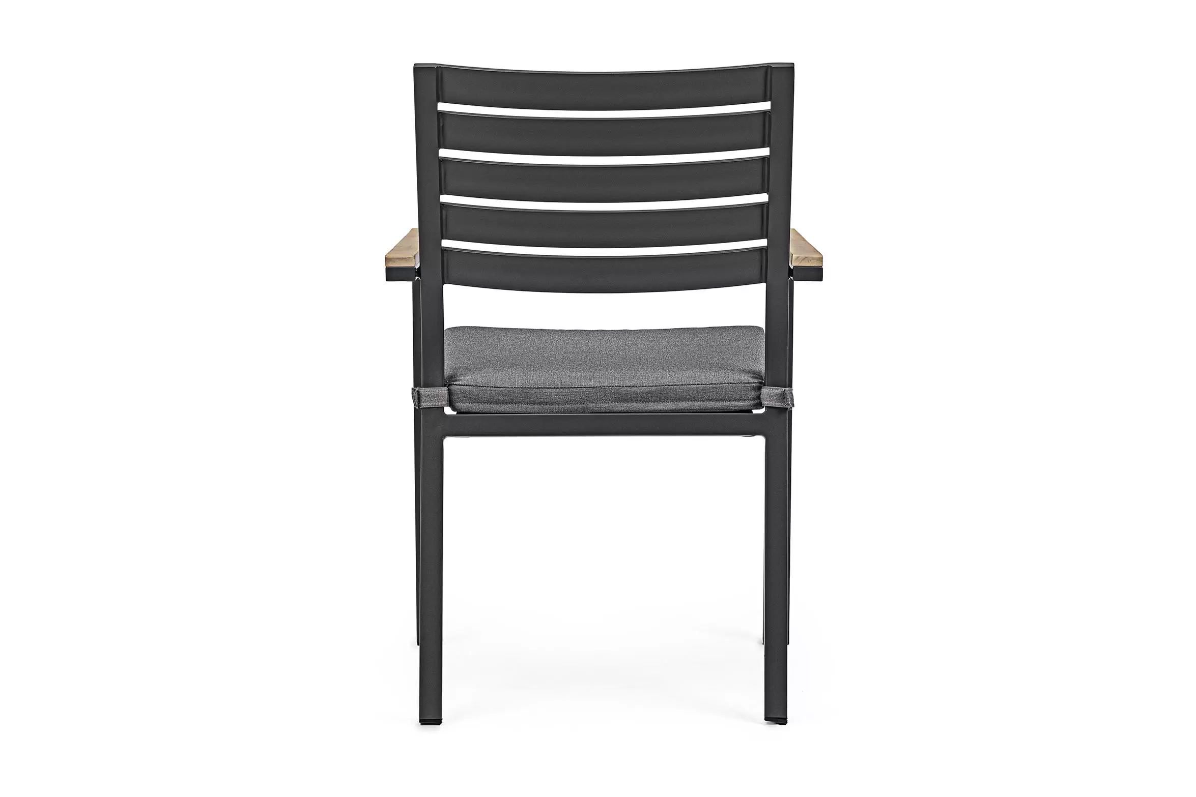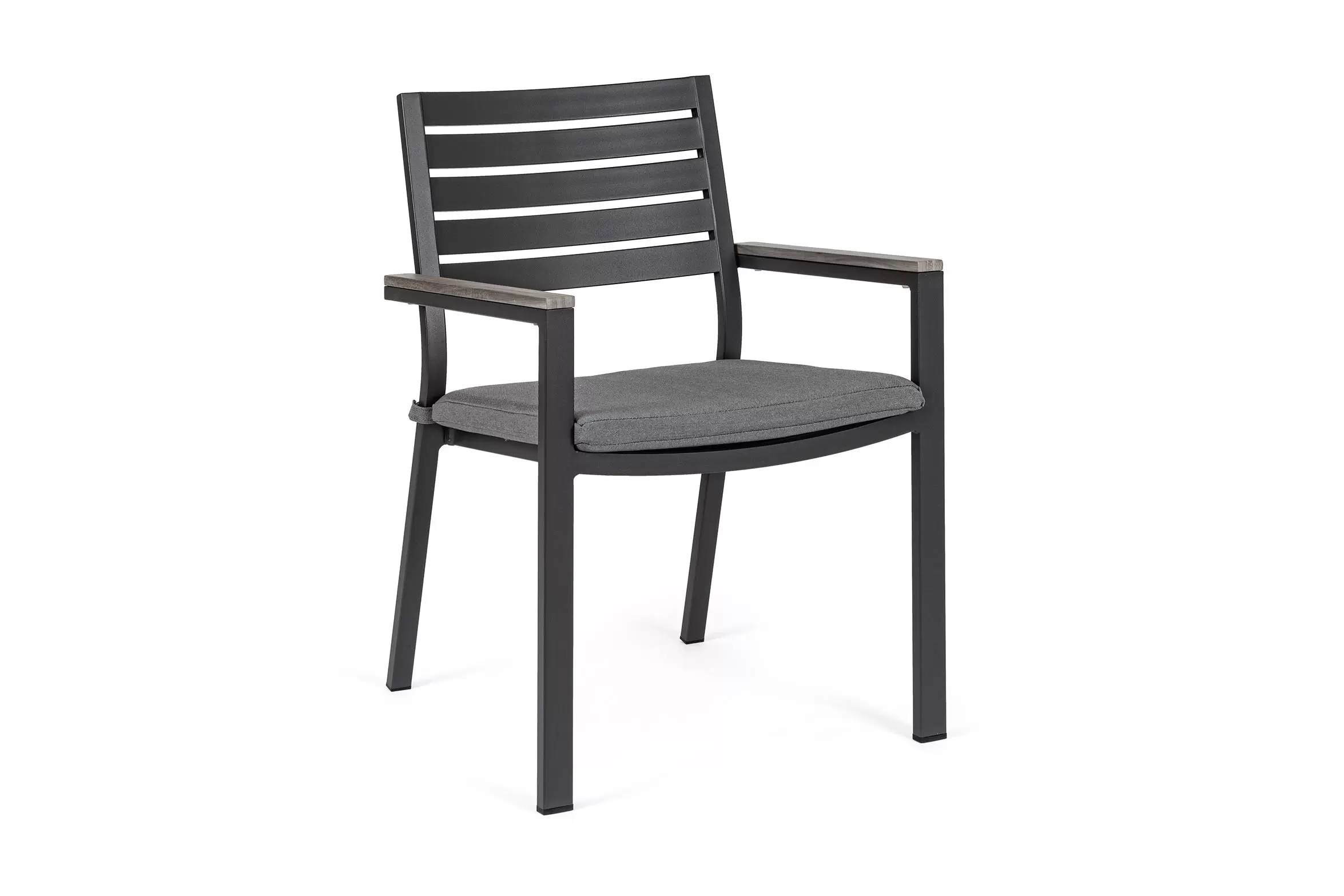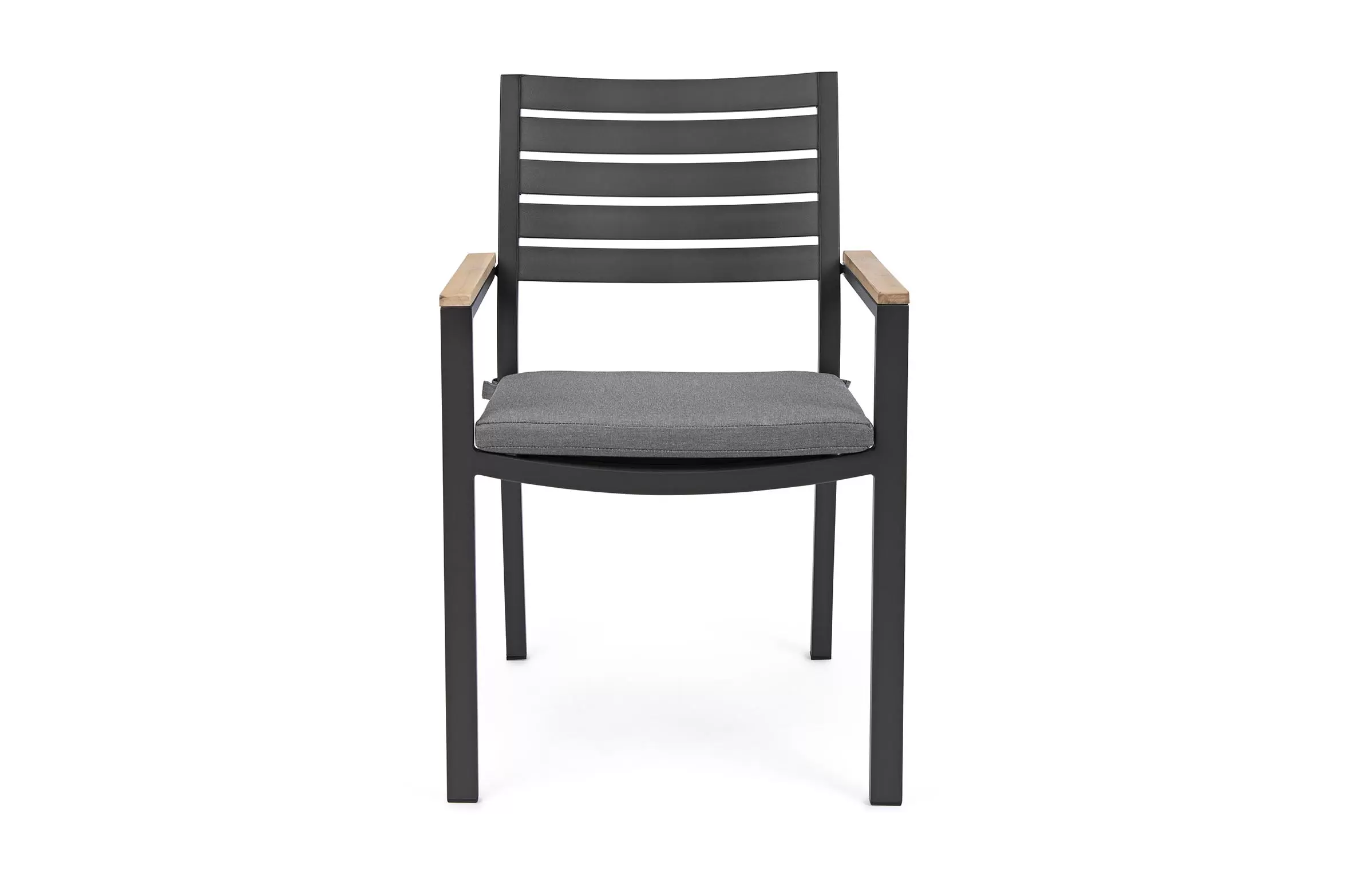 Aluminiowe krzesło ogrodowe z poduszką z podłokietnikami pokrytymi powłoką imitującą drewno.