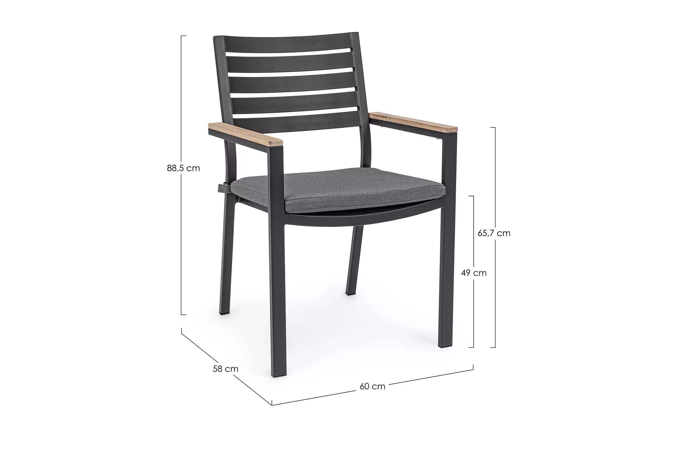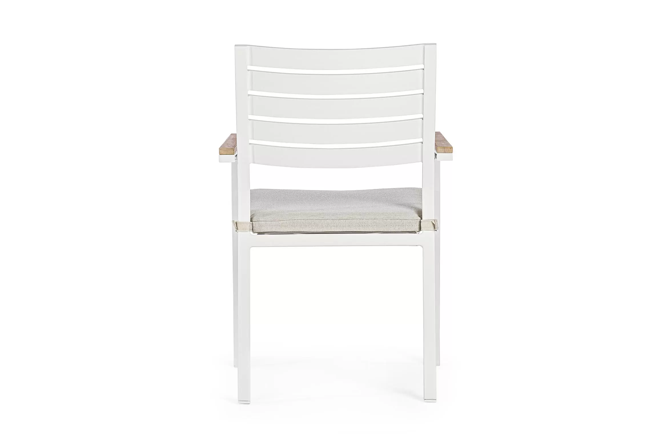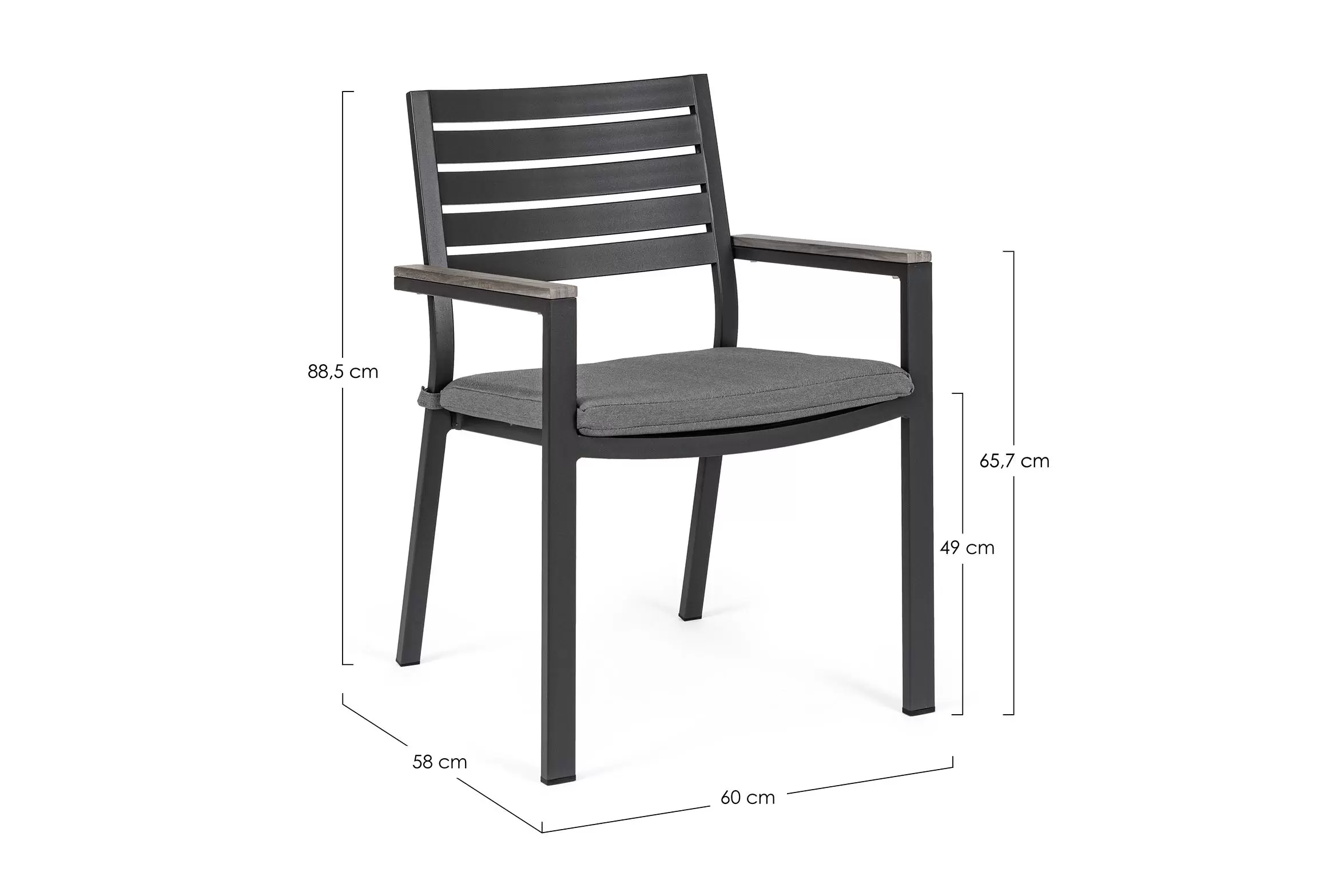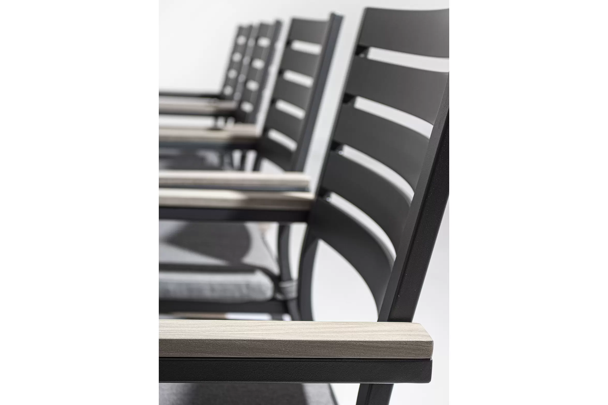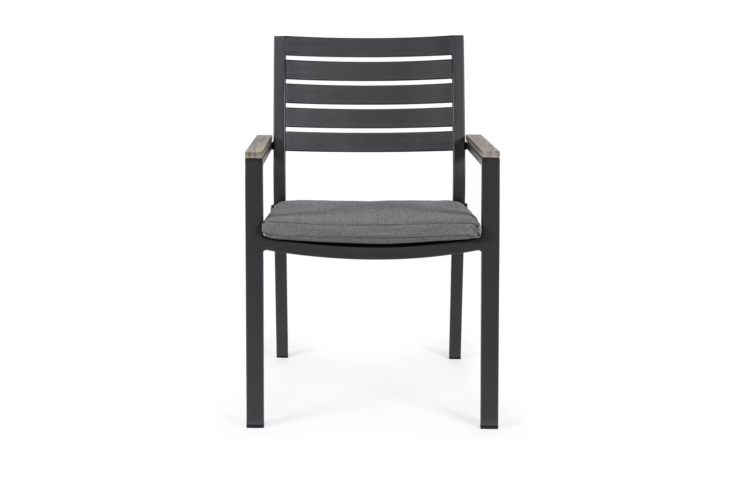 Aluminiowe krzesło ogrodowe z poduszką z podłokietnikami pokrytymi powłoką imitującą drewno.