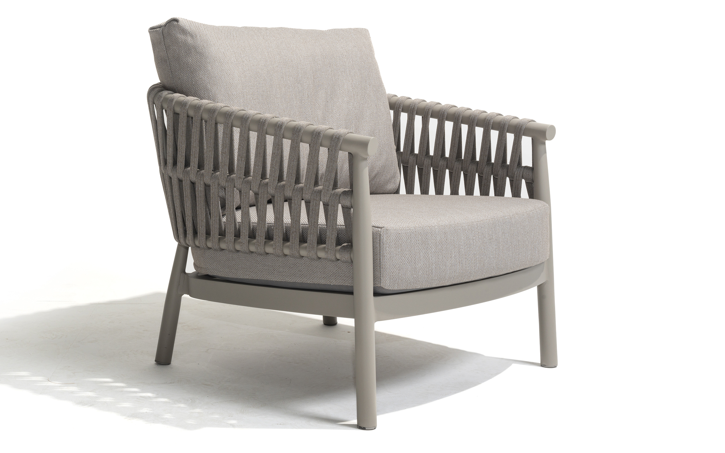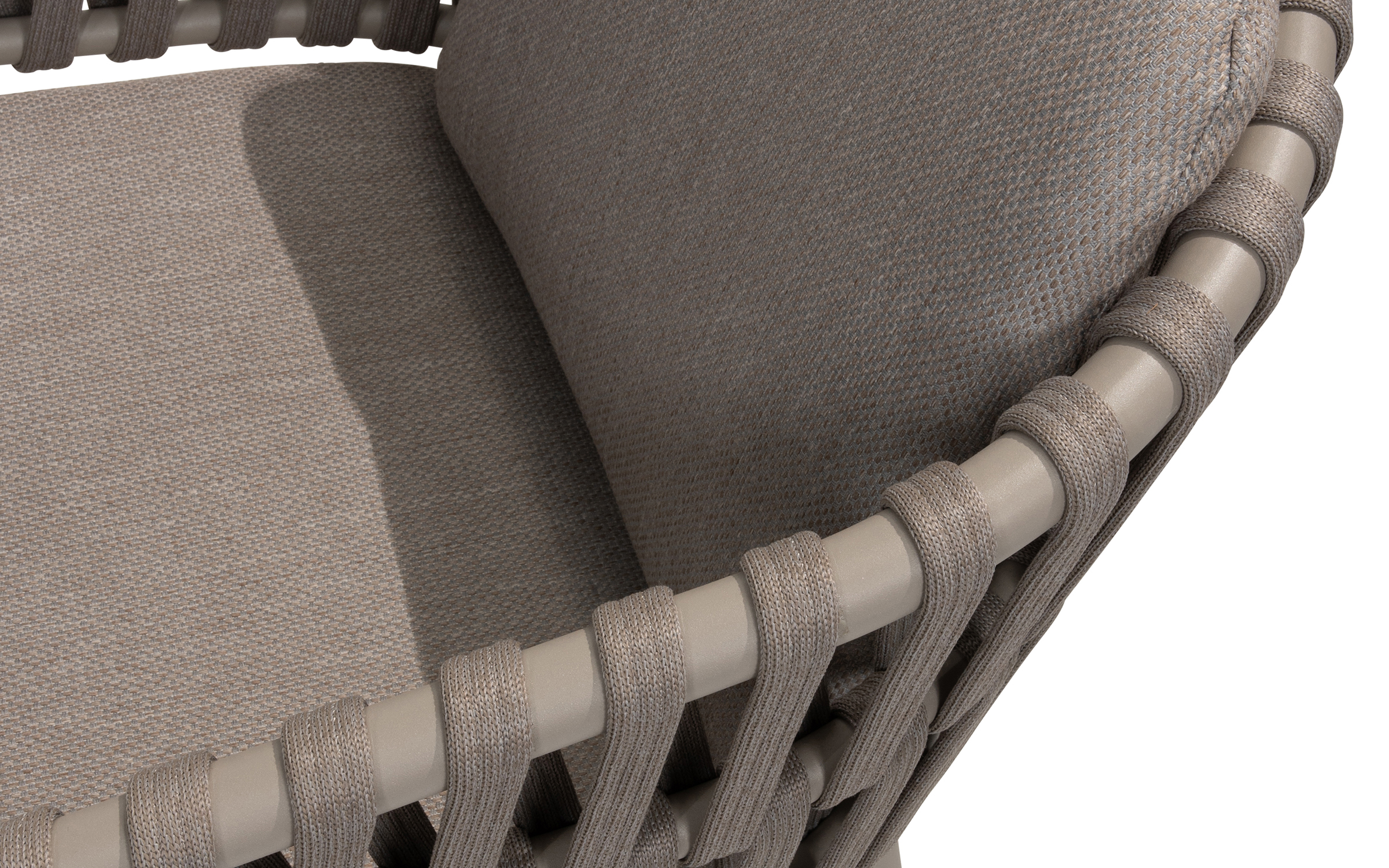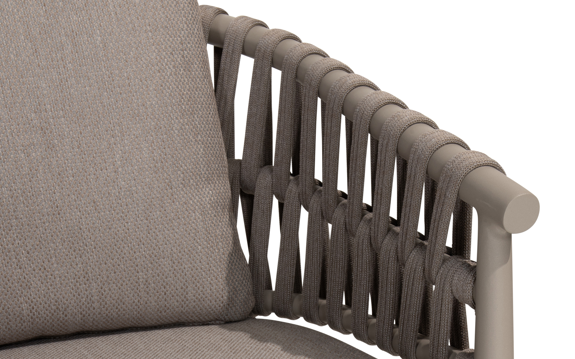 Aluminiowa konstrukcja fotela wypoczynkowego Catalana posiada ochronną warstwę szarej powłoki proszkowej. Konstrukcja tworzy piękne połączenie z szarą linową polipropylenową.
