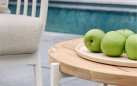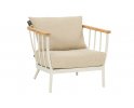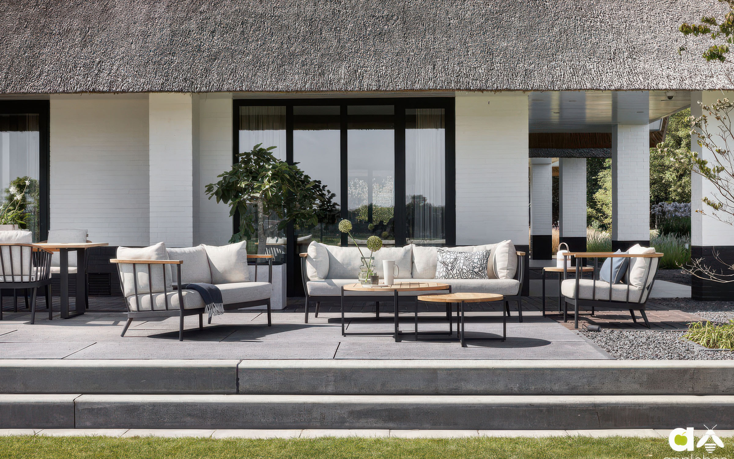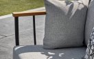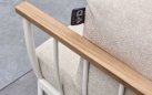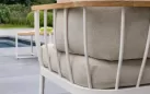 Rama: aluminium malowane proszkowo — lekkie, trwałe i odporne na korozję. Detale: drewno teakowe SVLK — naturalne, odporne na wilgoć i promieniowanie UV. Poduszki: technologia BEE WETT® z poszewkami z tkaniny Olefin — szybkoschnące, odporne na pleśń i blaknięcie. Poszewki zdejmowane, zapinane na zamek.