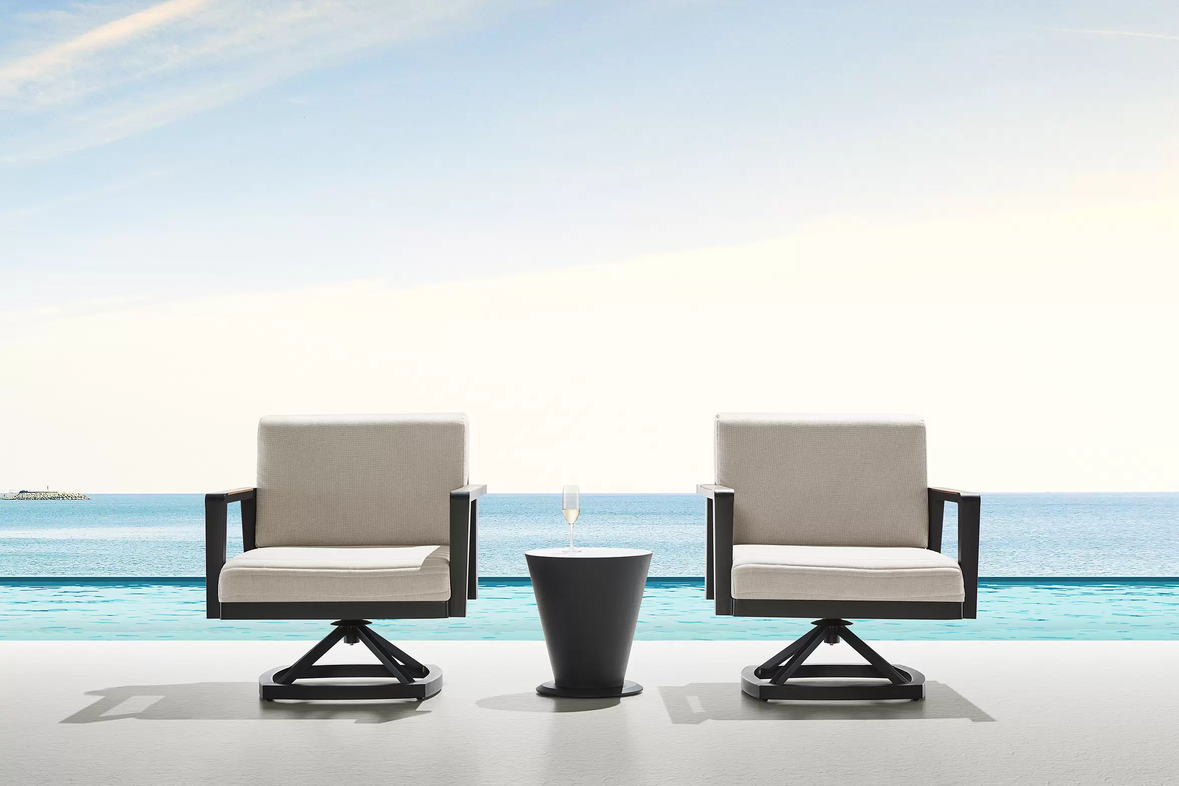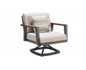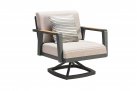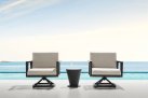Aluminiowy fotel wypoczynkowy z mechanizmem obrotowym na taras firmy HIGOLD w nowoczesnym stylu. Konstrukcja opiera się na spawanej ramie aluminiowej malowanej proszkowo, elementach dekoracyjnych z teaku i wygodnych poduszek beżowych z obiciami z materiału Olefin. Poduszki położone na opinającej siedzisko tekstylinie z wszytą gąbką.