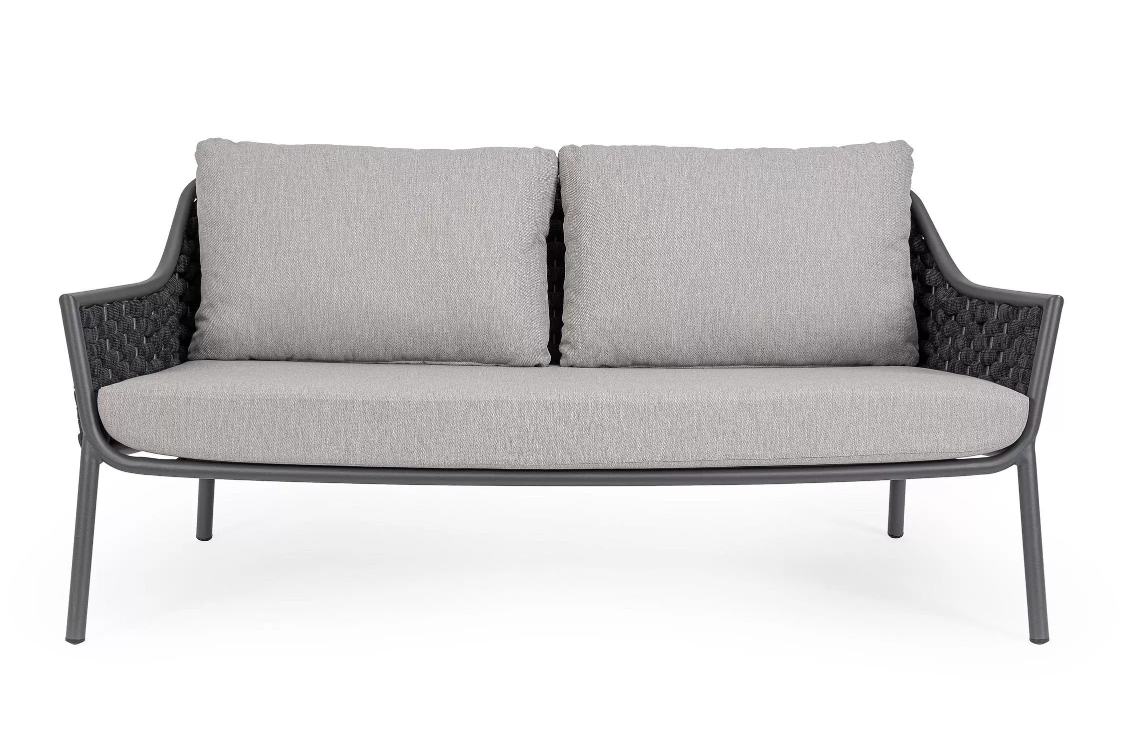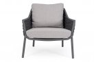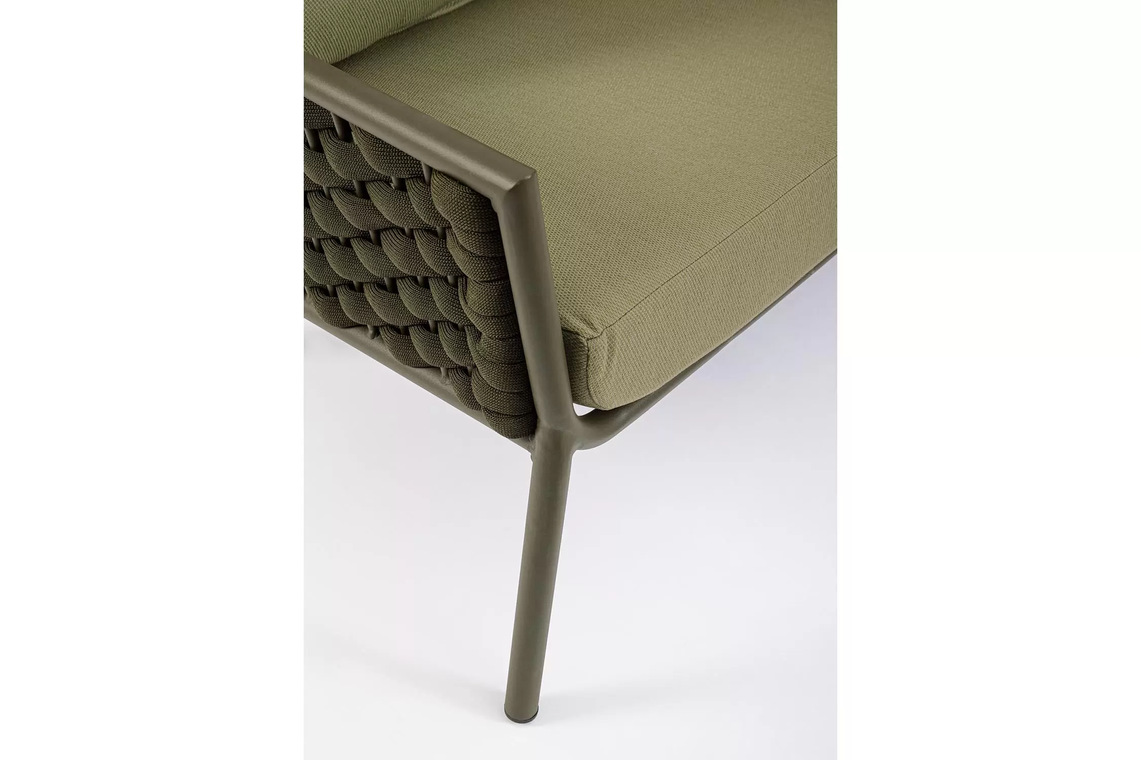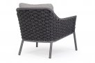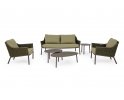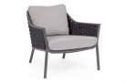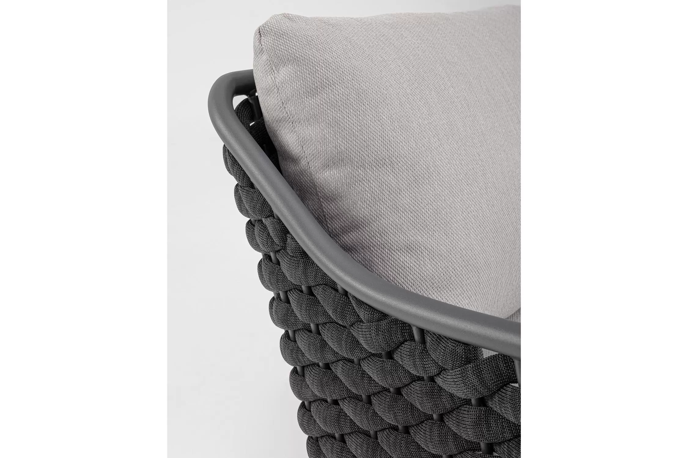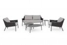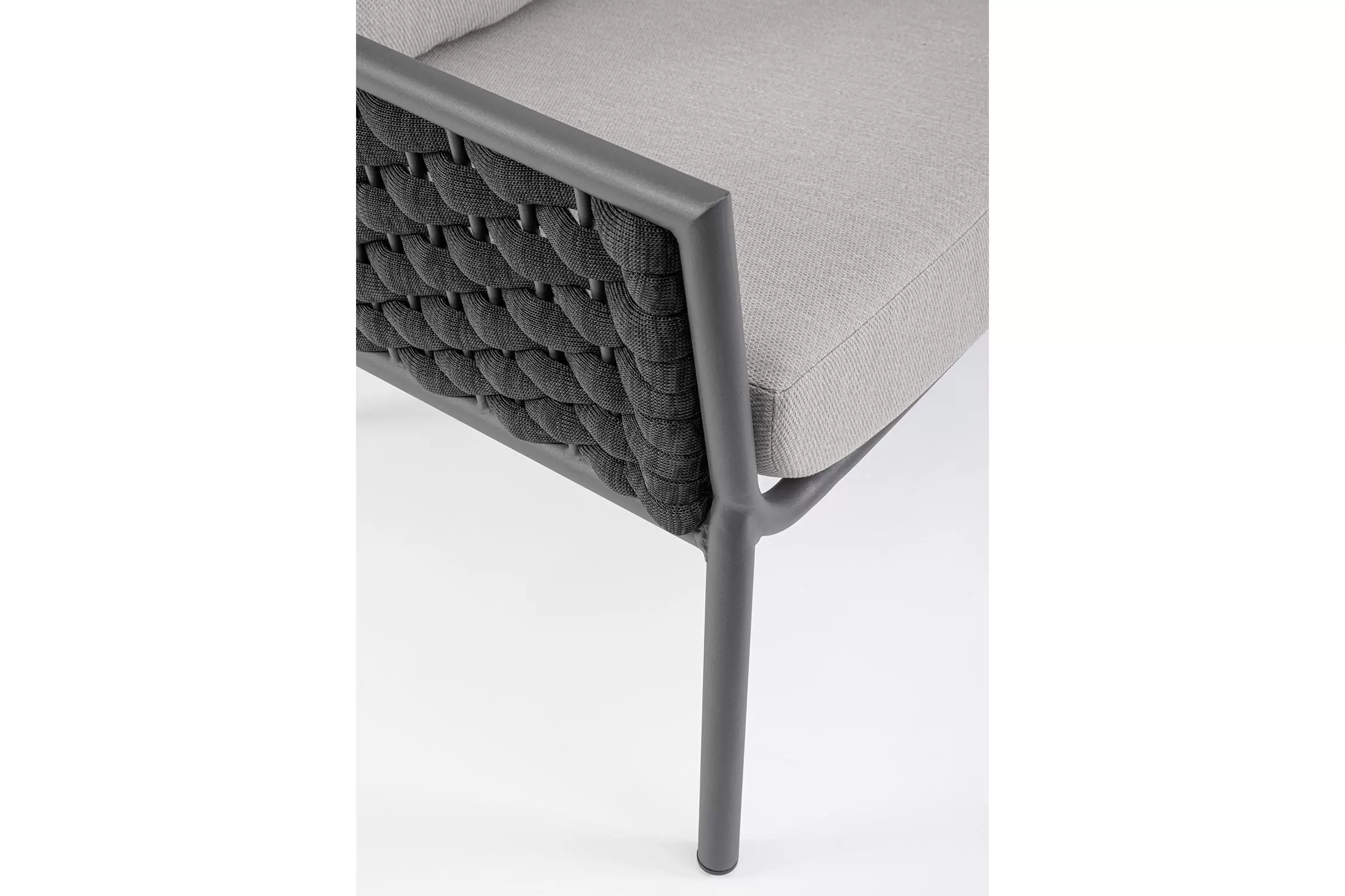 Meble ogrodowe wypoczynkowe na taras w oryginalnym i co najważniejsze odpornym na warunki atmosferyczne wykonaniu. Okrągły profil podłokietników, wygodne oparcie oraz siedzisko z wygodnymi poduszkami zostało wykonane z wodoodpornej tkaniny Olefin. Materiał, która jest barwioną na wskroś tkaniną akrylową odporną na zabrudzenia, jest również odporna na działanie wody i pleśni. Ciekawą formą urozmaicenia budowy mebli ogrodowych jest zastosowanie warkoczowego splotu po bokach i z tyłu stelaża. Stelaż kompletu mebli ogrodowych wykonano z aluminium w malowaniu proszkowym. Wypełnienie poduszek z wysokiej jakości szybkoschnącej pianki tapicerskiej Quick Dry Foam o właściwościach antybakteryjnych. Wytrzymałość materiałów, a także odporność na korozję, umożliwiają zastosowanie zarówno w domu jak i na zewnątrz - w ogrodzie lub na tarasie. Meble należy czyścić nie wykorzystując silnych środków chemicznych.