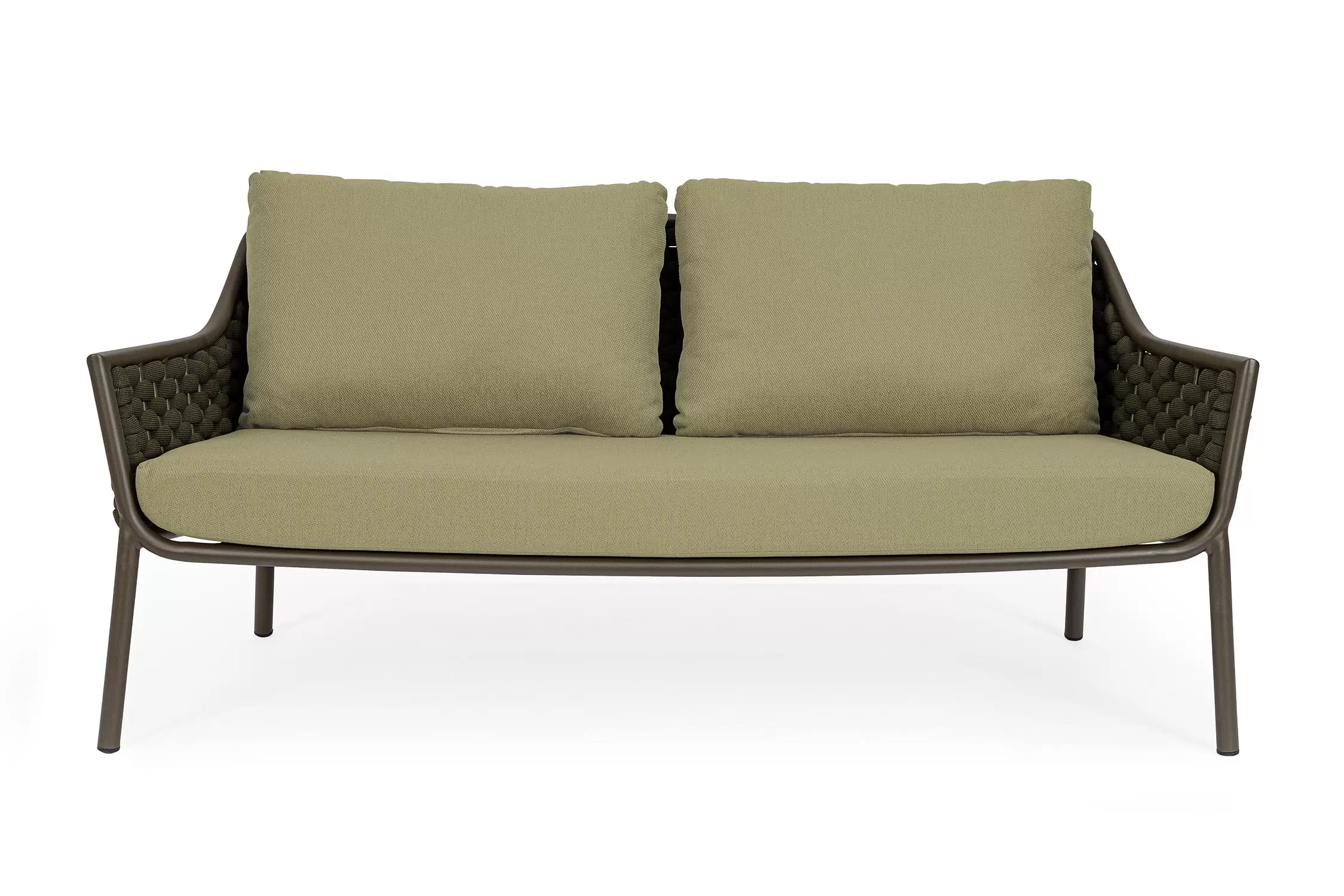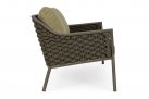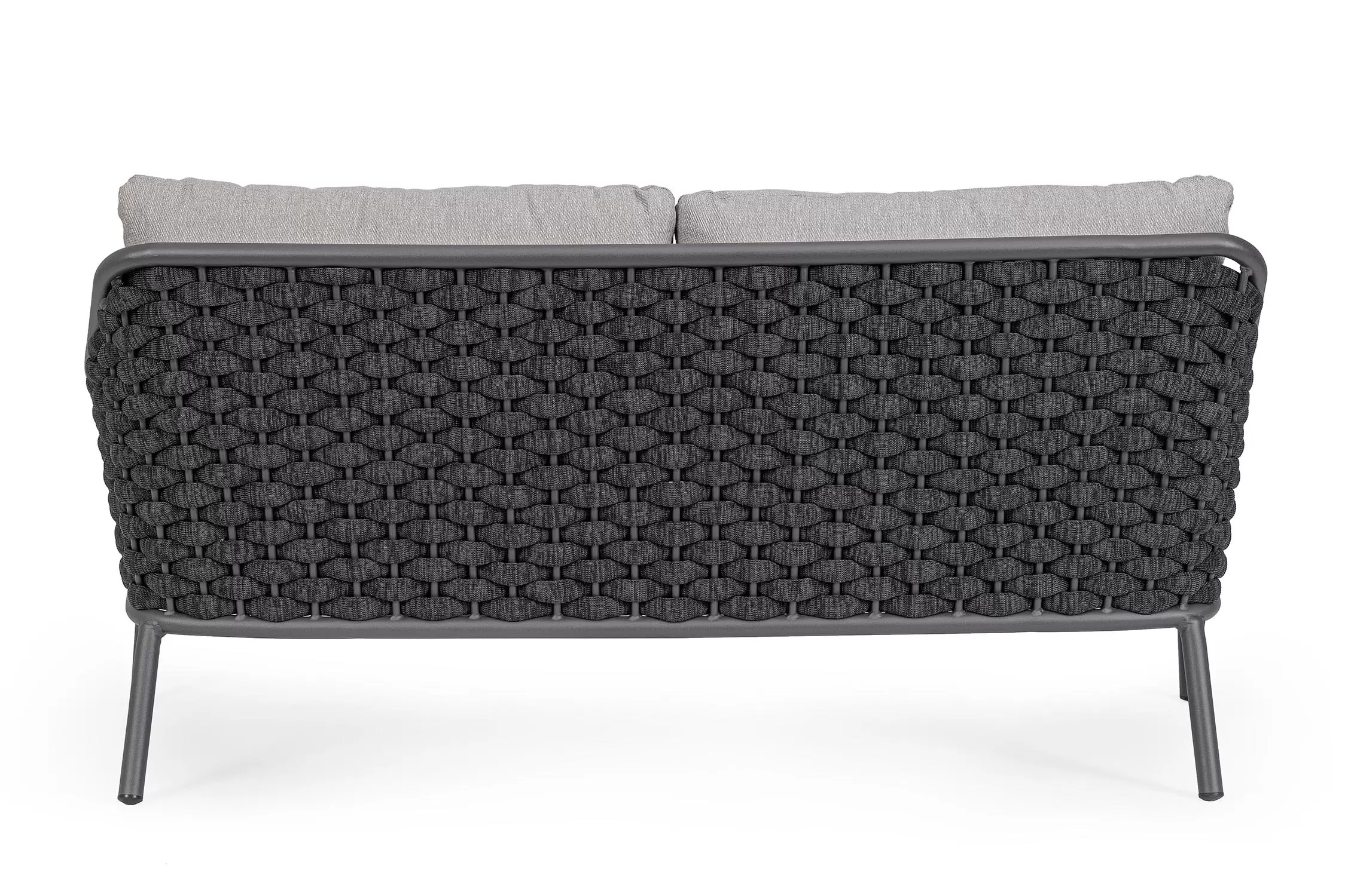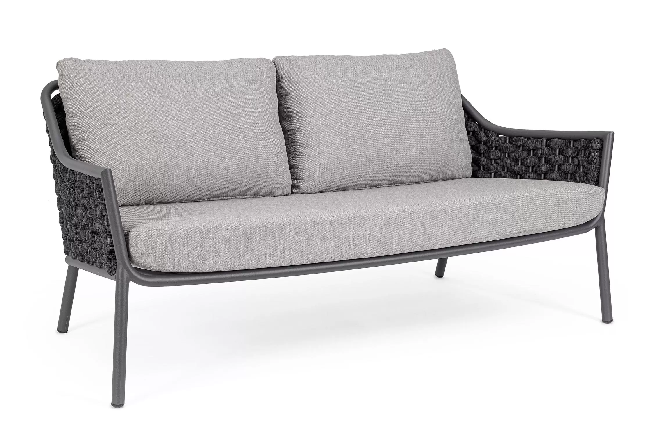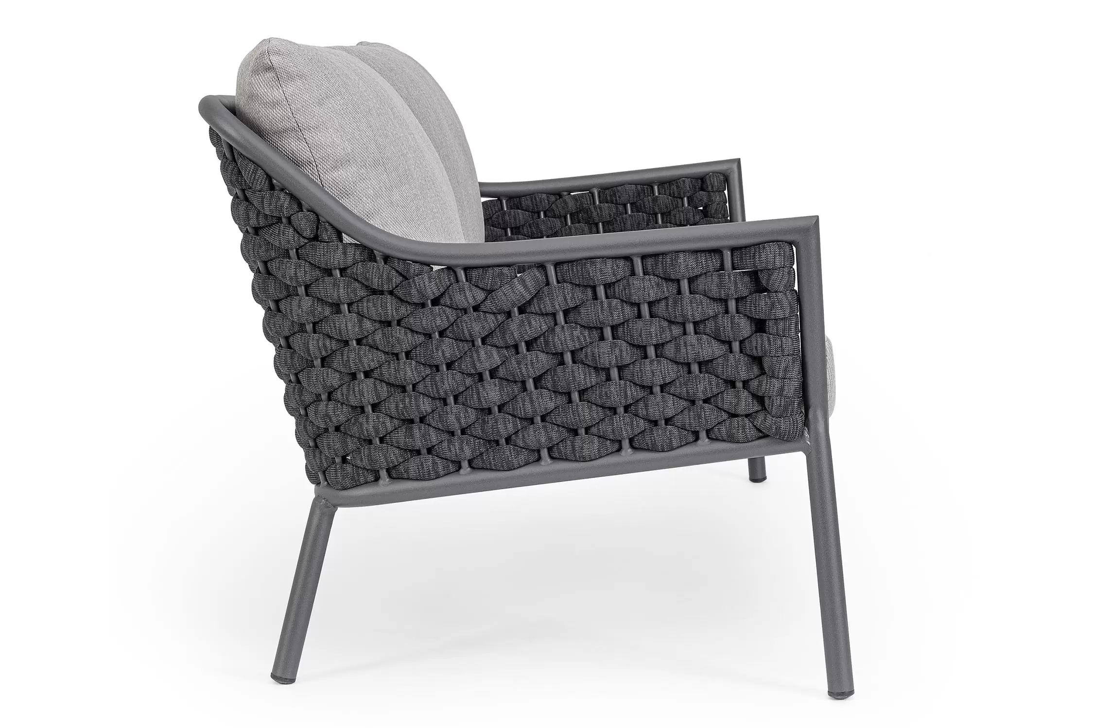 Meble ogrodowe wypoczynkowe na taras w oryginalnym i co najważniejsze odpornym na warunki atmosferyczne wykonaniu. Okrągły profil podłokietników, wygodne oparcie oraz siedzisko z wygodnymi poduszkami zostało wykonane z wodoodpornej tkaniny Olefin. Materiał, która jest barwioną na wskroś tkaniną akrylową odporną na zabrudzenia, jest również odporna na działanie wody i pleśni. Ciekawą formą urozmaicenia budowy mebli ogrodowych jest zastosowanie warkoczowego splotu po bokach i z tyłu stelaża. Stelaż kompletu mebli ogrodowych wykonano z aluminium w malowaniu proszkowym. Wypełnienie poduszek z wysokiej jakości szybkoschnącej pianki tapicerskiej Quick Dry Foam o właściwościach antybakteryjnych. Wytrzymałość materiałów, a także odporność na korozję, umożliwiają zastosowanie zarówno w domu jak i na zewnątrz - w ogrodzie lub na tarasie. Meble należy czyścić nie wykorzystując silnych środków chemicznych.