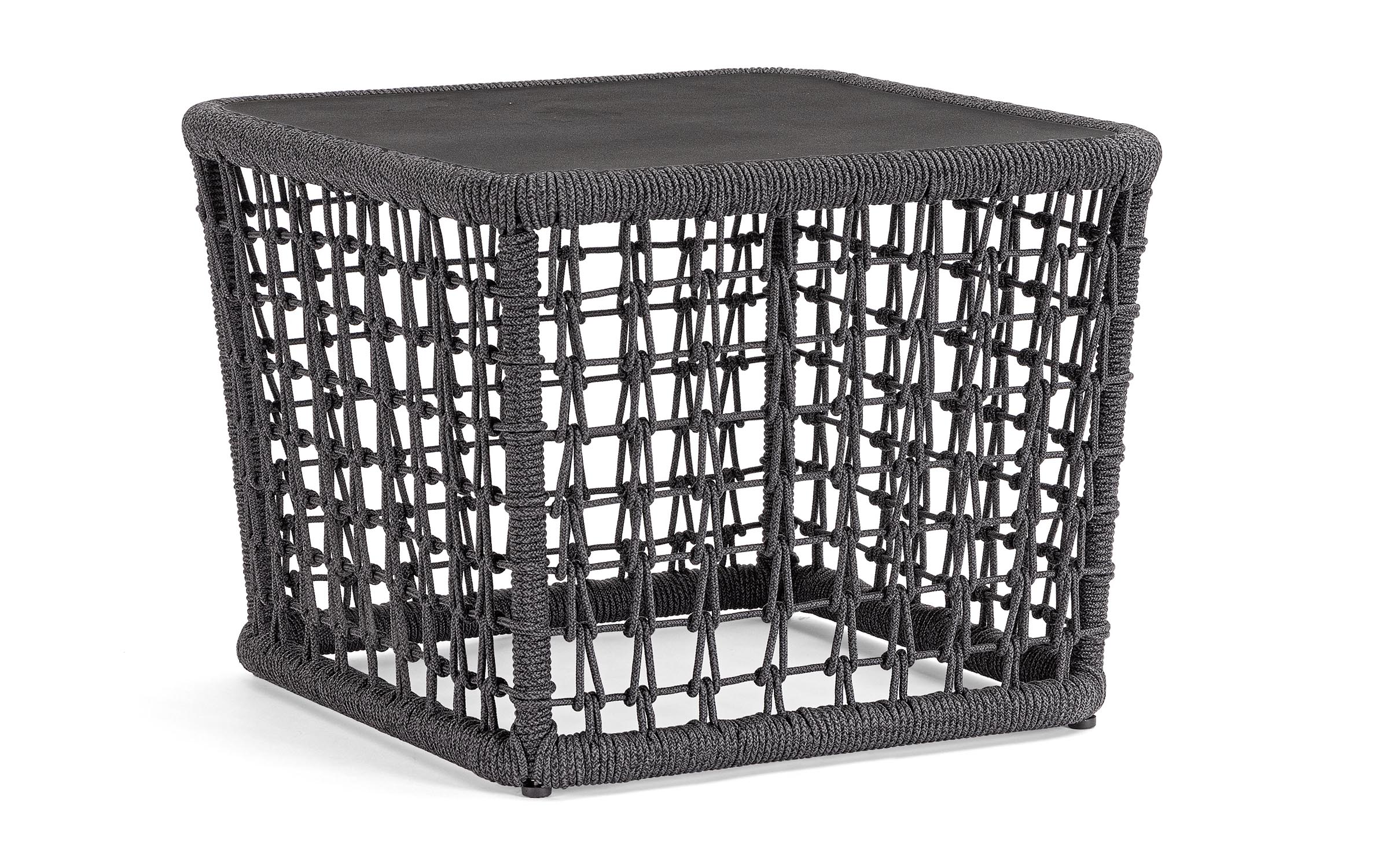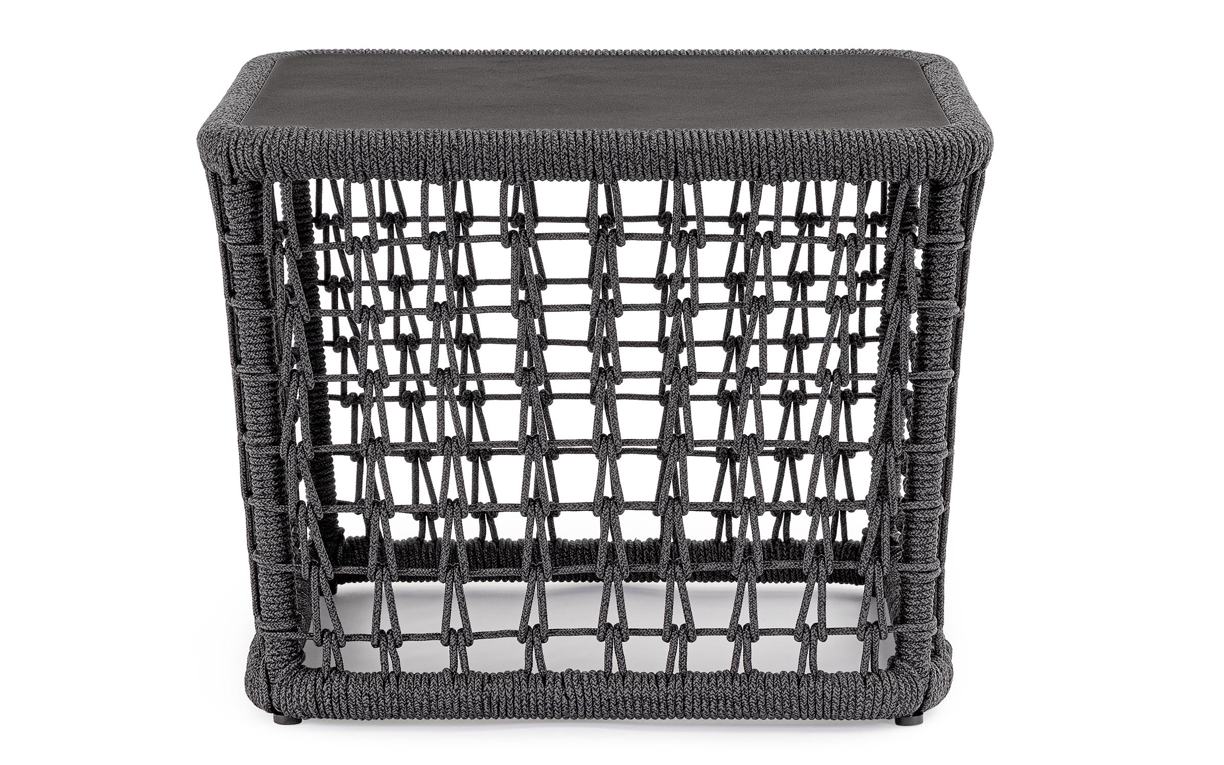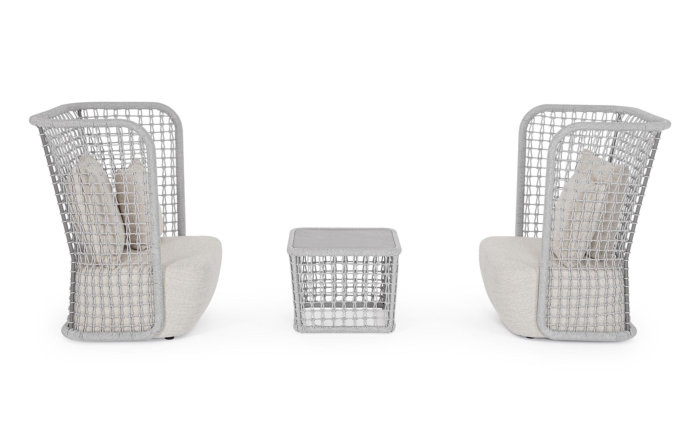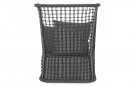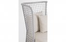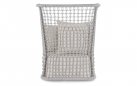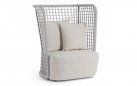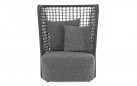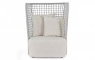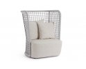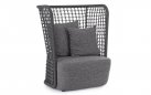 Wysoki fotel ogrodowy z bardzo gruba poduszką siedziska i jaśkami na oparciu. Niespotykany styl wyznacza wysokie oparcie z plecionką z liny polipropylenowej.