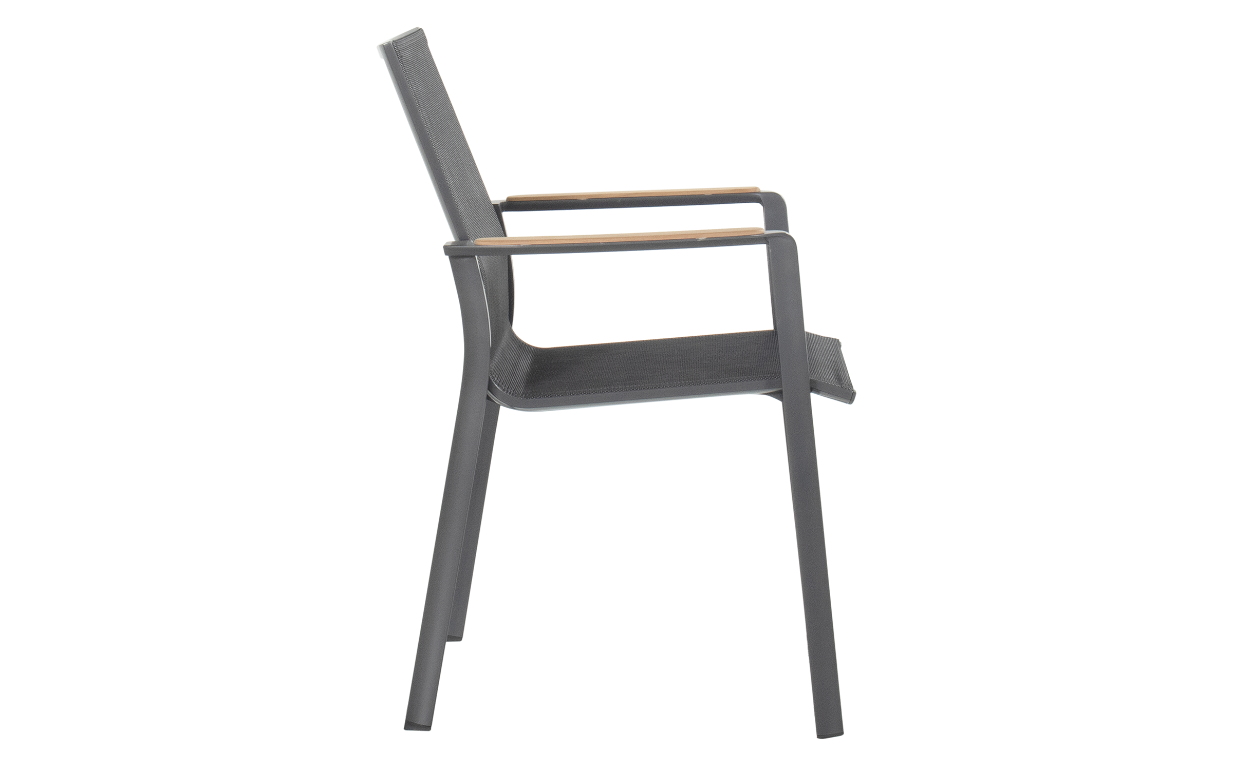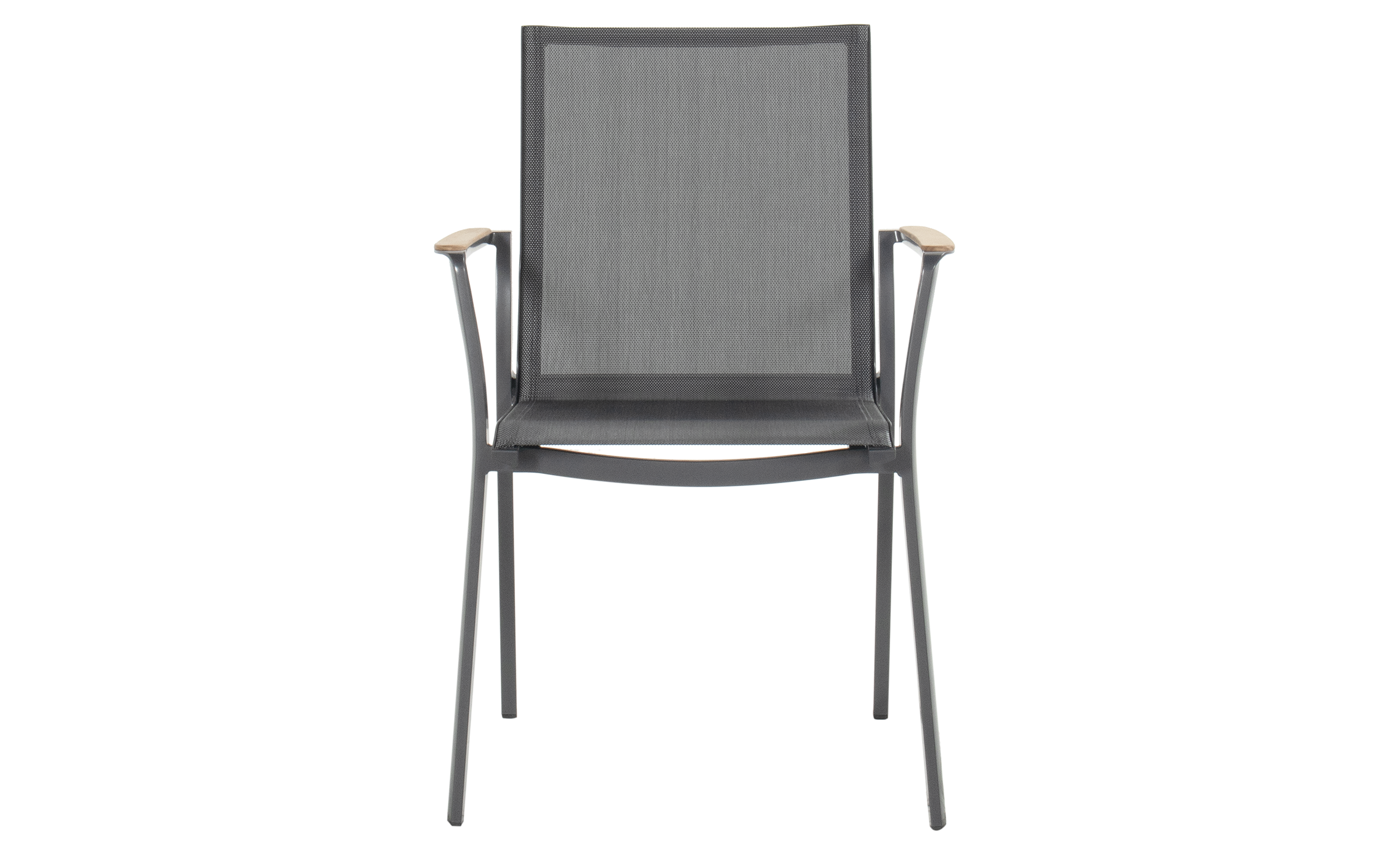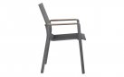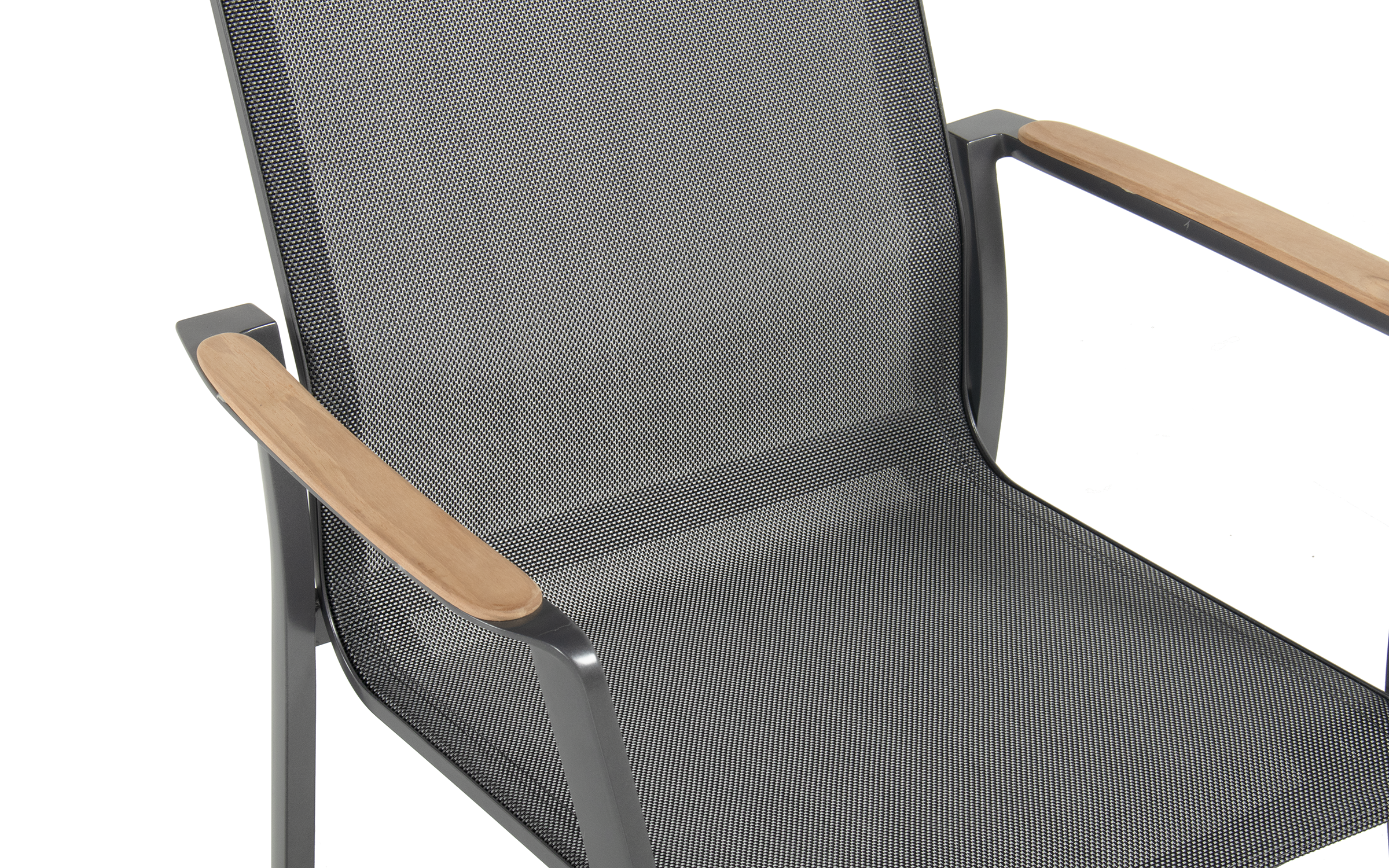Konstrukcja z aluminium, siedzisko i oparcie z tekstyliny, podłokietniki z certyfikowanego drewna teak. Materiały odporne na wilgoć, promieniowanie UV i zabrudzenia. Łatwe w pielęgnacji, nie wymagają impregnacji.