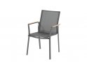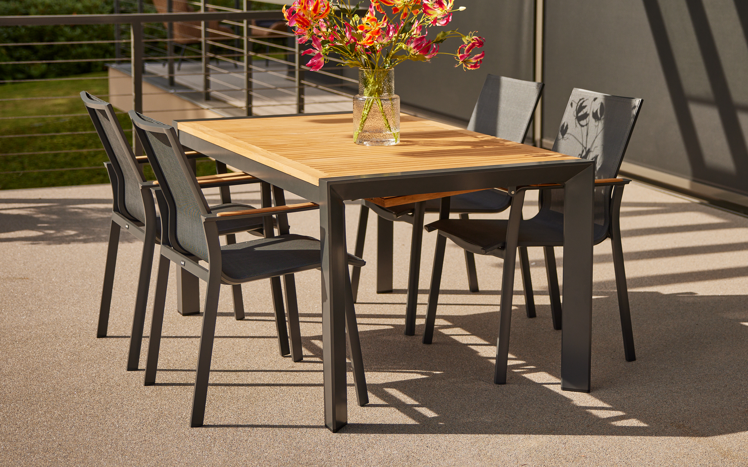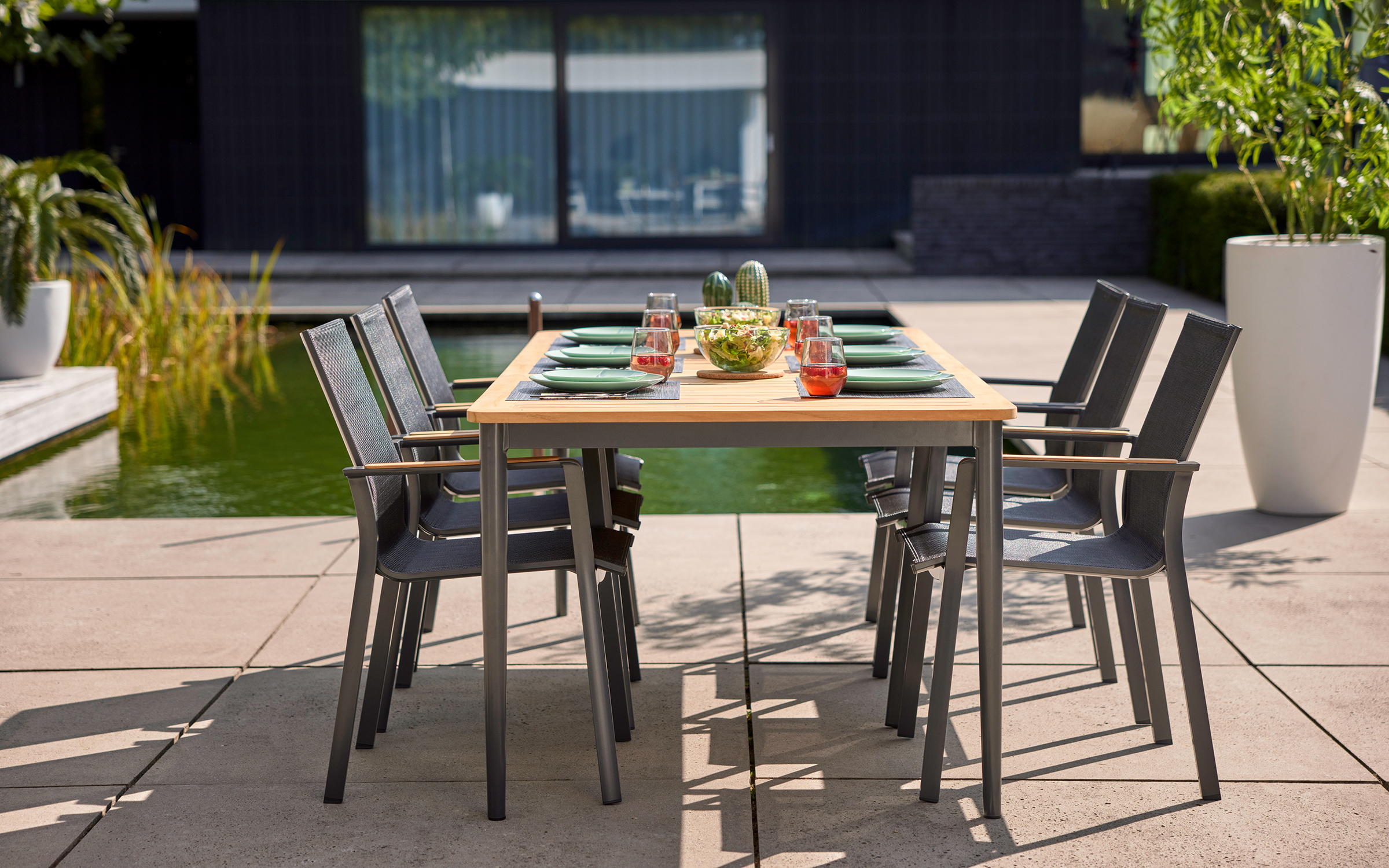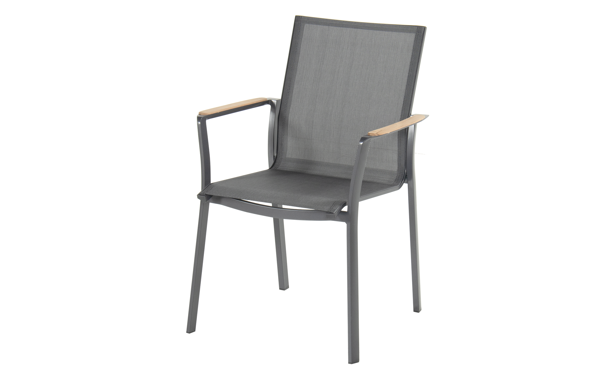 Konstrukcja z aluminium, siedzisko i oparcie z tekstyliny, podłokietniki z certyfikowanego drewna teak. Materiały odporne na wilgoć, promieniowanie UV i zabrudzenia. Łatwe w pielęgnacji, nie wymagają impregnacji.