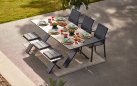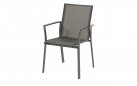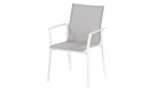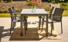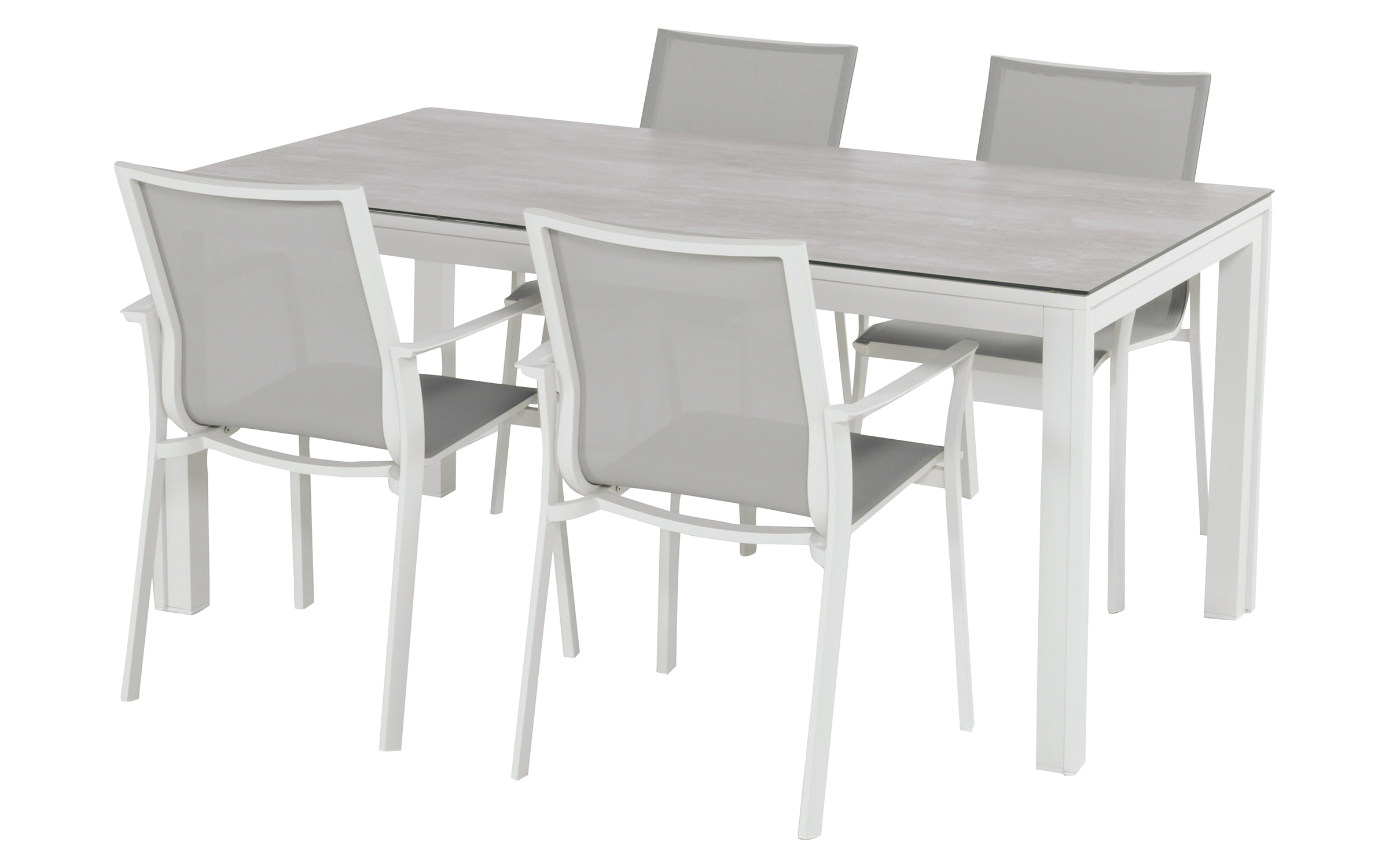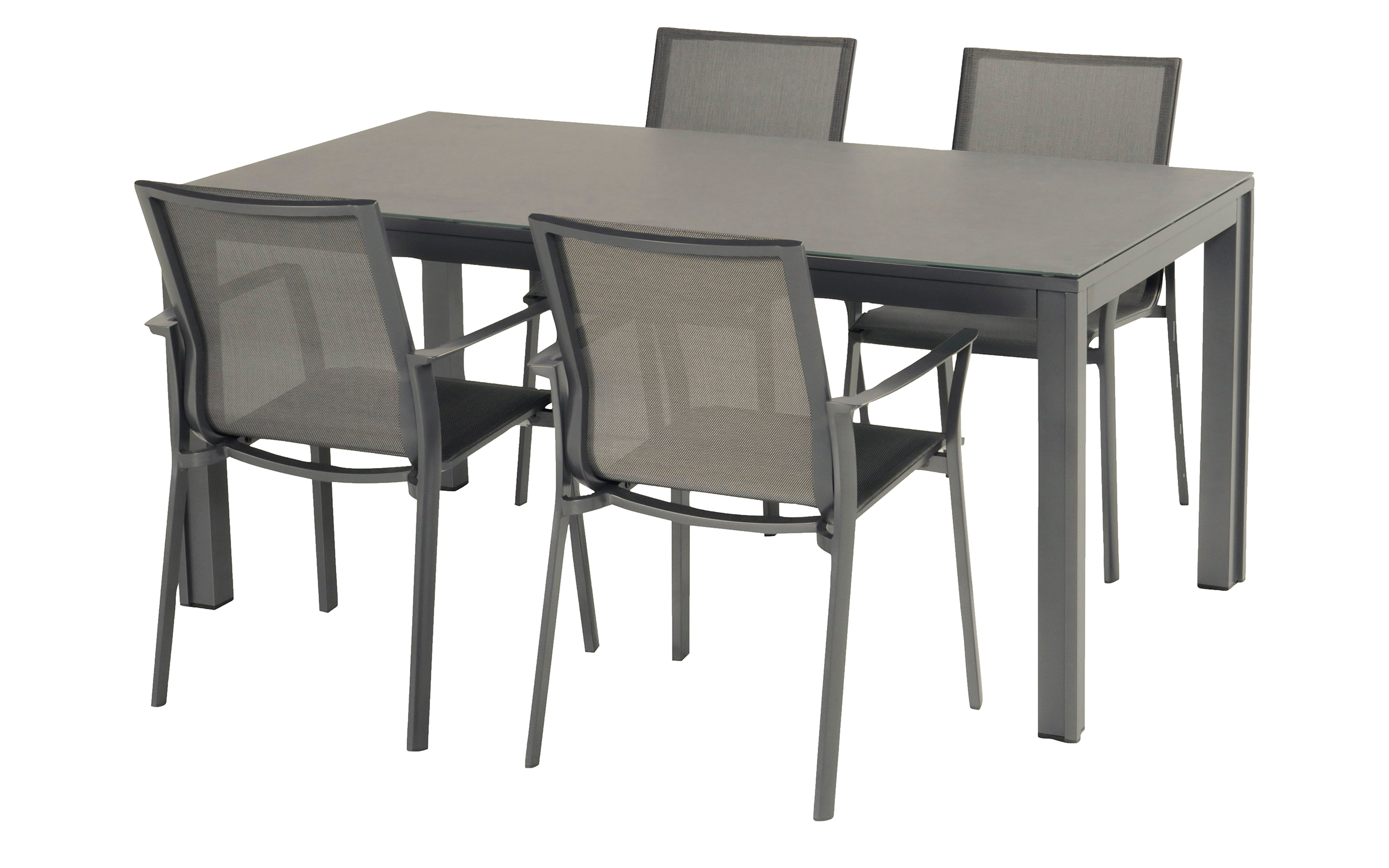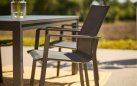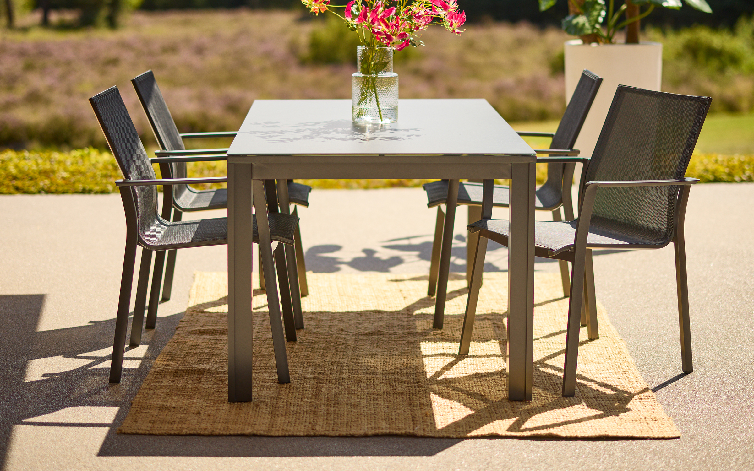 Konstrukcja z aluminium, siedzisko i oparcie z tekstyliny, podłokietniki z aluminium. Materiały odporne na wilgoć, promieniowanie UV i zabrudzenia. Łatwe w pielęgnacji, nie wymagają impregnacji.