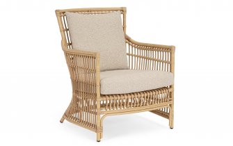 Klasyczny w formie fotel ogrodowy wykonany z nowoczesnych materiałów. Aluminiowe profile malowane proszkowo z technologią sublimacji tworzące powłokę imitująca naturalny rattan. Taka powłoka jest odporna na warunki atmosferyczne i UV.