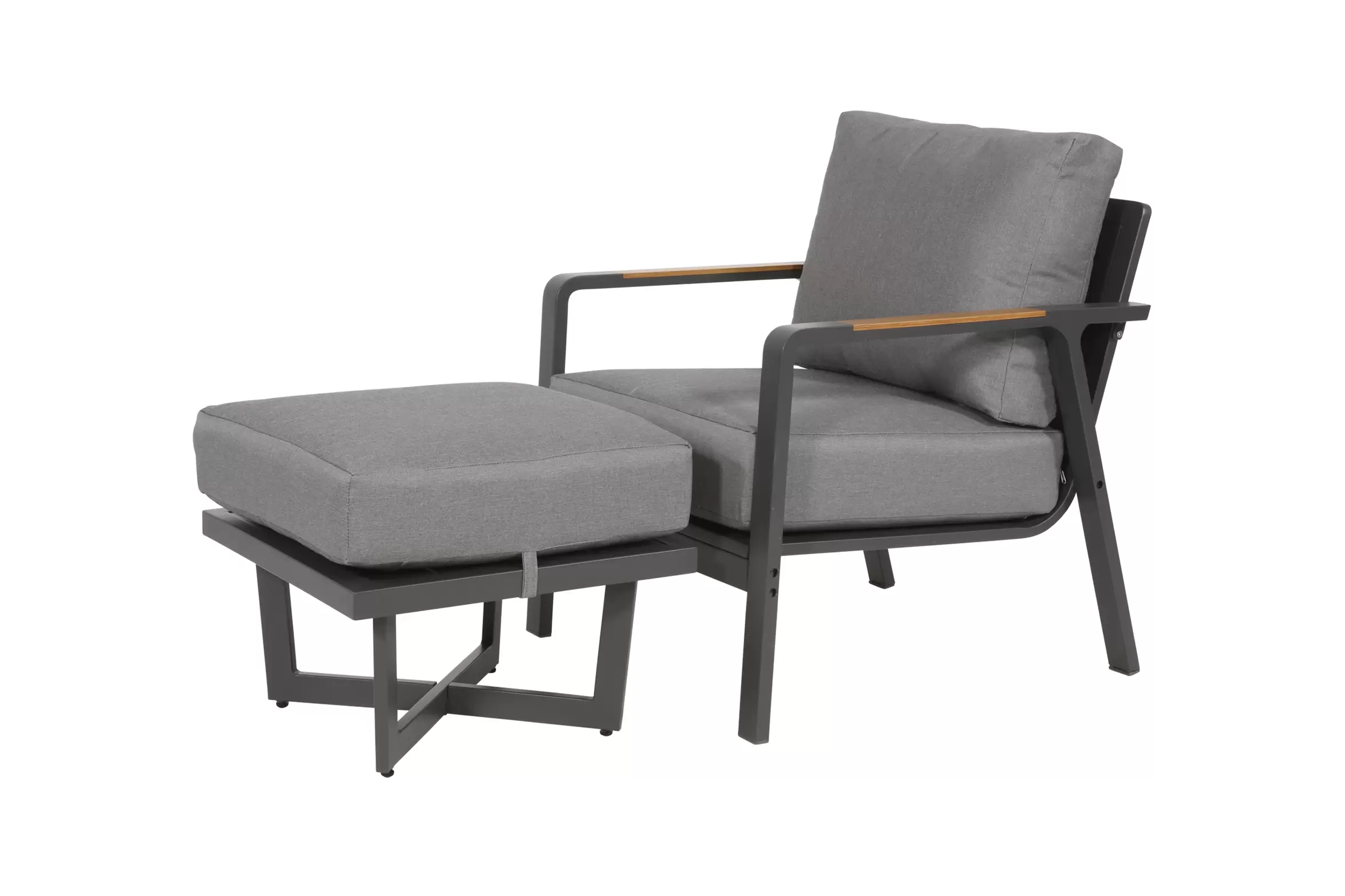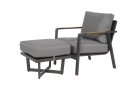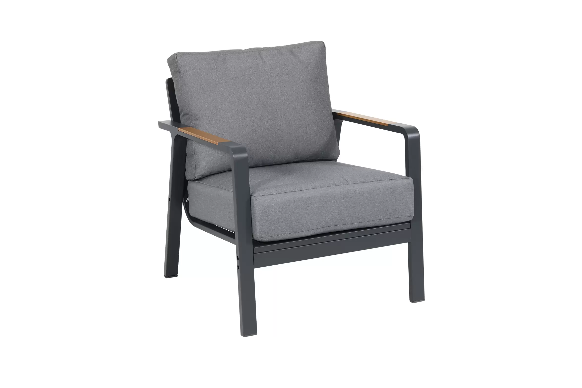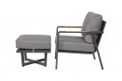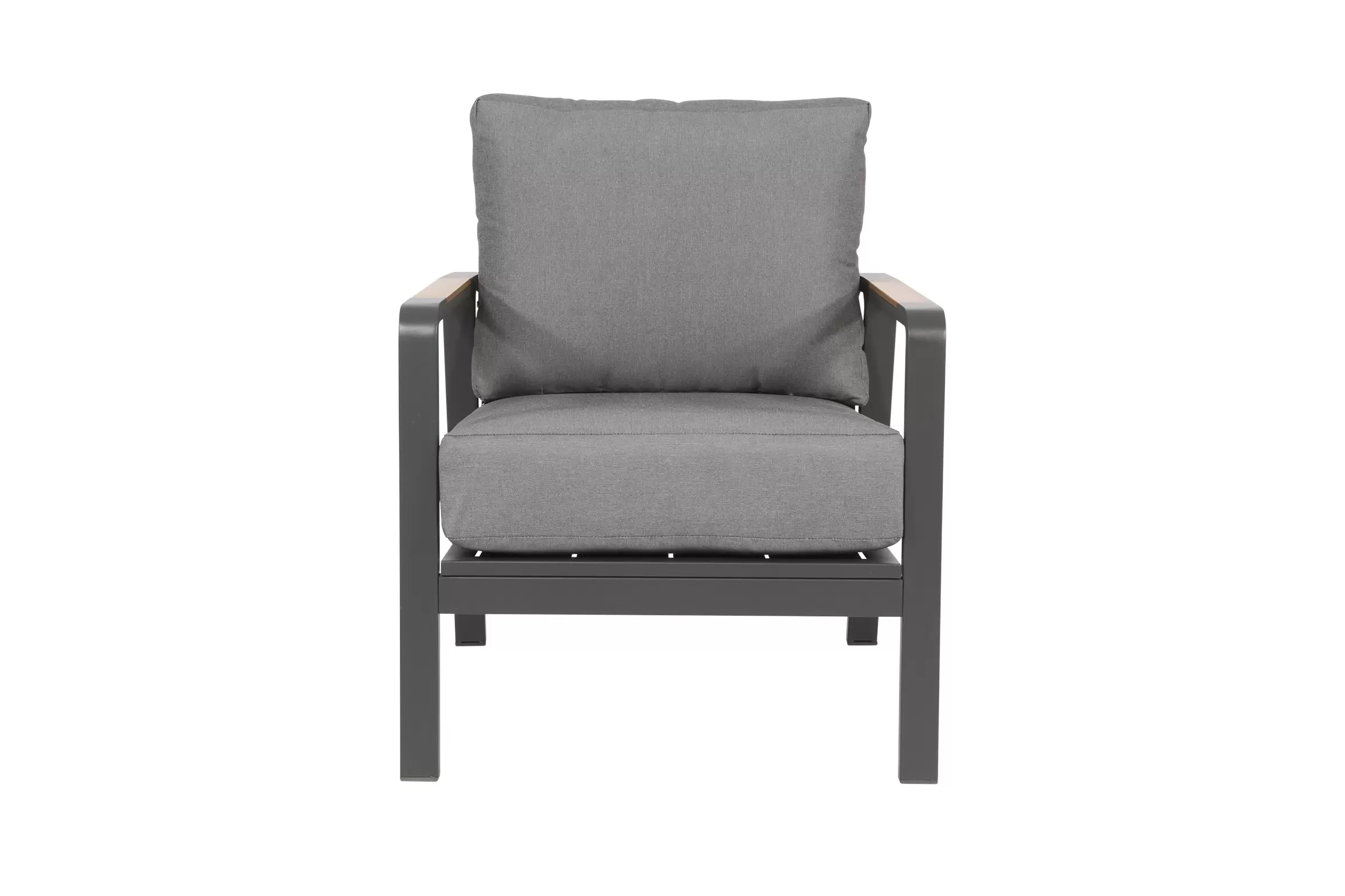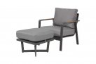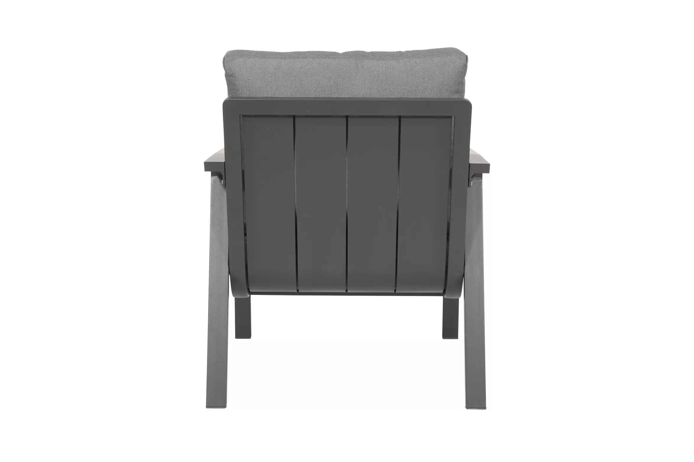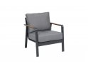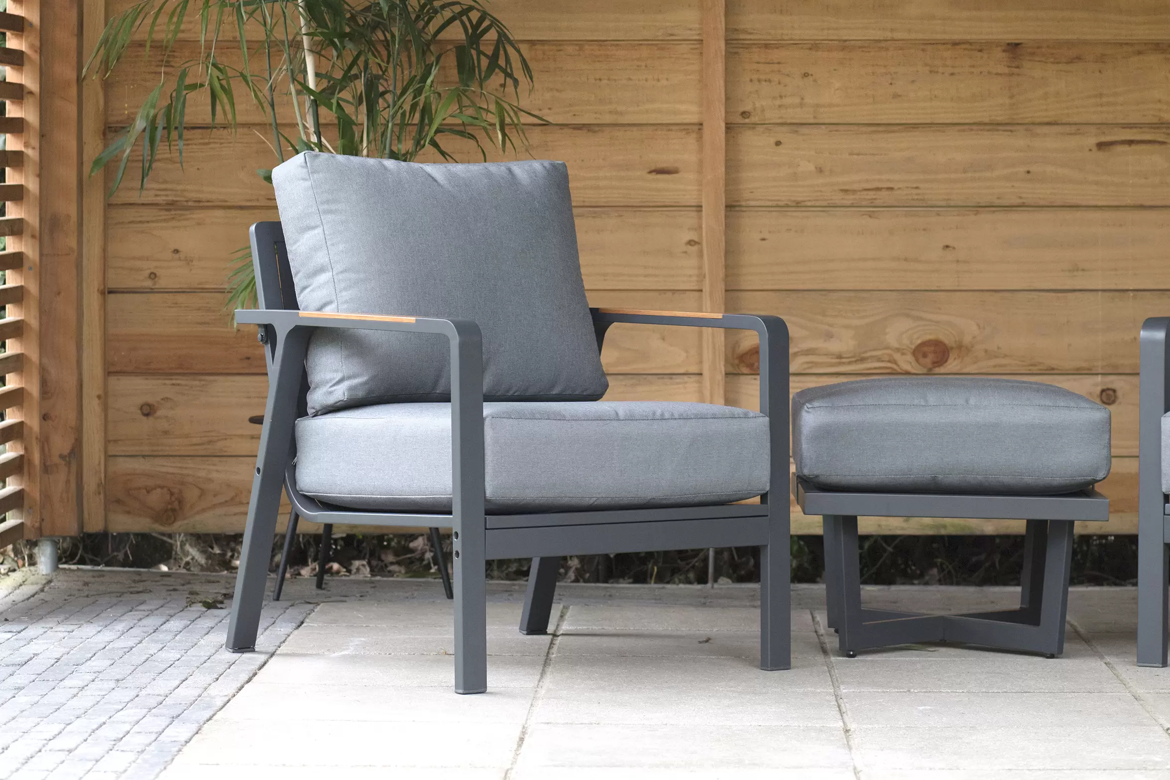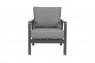 Nowoczesny fotel wypoczynkowy o aluminiowej konstrukcji z grubymi wygodnymi poduszkami wodoodpornymi z poszewkami z materiału Olefin.