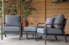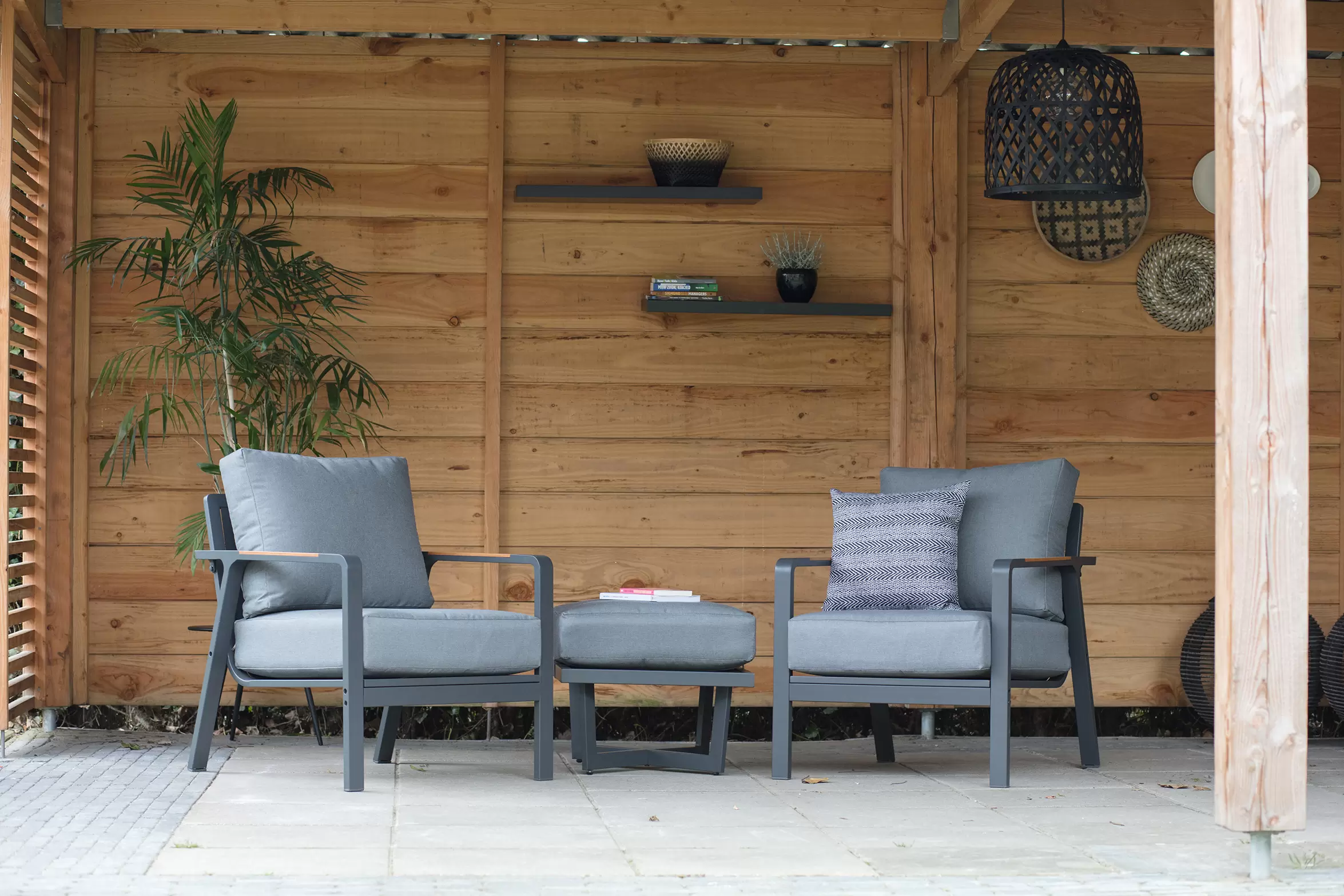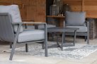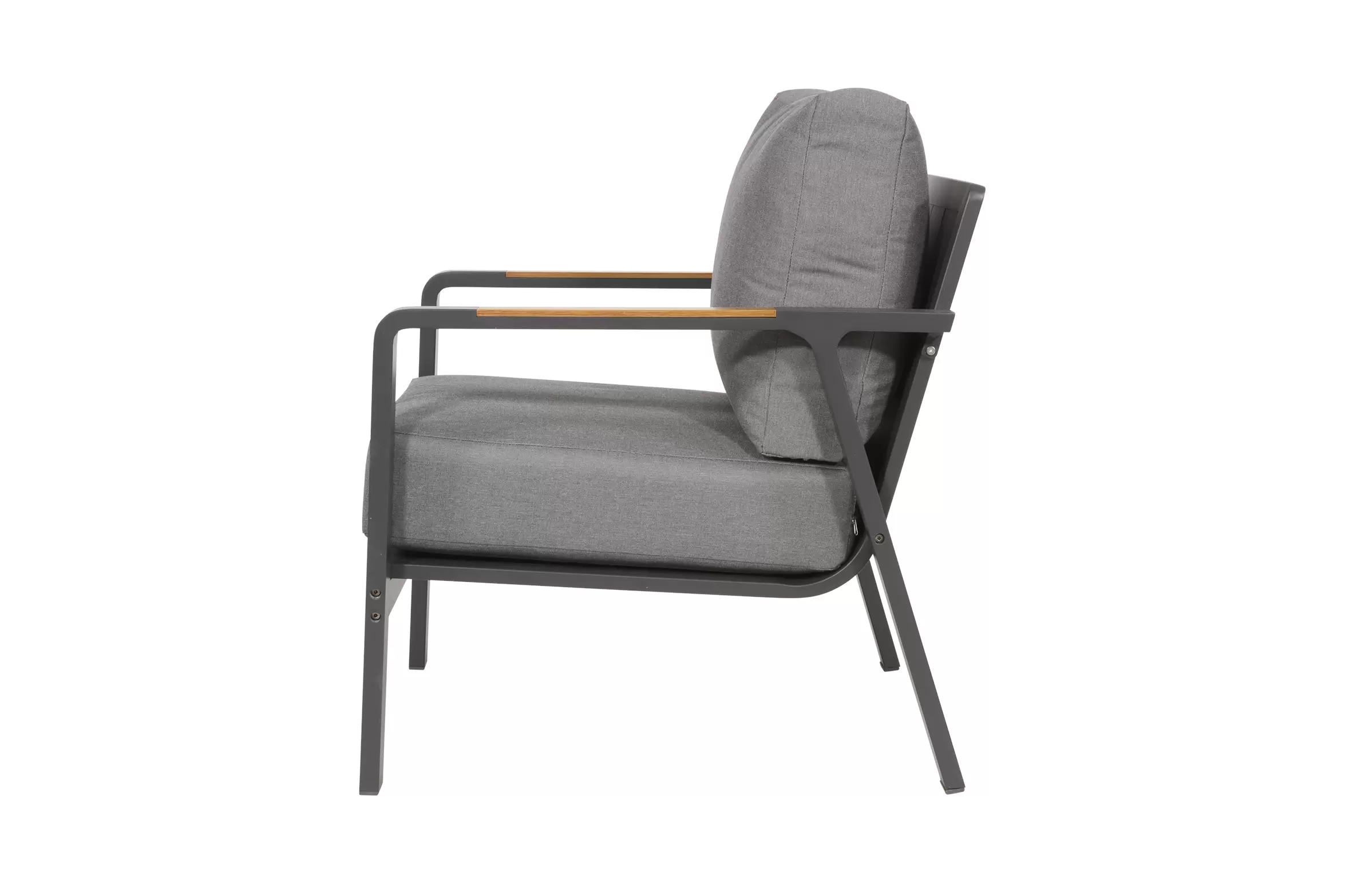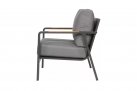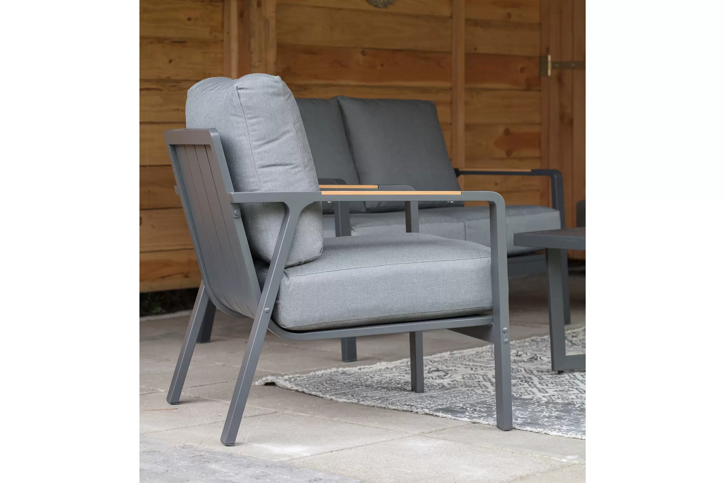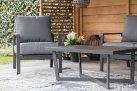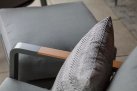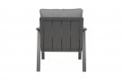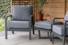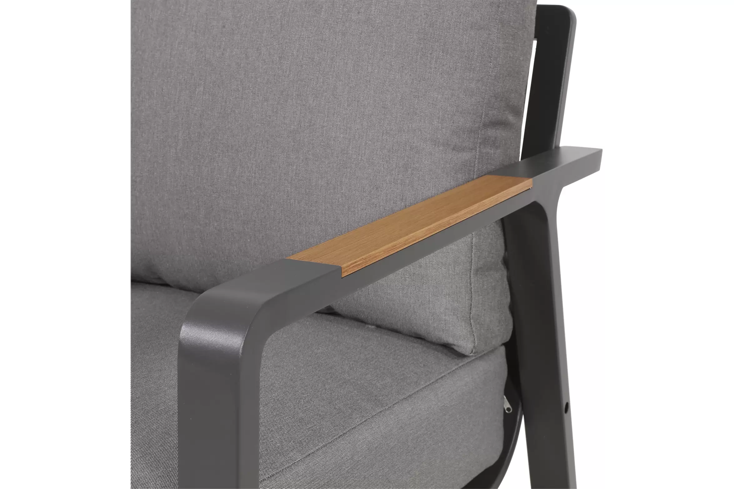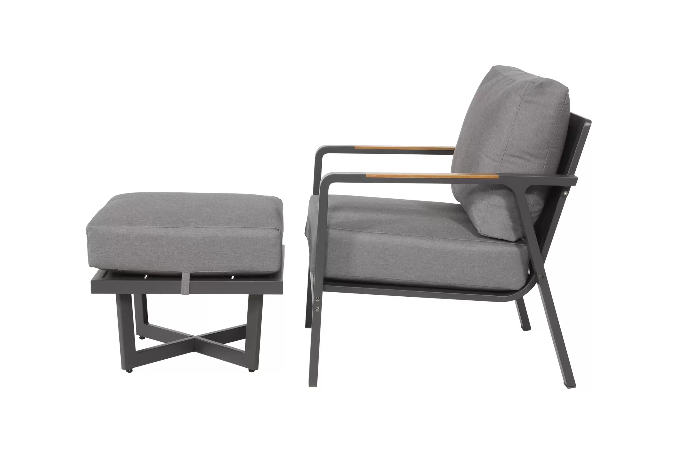 Nowoczesny fotel wypoczynkowy o aluminiowej konstrukcji z grubymi wygodnymi poduszkami wodoodpornymi z poszewkami z materiału Olefin.