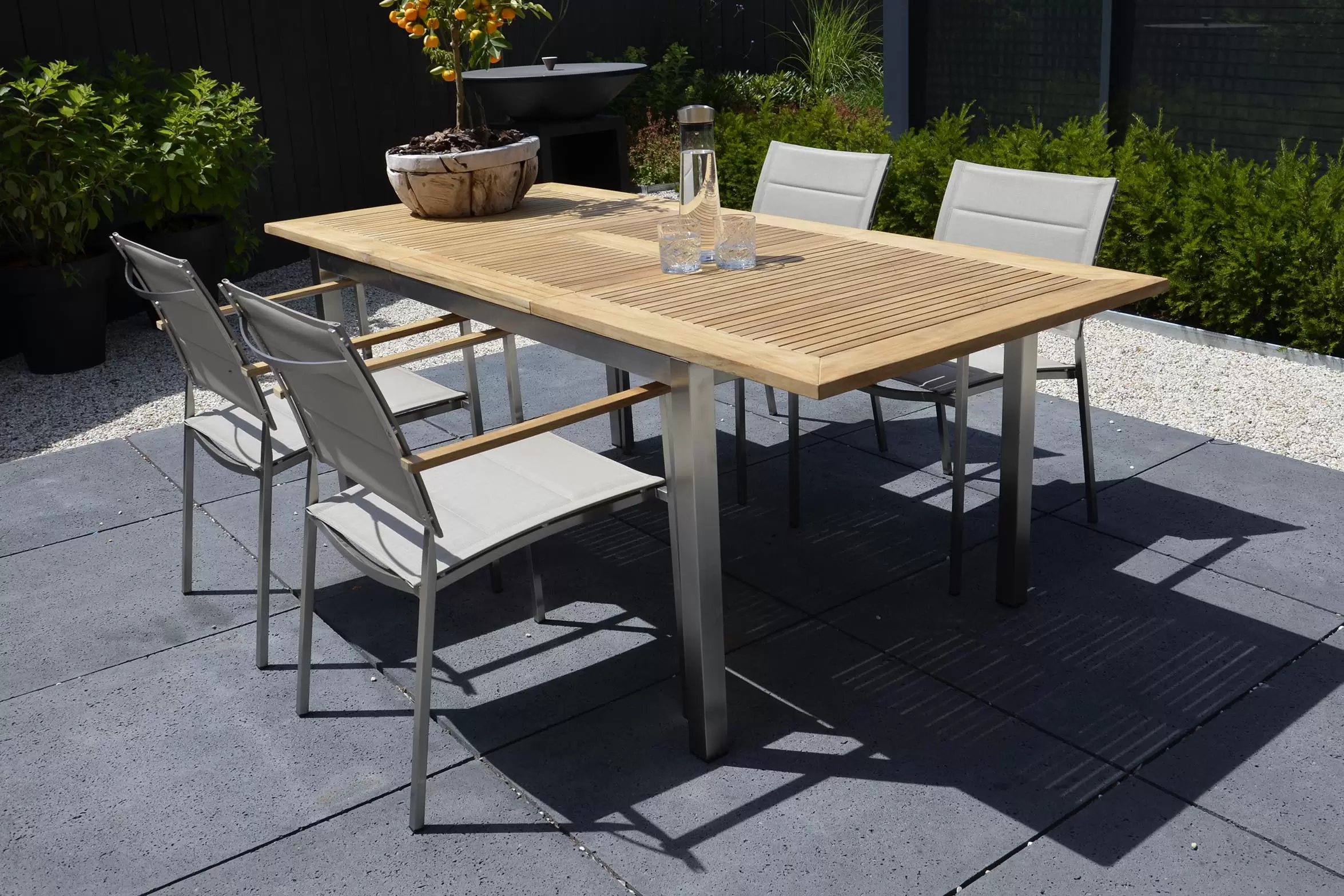 Nowoczesny stół ogrodowy z rozsuwanym blatem o podstawie ze stali nierdzewnej. Blat stołu z drewna teakowego FSC.