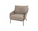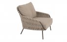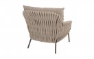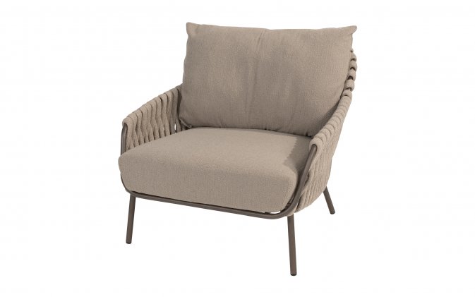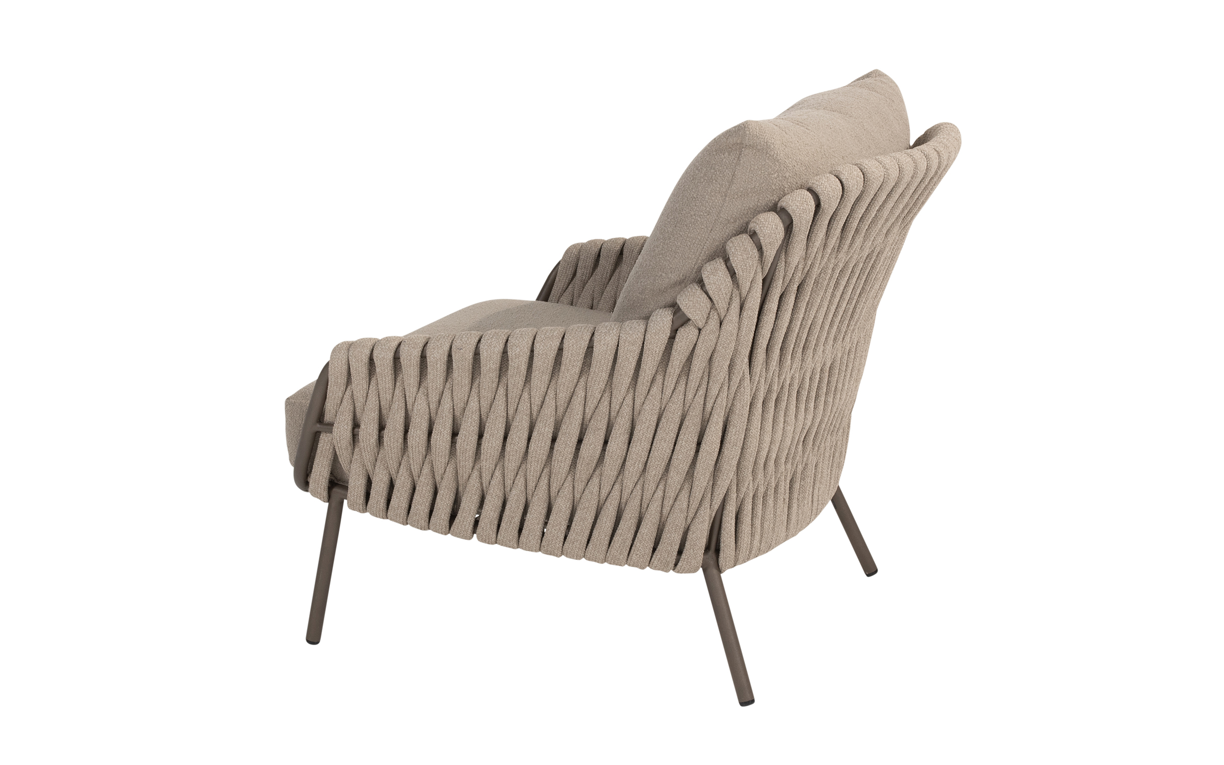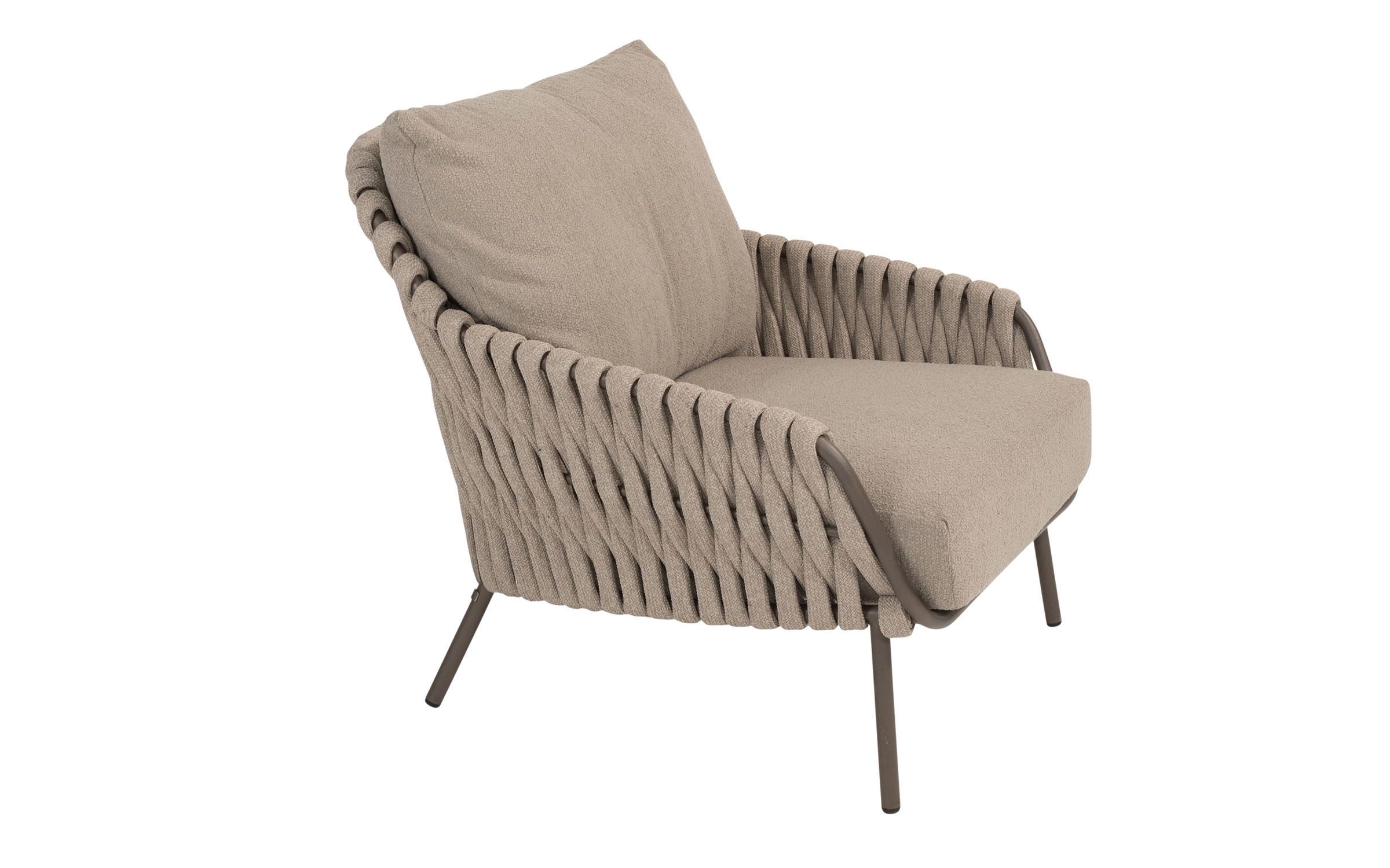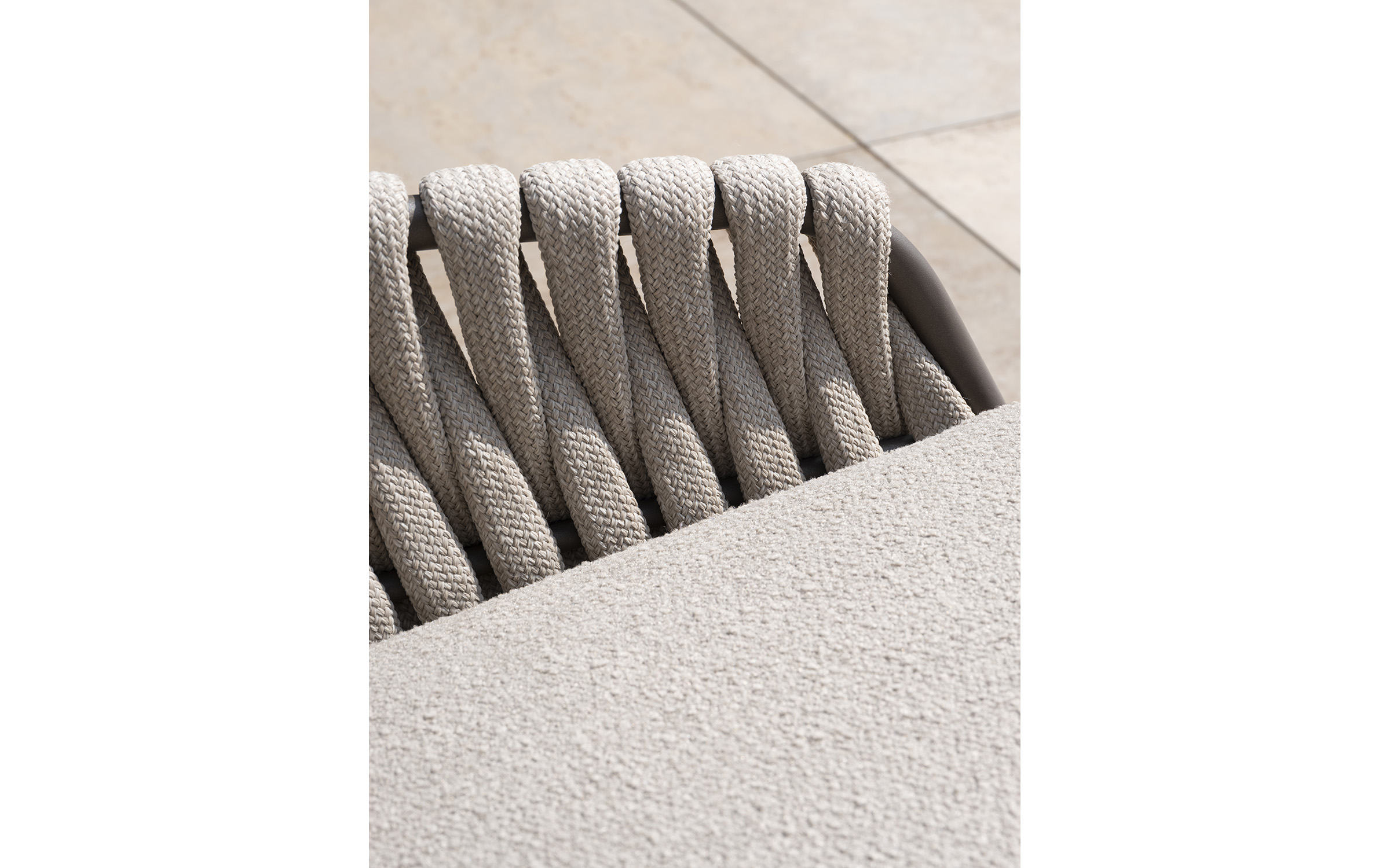 Fotel Montera w kolorze Terre łączy styl i komfort z eleganckim designem. Charakterystyczne plecionki z liny wykonane w wyrafinowanym wzorze nadają fotelowi unikalny wygląd. Rama wykonana jest ze stali nierdzewnej z ciemną powłoką proszkową Terre. Obficie wypełnione poduszki pokryte tkaniną Bouclé zapewniają wyjątkową miękkość i komfort, a ergonomiczny kształt fotela wspiera relaks. Fotel jest w 100% odporny na warunki atmosferyczne, trwały i łatwy w utrzymaniu.