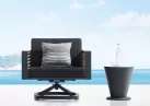 Obrotowy nowoczesny fotel ogrodowy aluminiowy z kolekcji NEW YORK. Konstrukcja opiera się na spawanej ramie aluminiowej malowanej proszkowo, elementach dekoracyjnych z teaku i wygodnych poduszek z obiciami z materiału Olefin. Poduszki położone na opinającej ramę tekstylinie.