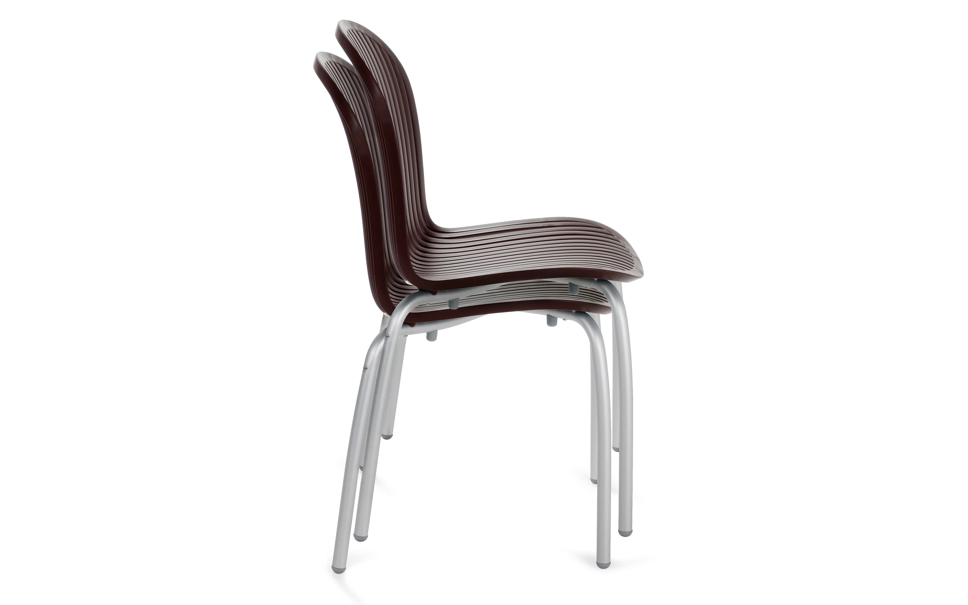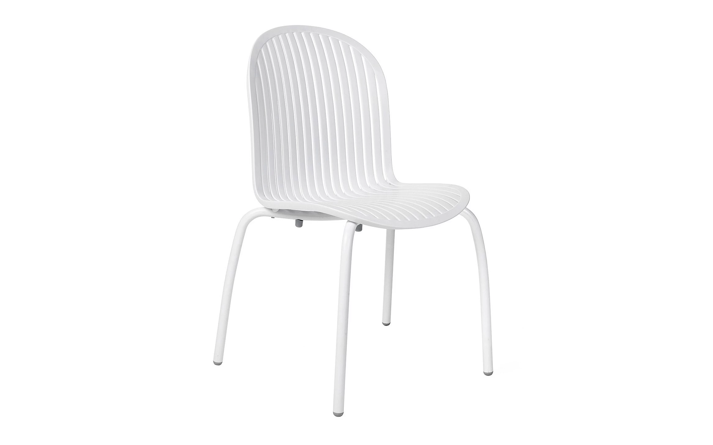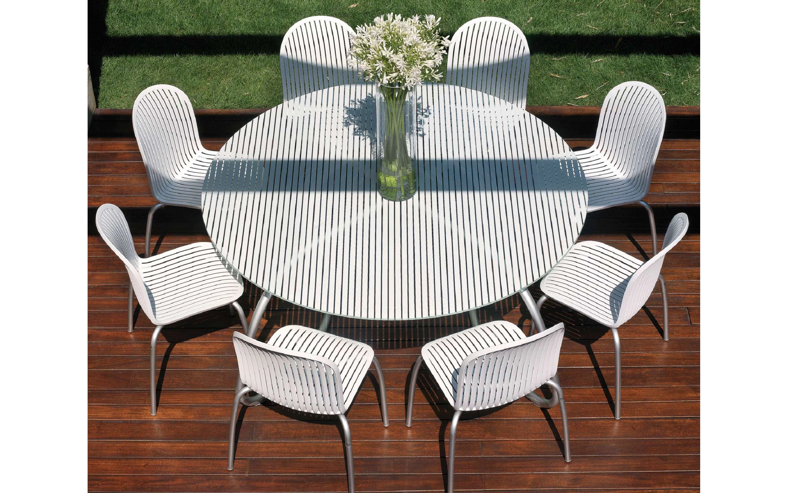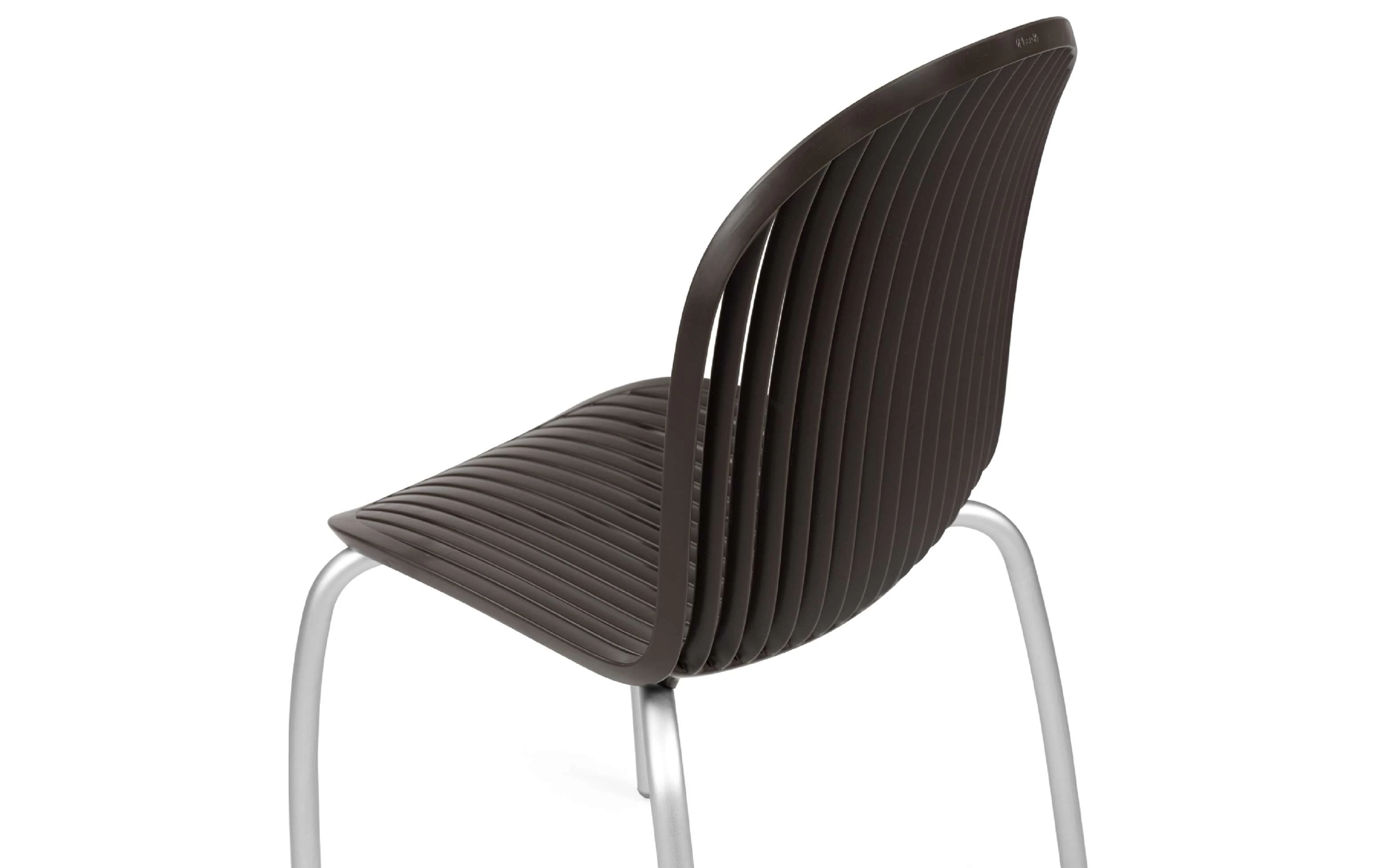 Sztaplowane krzesło wykonane aluminium (nogi) a siedzisko z włókna szklanego oraz z żywicy syntetycznej (żywica polipropylenowa z dodatkami zabezpieczającymi przed promieniowaniem UV, barwiona w masie) - pasy w kolorze czarnym lub białym.
