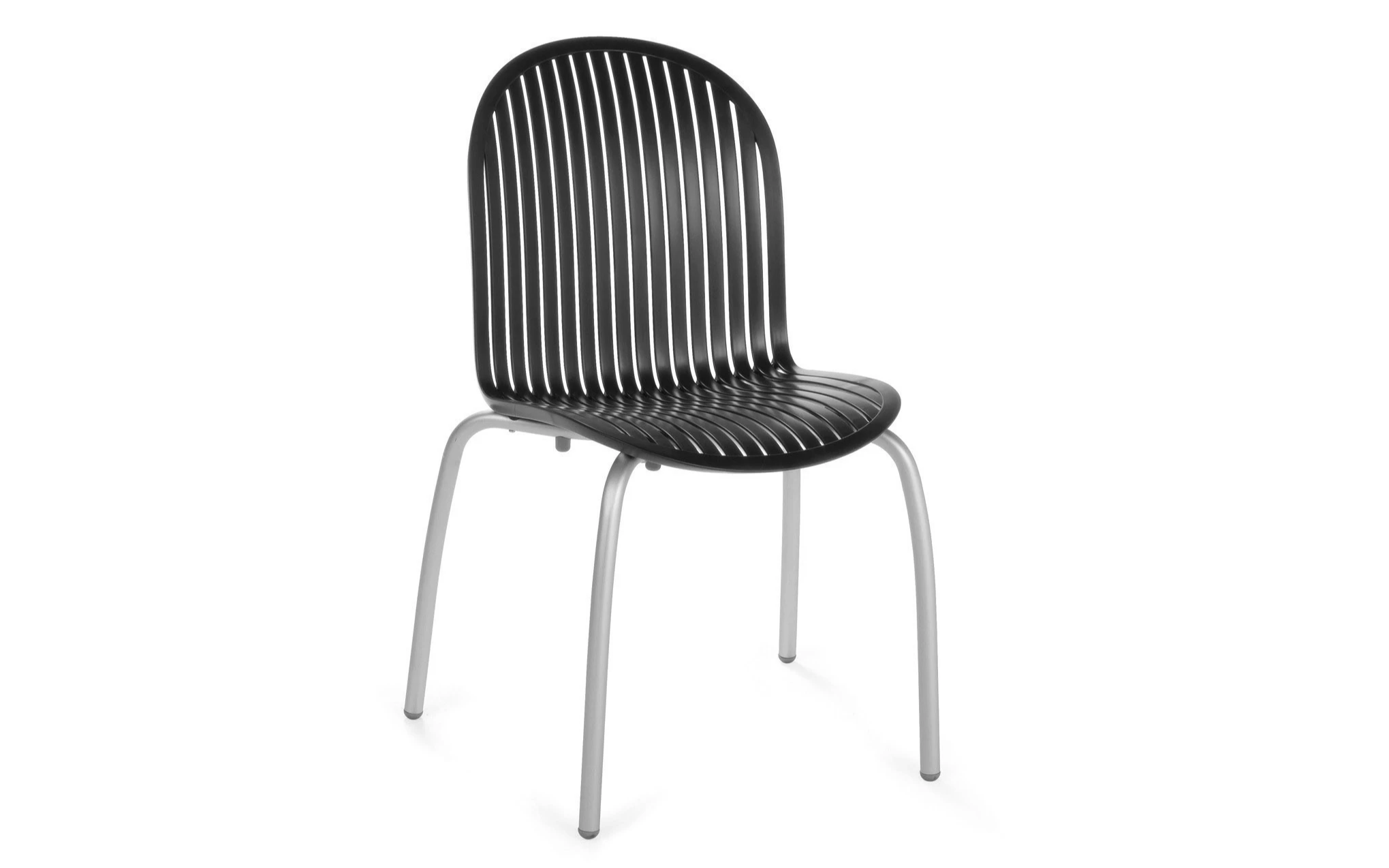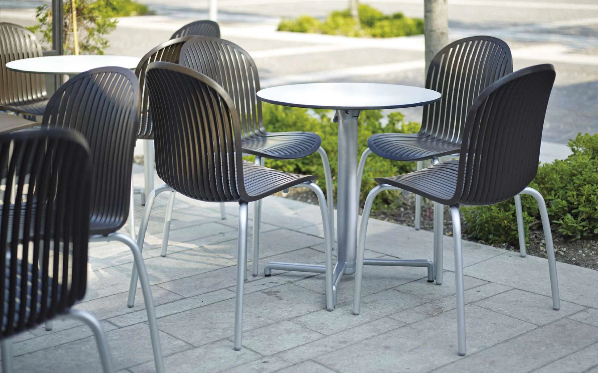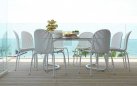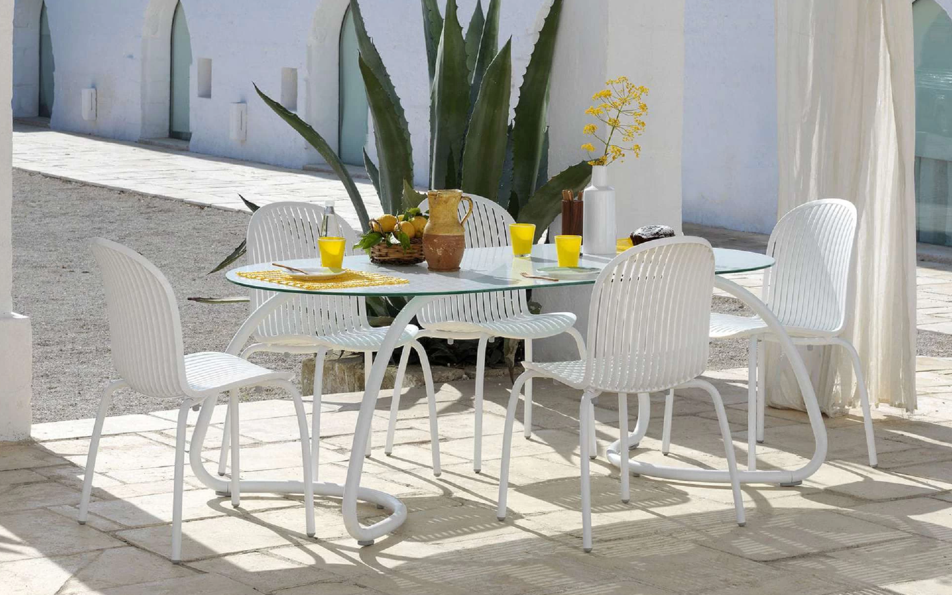 Sztaplowane krzesło wykonane aluminium (nogi) a siedzisko z włókna szklanego oraz z żywicy syntetycznej (żywica polipropylenowa z dodatkami zabezpieczającymi przed promieniowaniem UV, barwiona w masie) - pasy w kolorze czarnym lub białym.