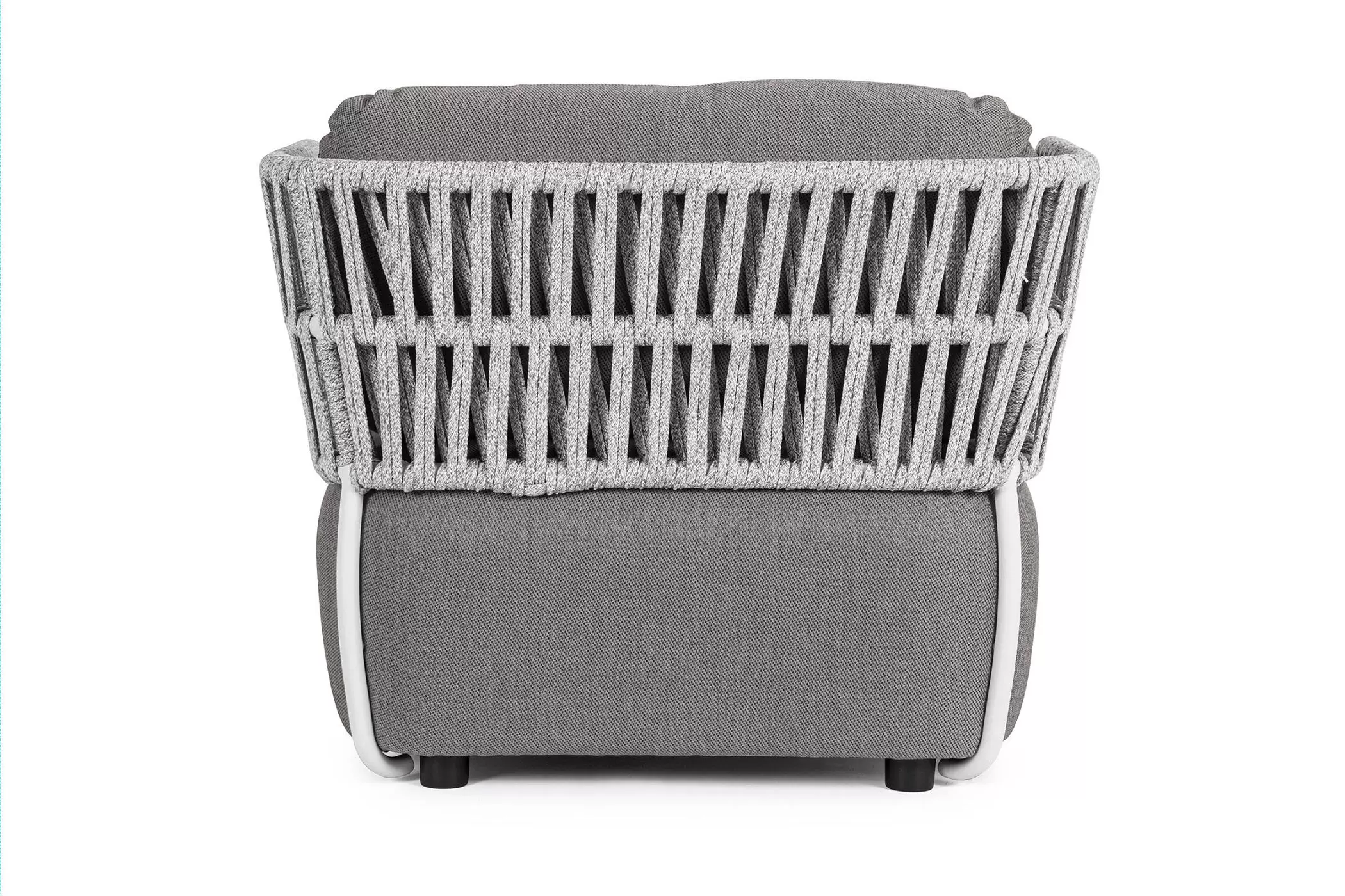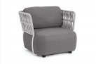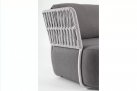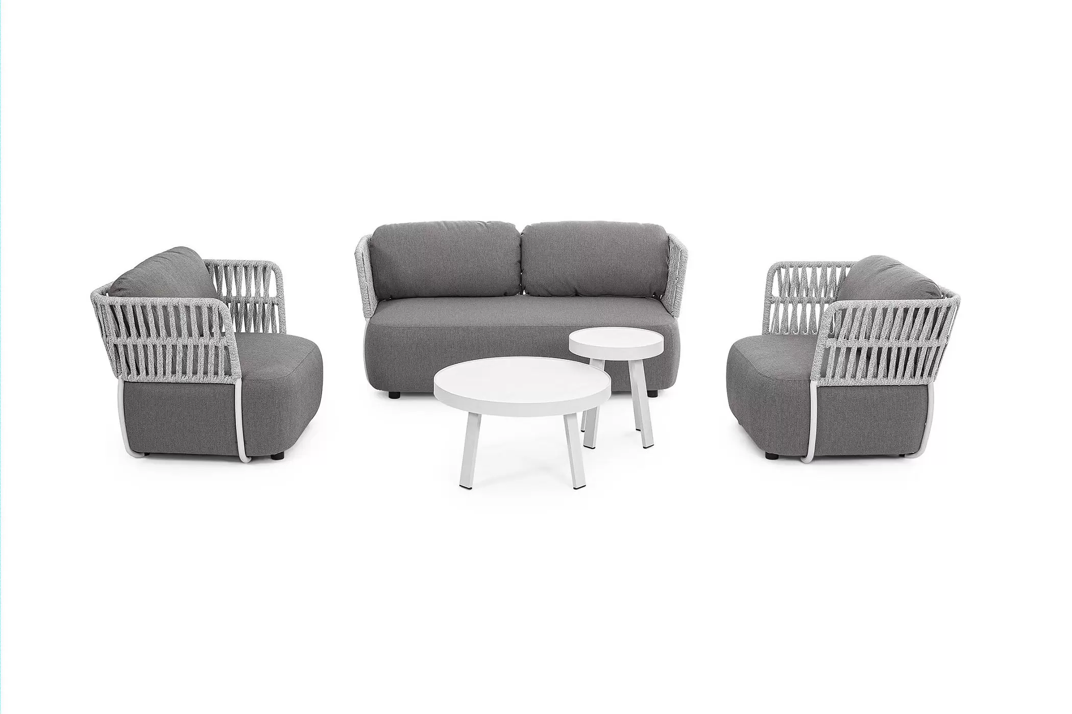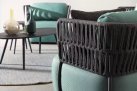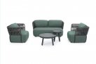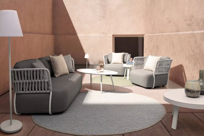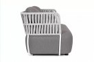 Eleganckie meble ogrodowe o aluminiowej konstrukcji, oplocie z pięknych pasów polipropylenowych i rzucające się w oczy grube poduszki.