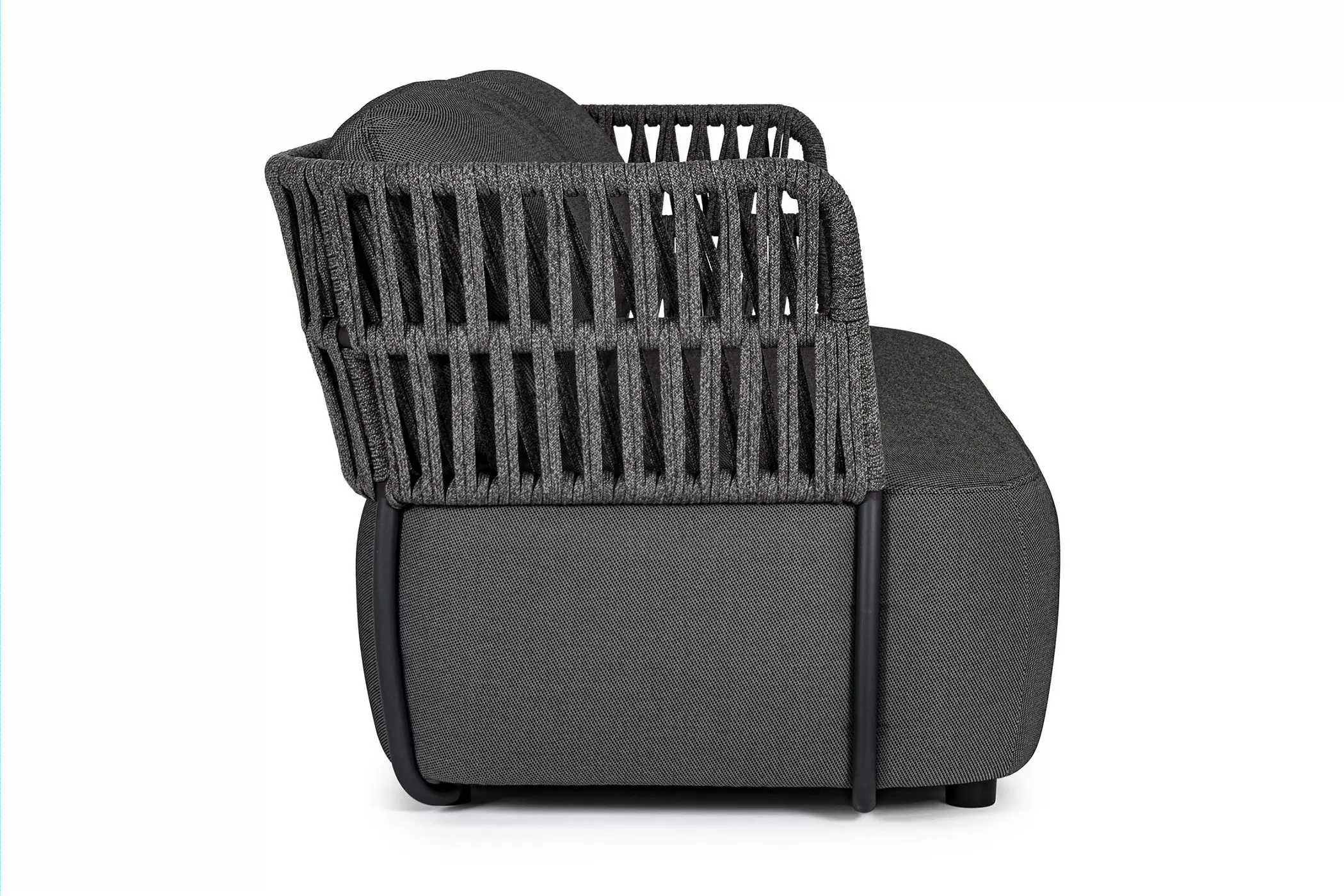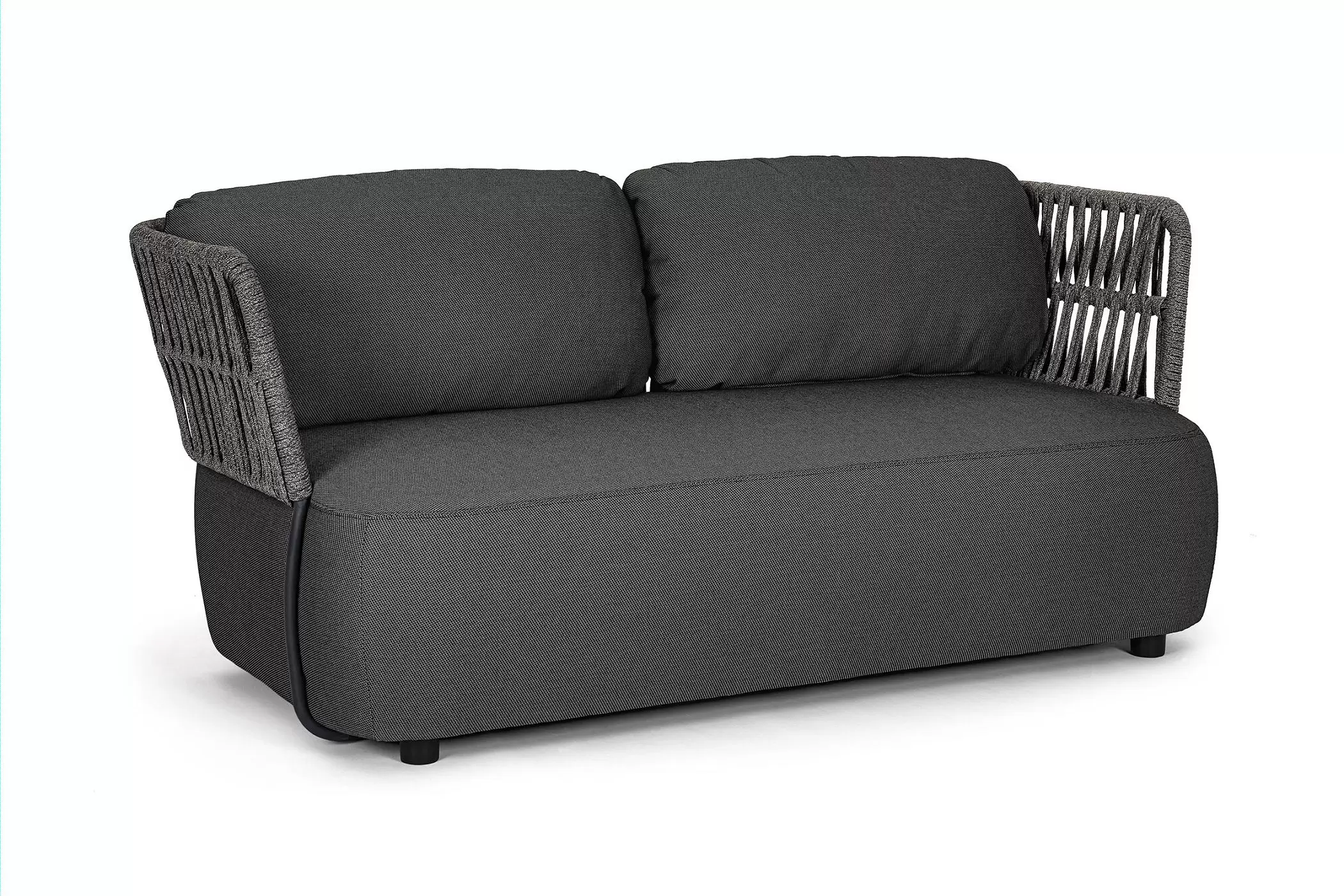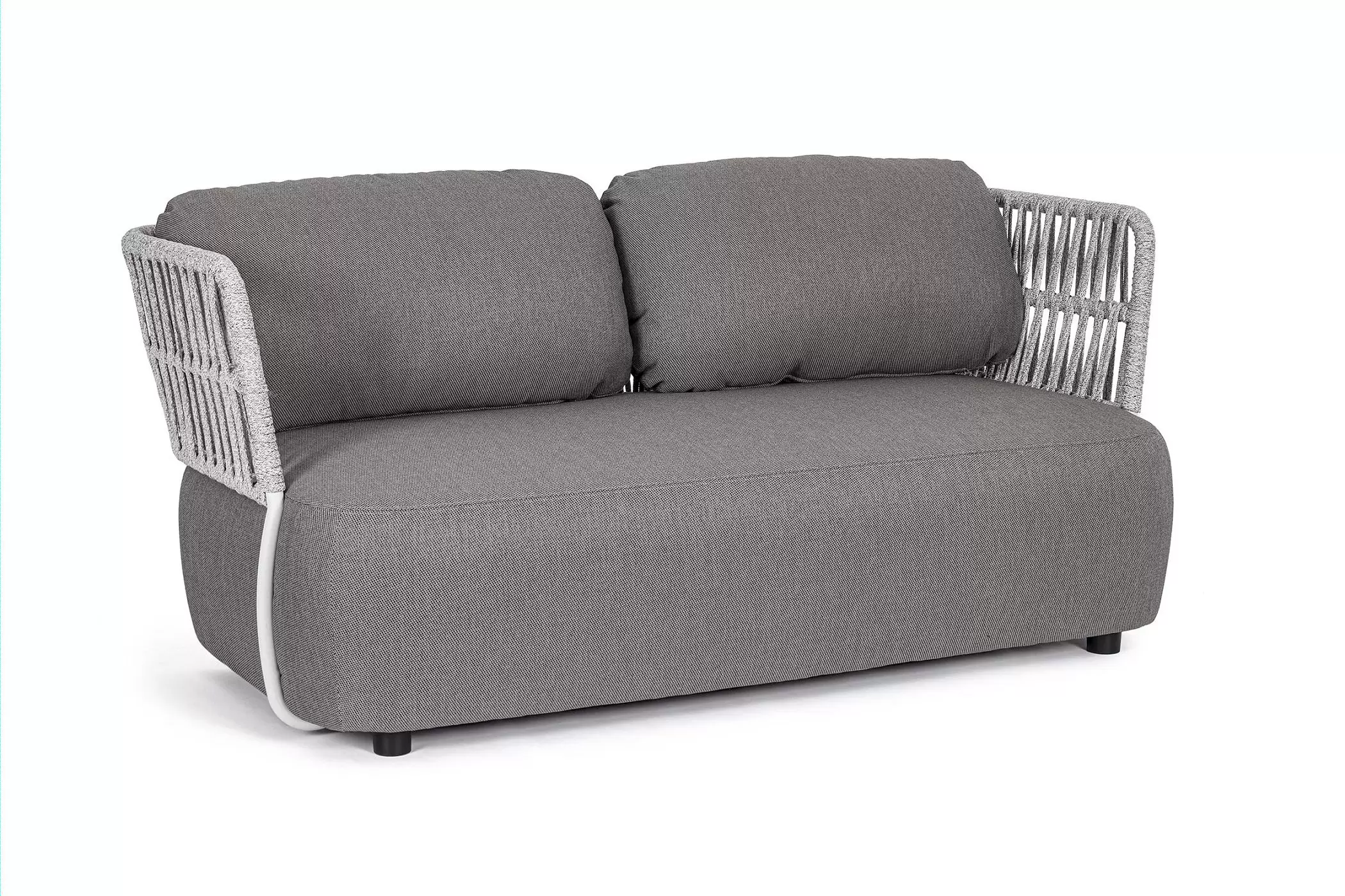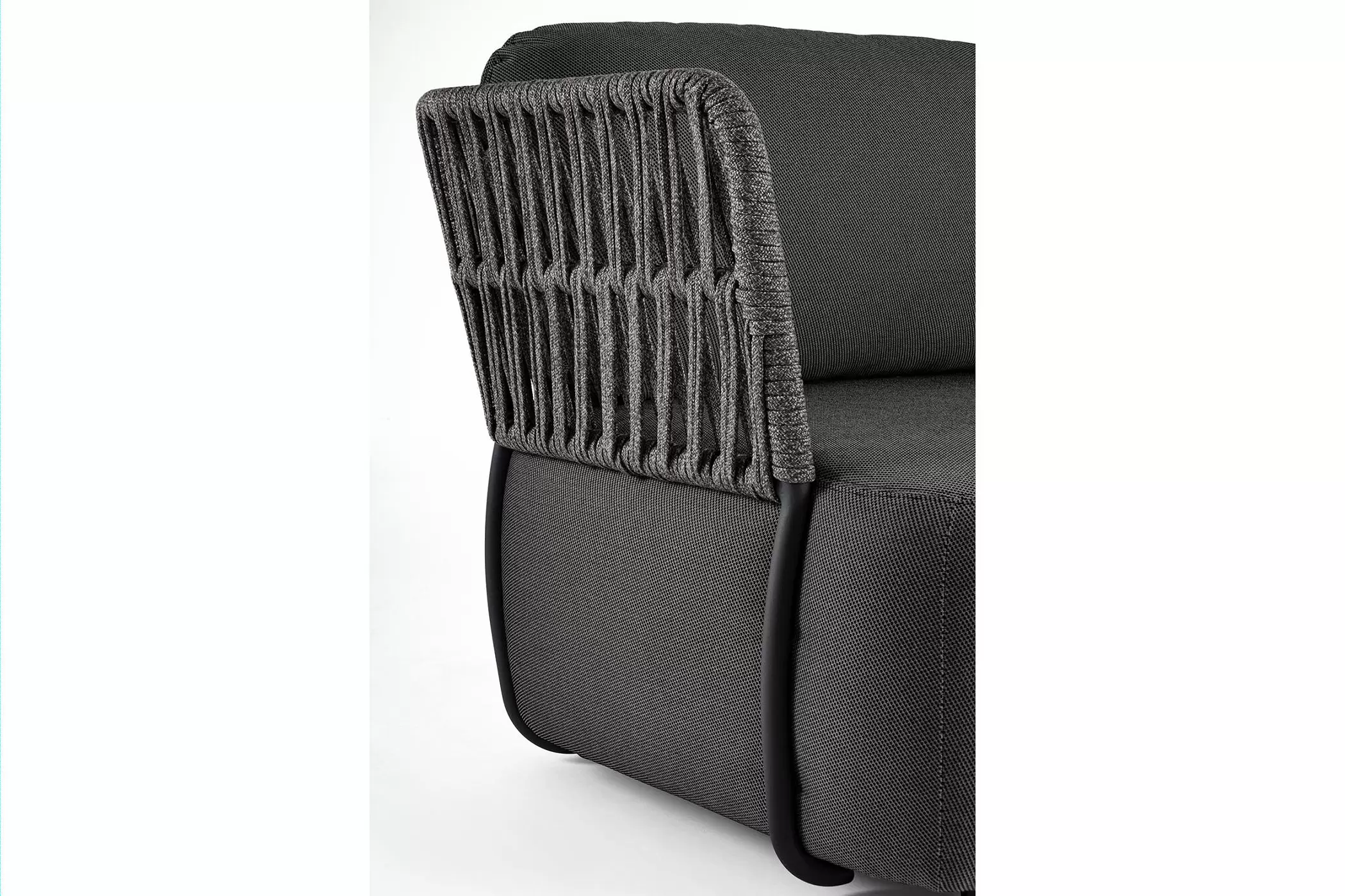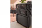 Stylowa sofa ogrodowa o aluminiowej konstrukcji, oplocie z pięknych pasów polipropylenowych i rzucających się w oczy grubych poduszkach.