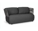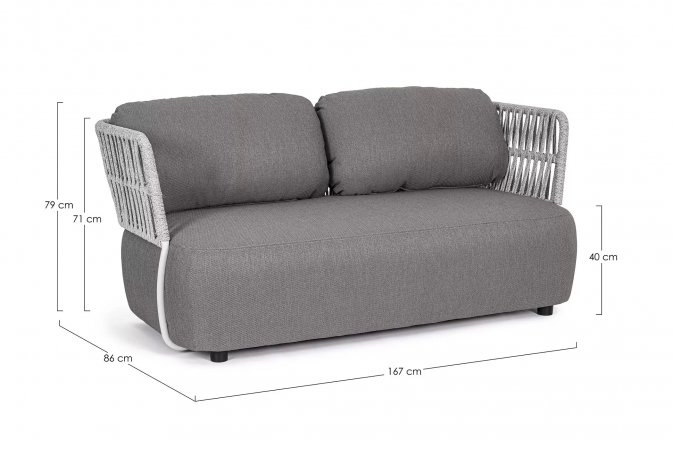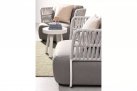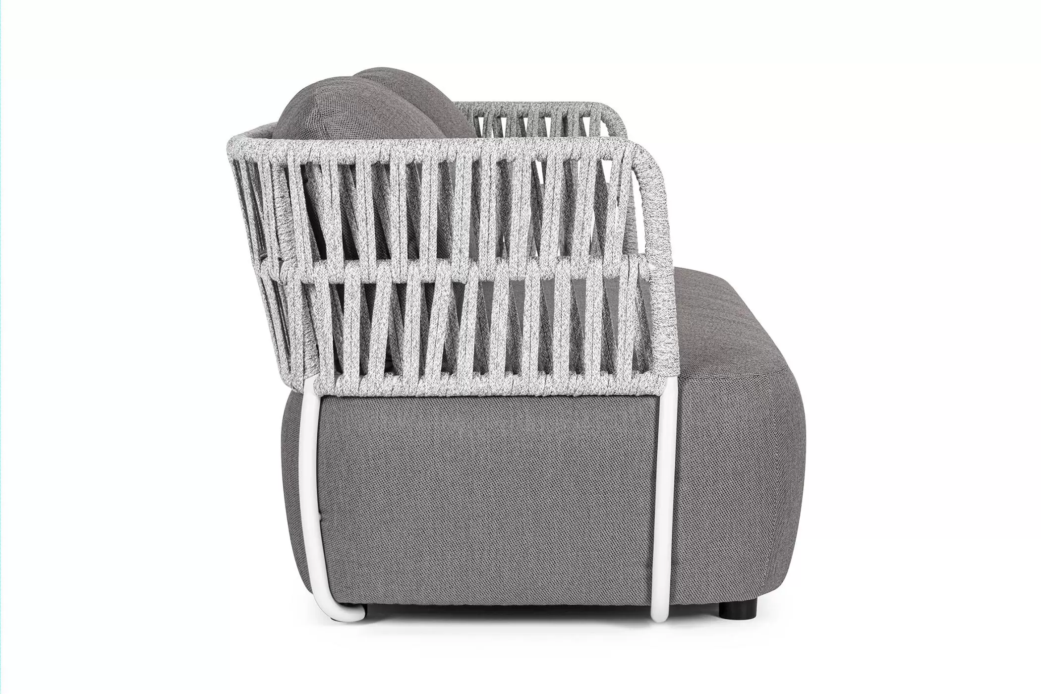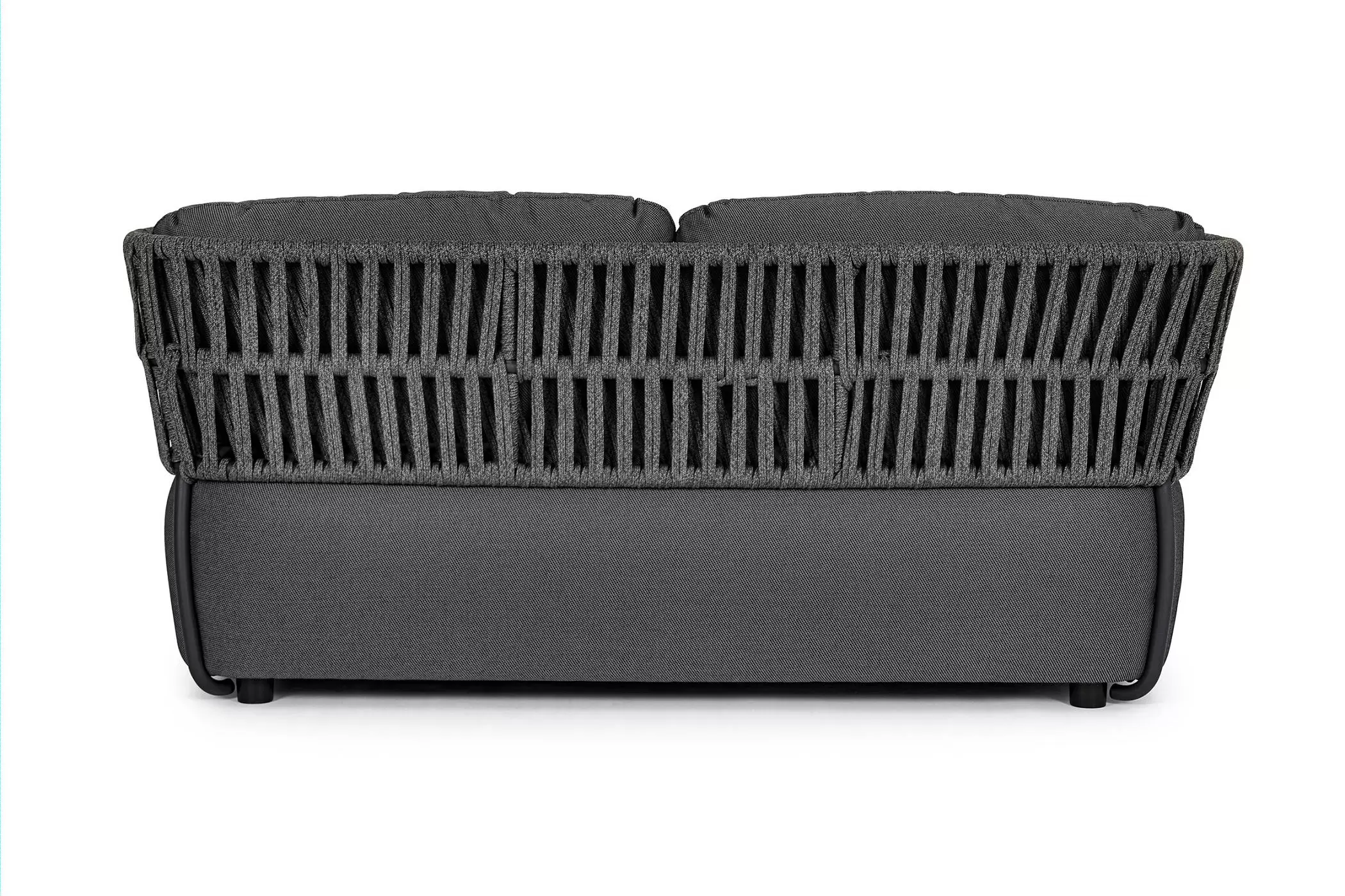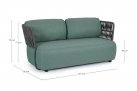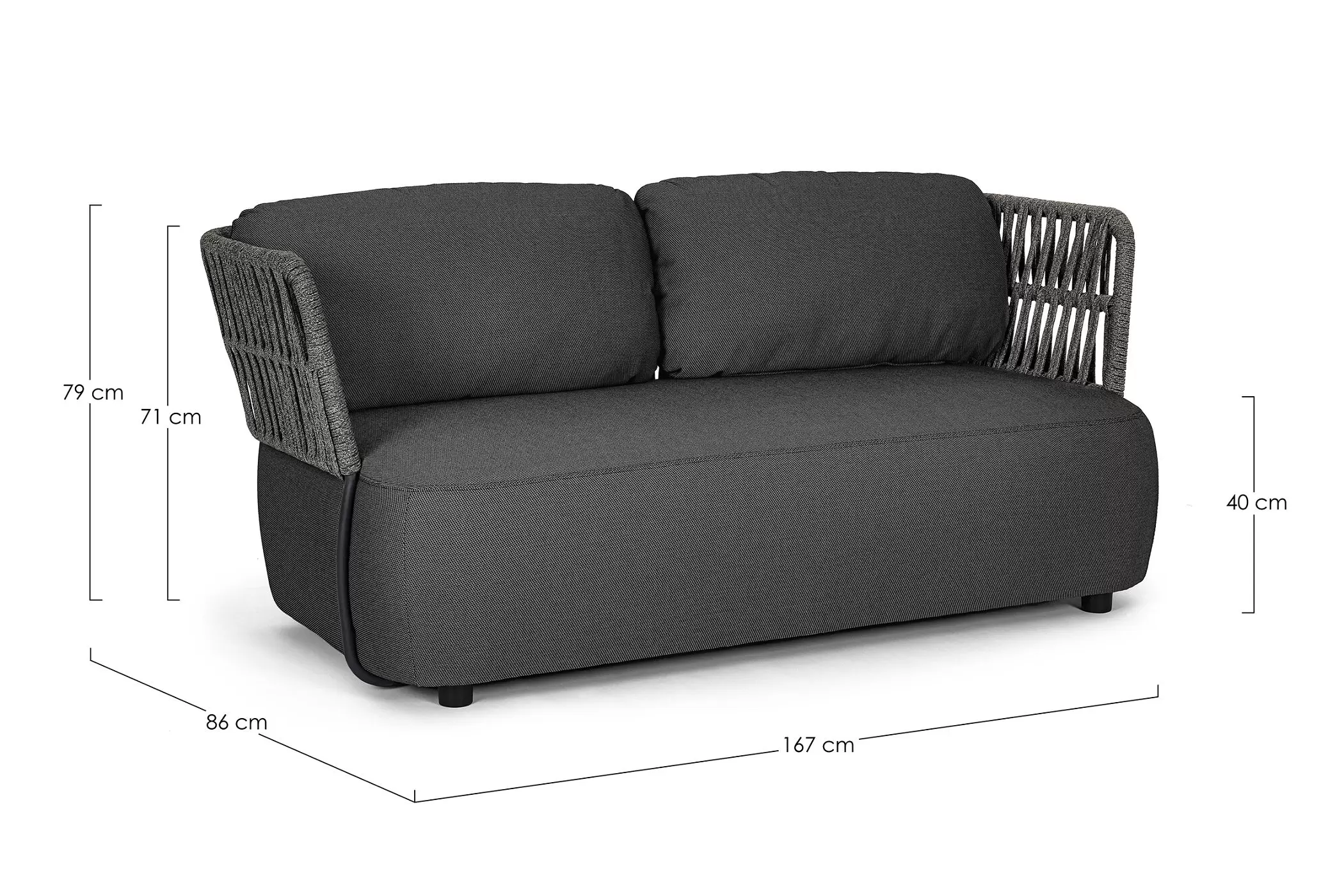 Stylowa sofa ogrodowa o aluminiowej konstrukcji, oplocie z pięknych pasów polipropylenowych i rzucających się w oczy grubych poduszkach.
