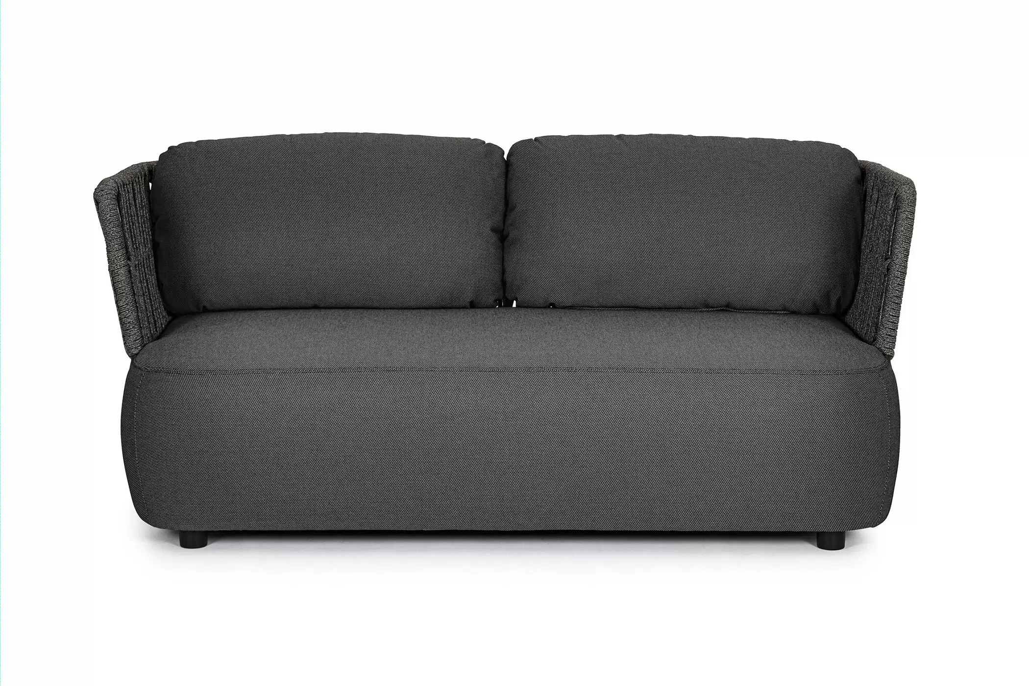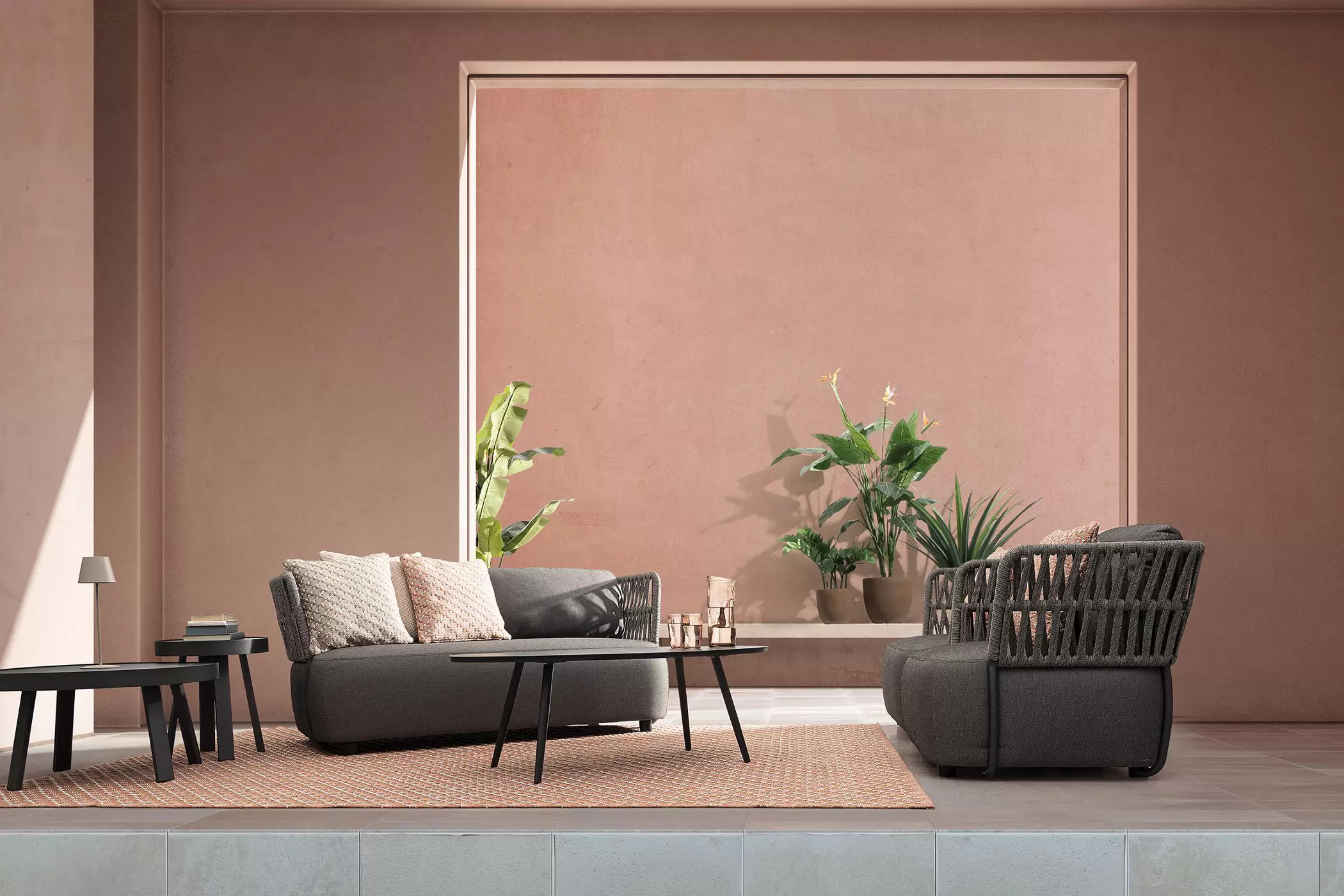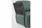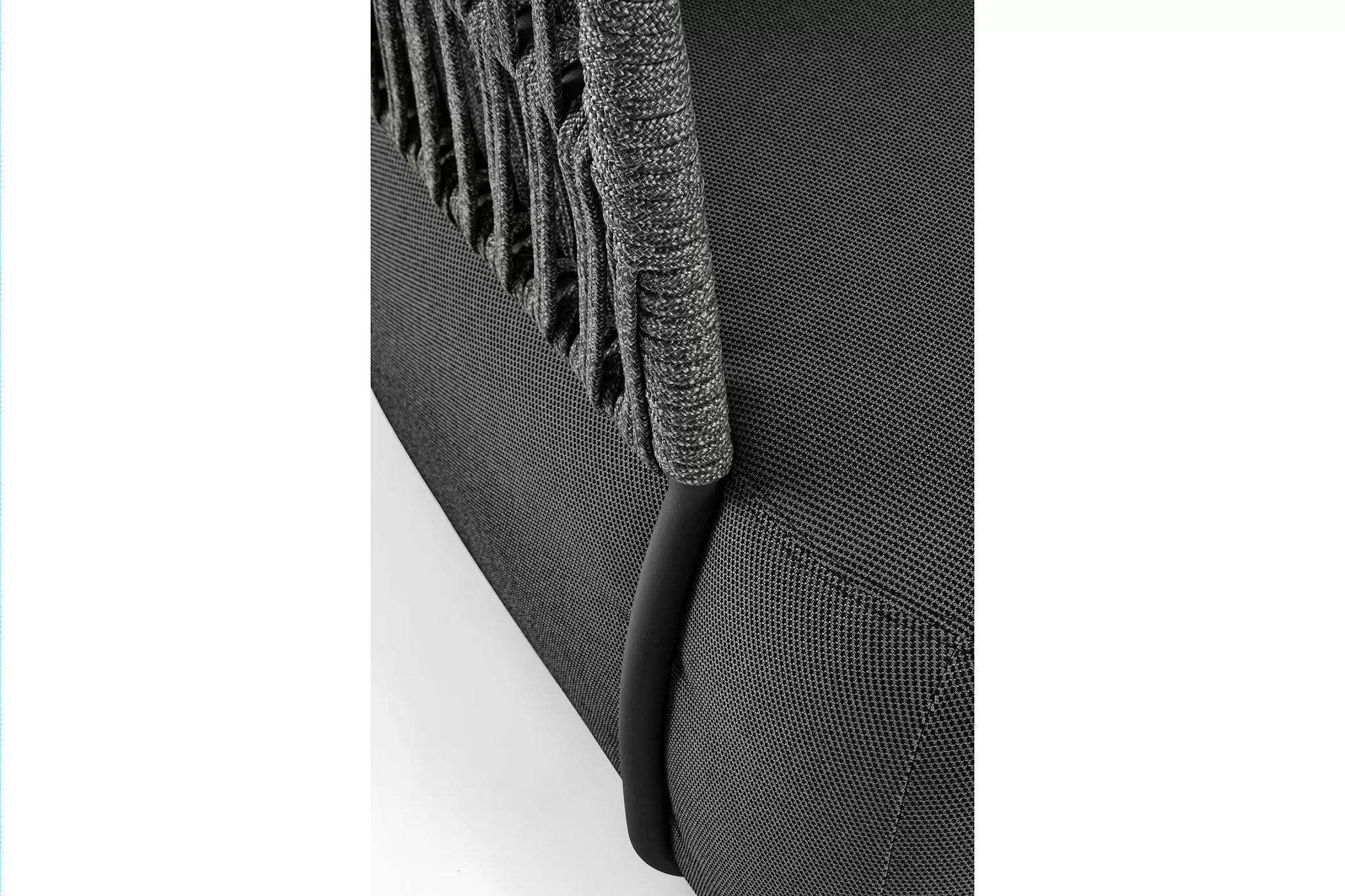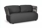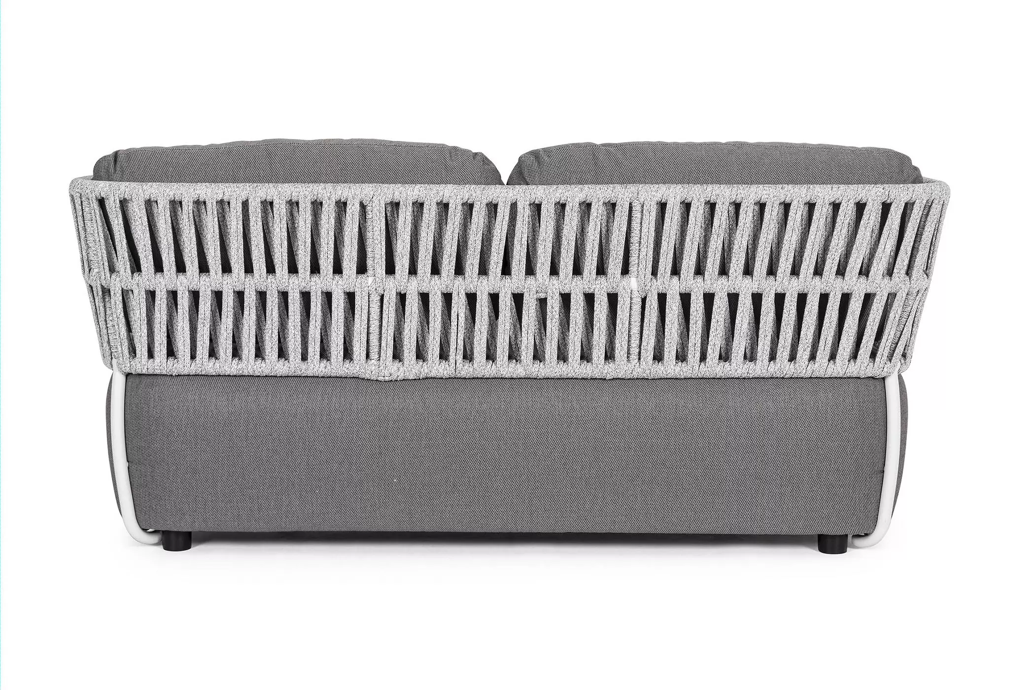 Stylowa sofa ogrodowa o aluminiowej konstrukcji, oplocie z pięknych pasów polipropylenowych i rzucających się w oczy grubych poduszkach.