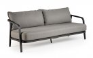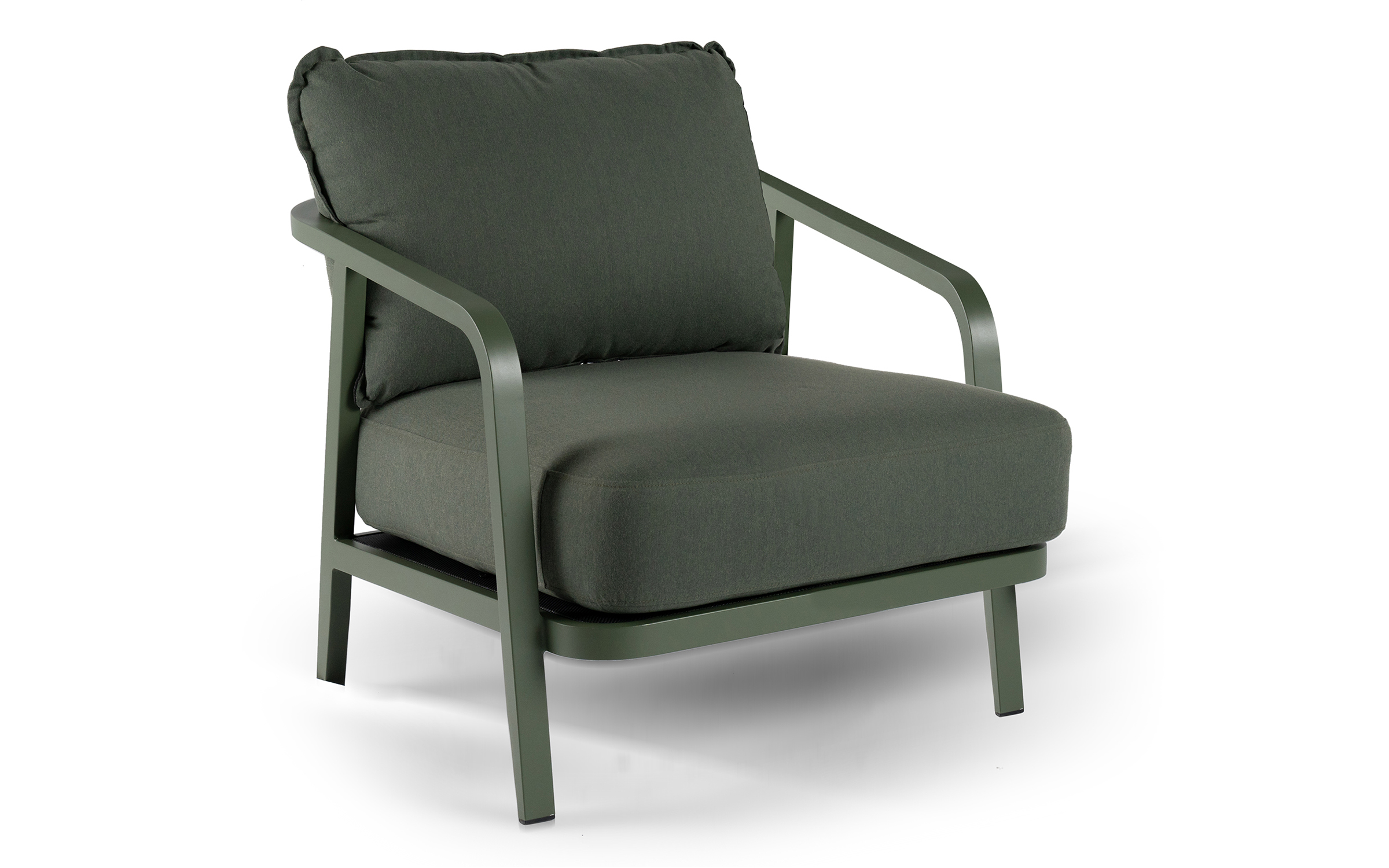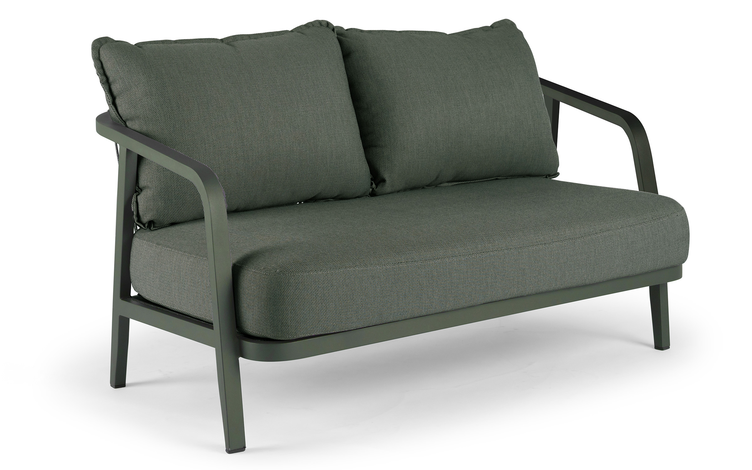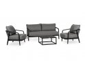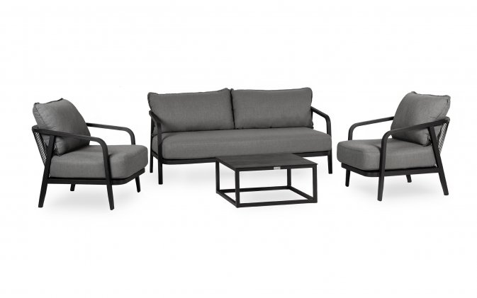 Nowoczesny komplet wypoczynkowy o aluminiowej konstrukcji z wygodnymi poduszkami wodoodpornymi z poszewkami z materiału Olefin.
