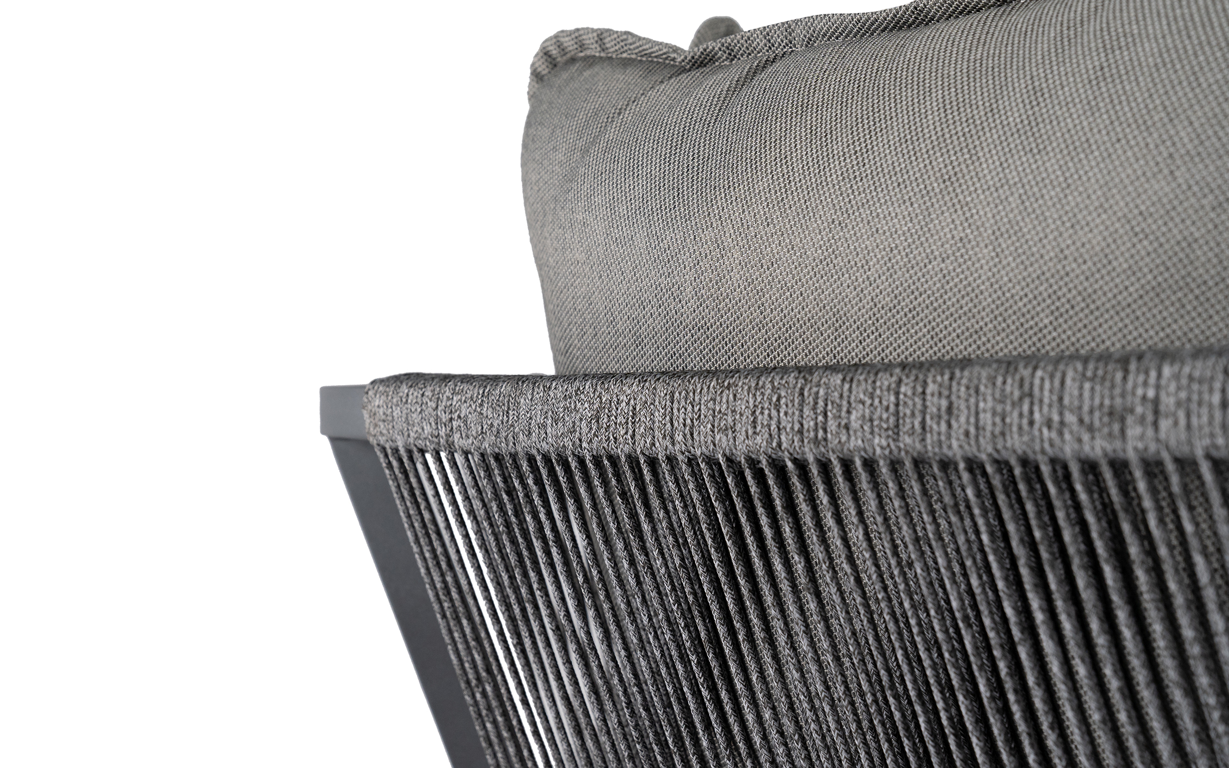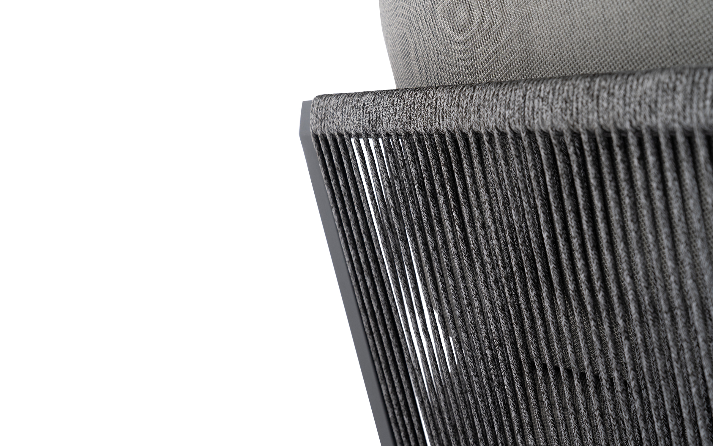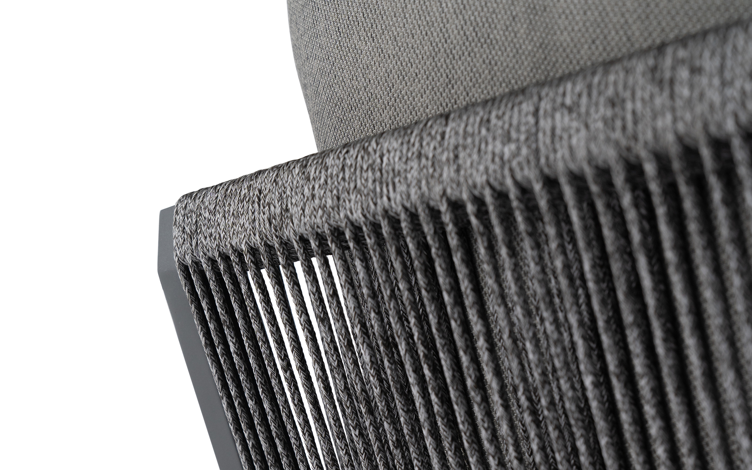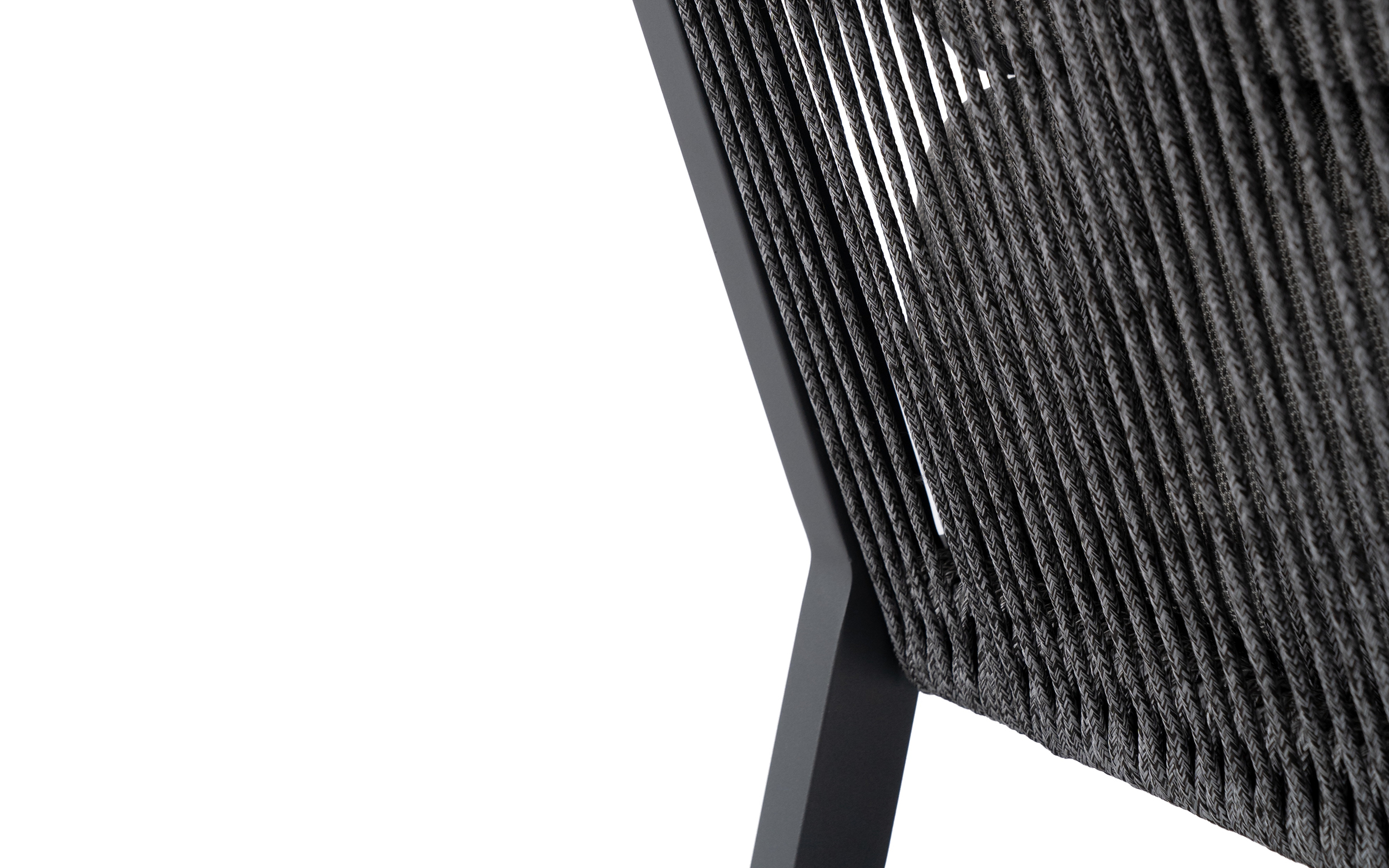 Konstrukcja aluminiowa malowana proszkowo. Boki oraz tył oparcia oplecione z odpornej na warunki atmosferyczne liny polipropylenowej.