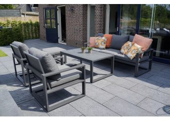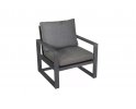 Aluminiowa konstrukcja malowana proszkowo w kolorze ciemnoszarym. Na siedzisku i oparciu pod poduszkami gęsta tekstylina 4x4.