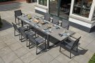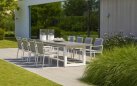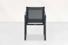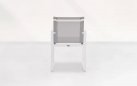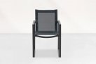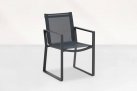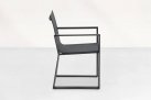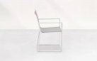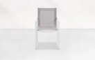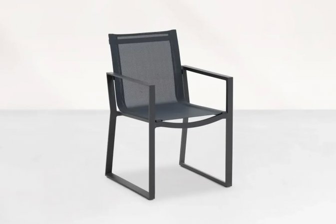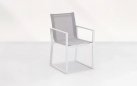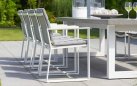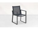 Nowoczesne krzesło do ogrodowej jadalni z płozą przy ziemie i siedziskiem z tekstyliny. Opcjonalnie dostępna poduszka na siedzisko i oparcie.