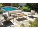 Zestaw wypoczynkowy RIGA marki LesliLiving to elegancki komplet 4‑częściowy, który łączy nowoczesny design z naturalnym charakterem. Składa się z sofy 2‑osobowej, dwóch foteli oraz stolika kawowego. Konstrukcja aluminiowa w kolorze matowa zieleń jest odporna na korozję i warunki atmosferyczne. Poduszki wykonane są z tkaniny Olefin 240 g/m², a blat stolika z drewna teak.