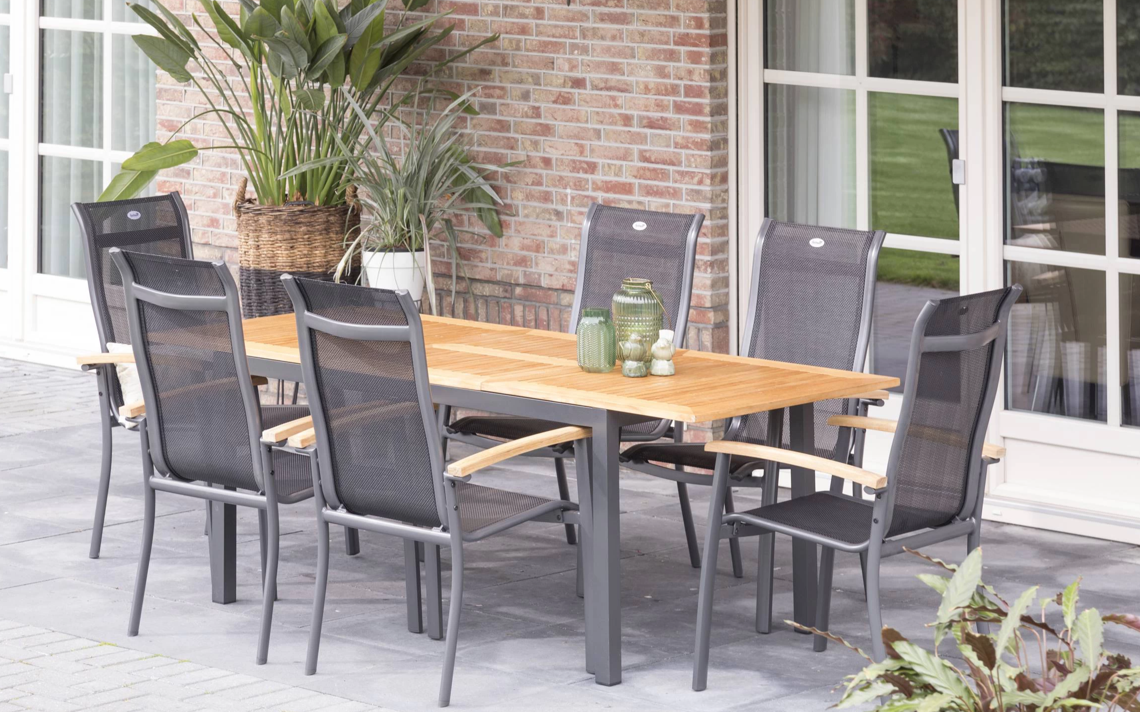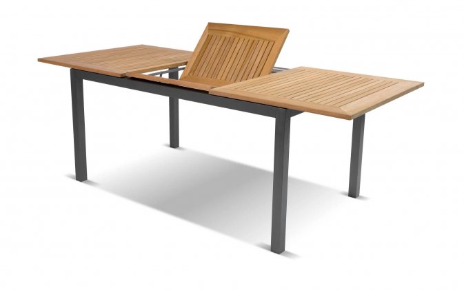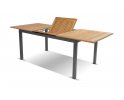Stół ogrodowy Hartman Wales ma blat z drewna tekowego podkreślający ekskluzywny wygląd mebli. Konstrukcja i nogi wykonane są z grubościennego stopu aluminium i są wyposażone w regulowane stopki na końcach, aby łatwiej wypoziomować stół na nierównych powierzchniach. Jest bardzo popularny ze względu na swoje wymiary i pasuje do każdego zakątka ogrodowej jadalni. rozkładany jest do długości 210 cm. system rozkładania motylkowy.