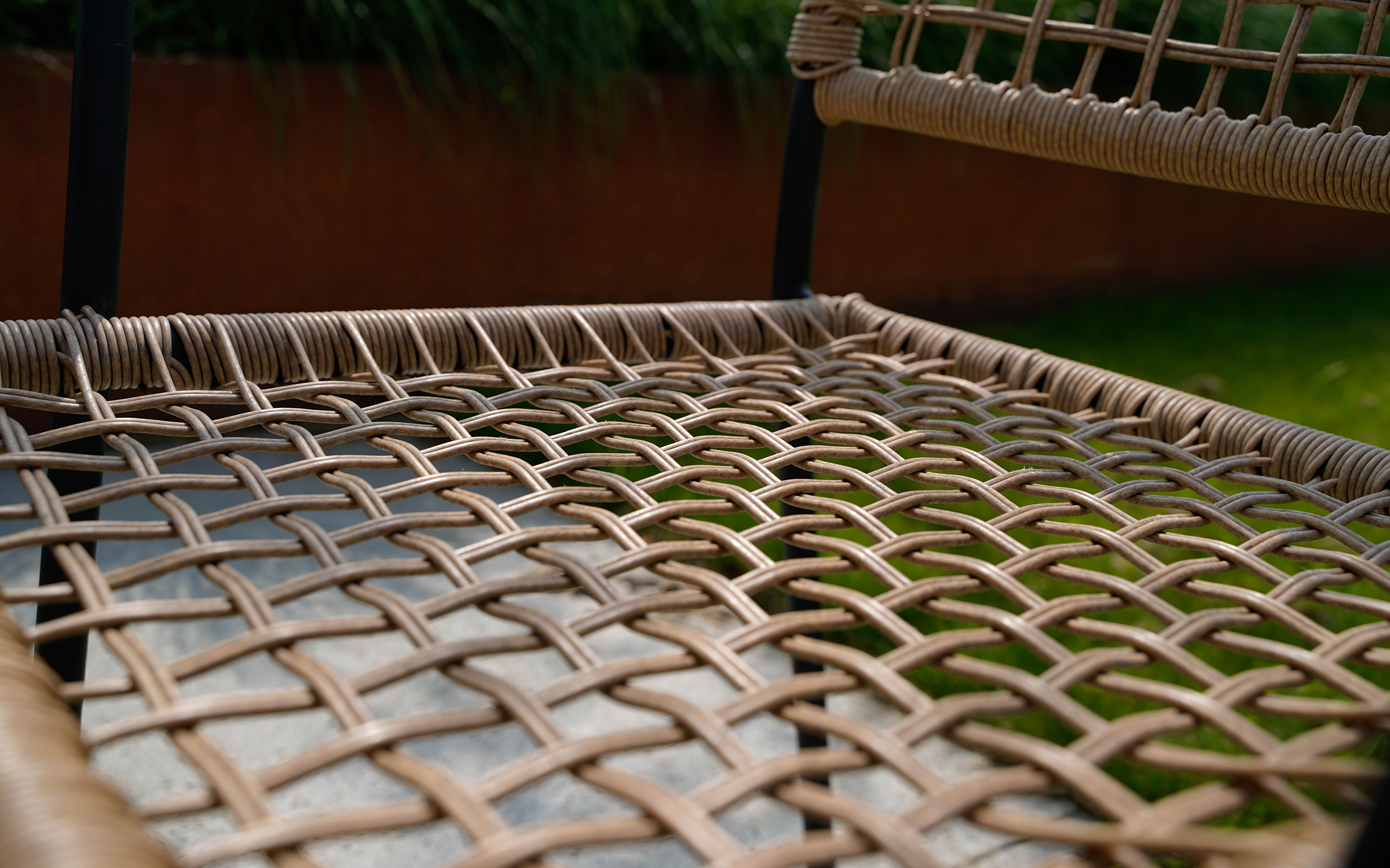 Siedzisko i oparcie: technorattan o splocie 3 mm, kolor brązowy, odporny na wilgoć i UV.