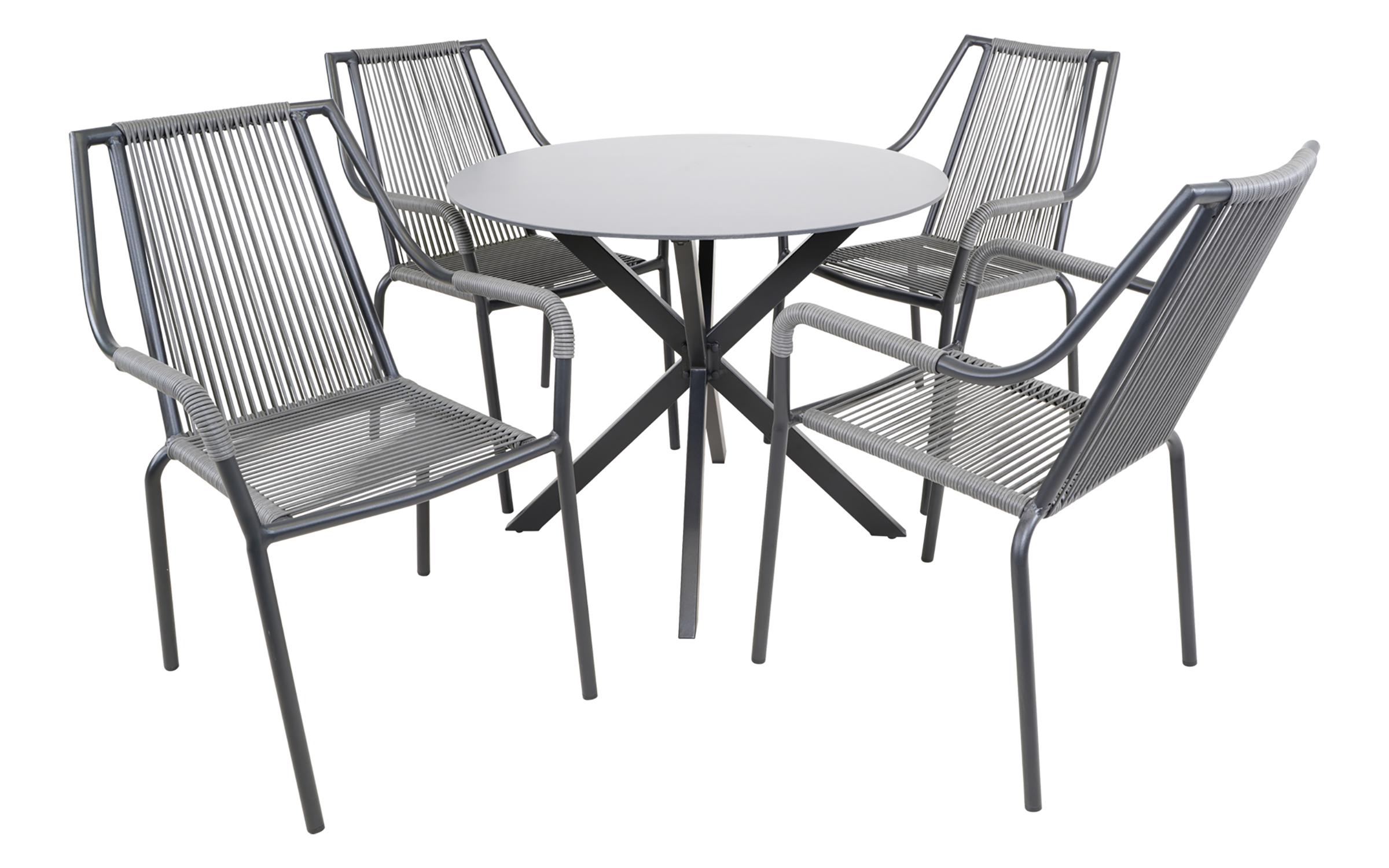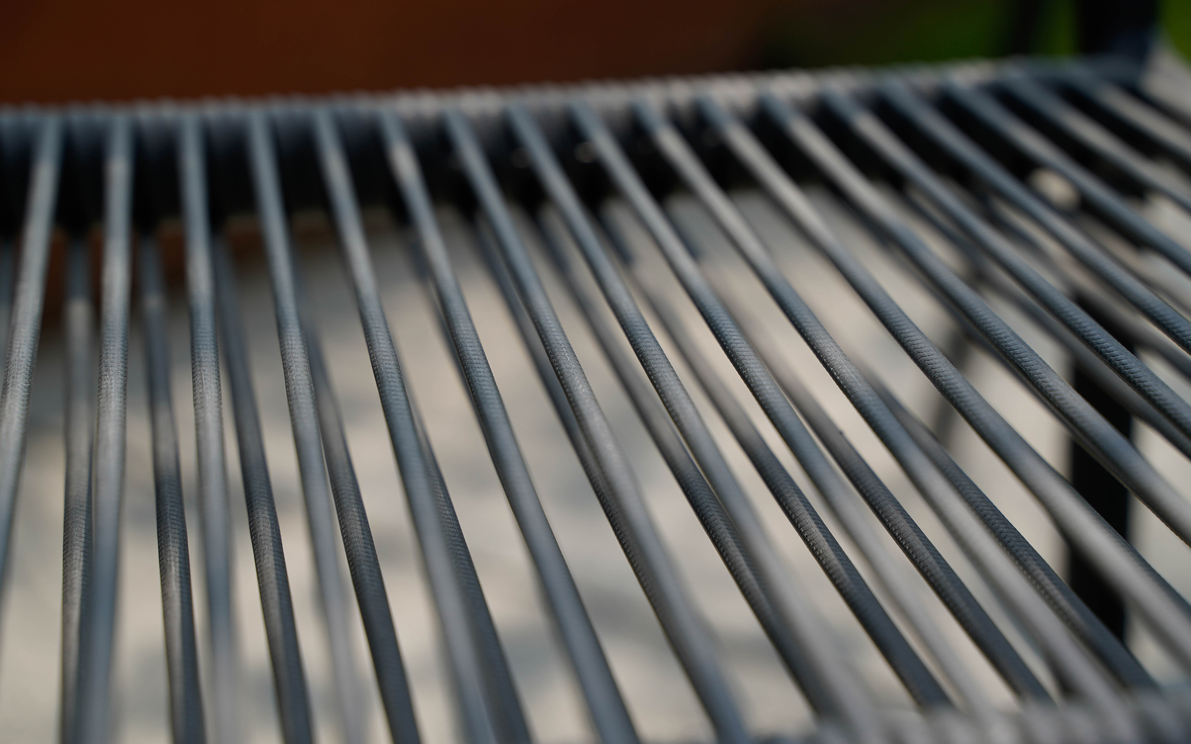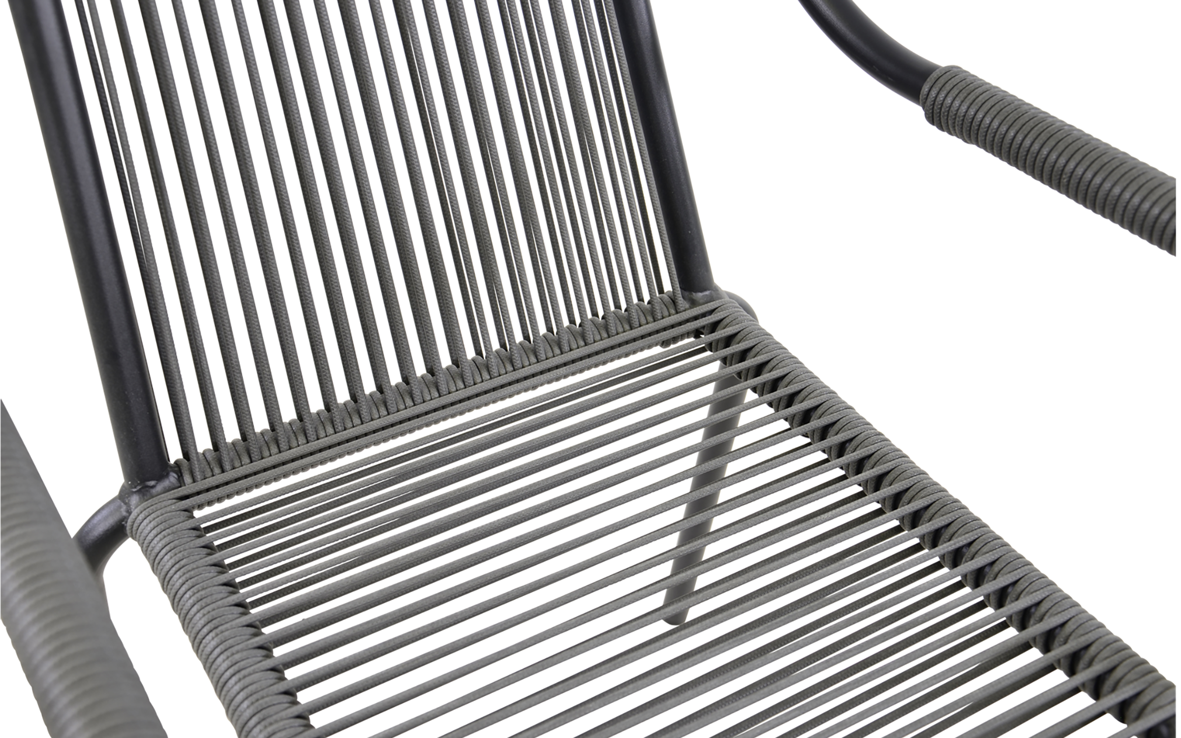 Siedzisko i oparcie: technorattan (splot okrągły 5 mm), kolor ciemnoszary, odporny na wilgoć i promieniowanie UV.