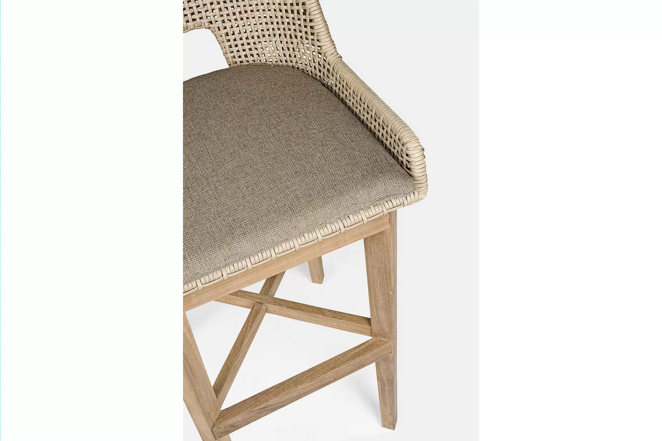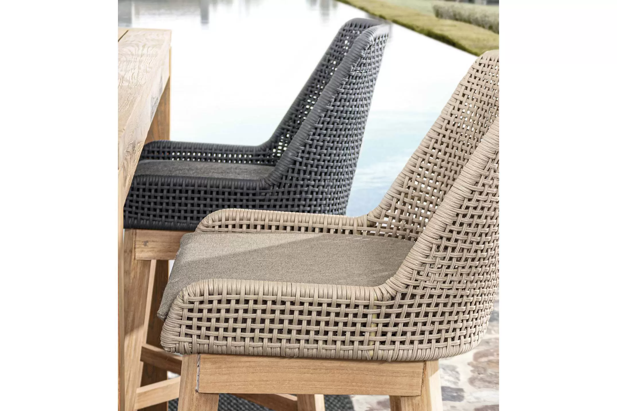 2x krzesło stołowe ogrodowe nowoczesne z podstawą z drewna teak i siedziskami wyplatanymi liną olefinową.