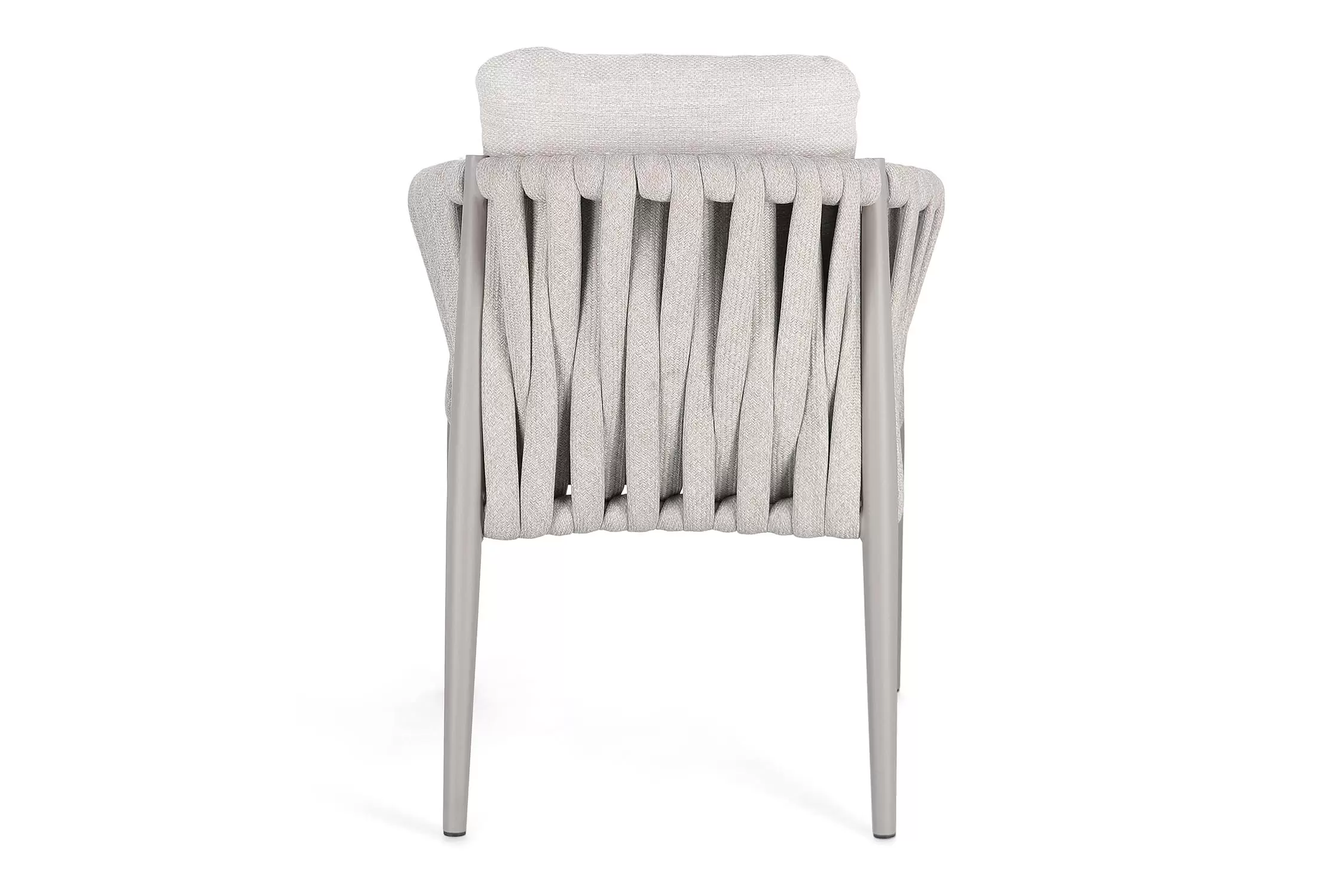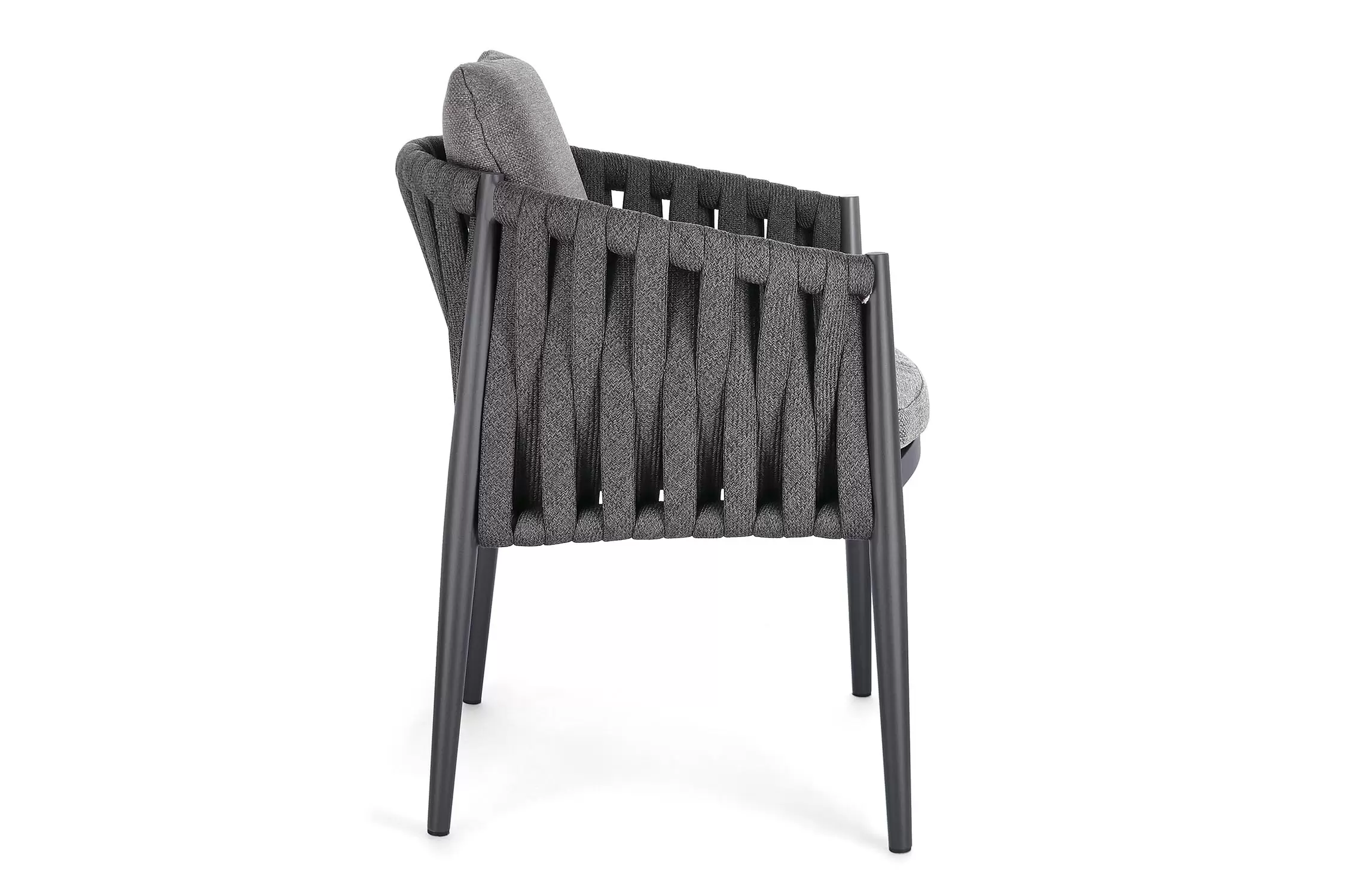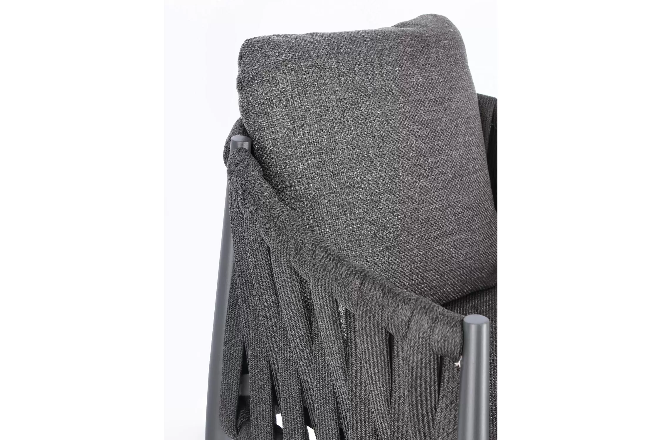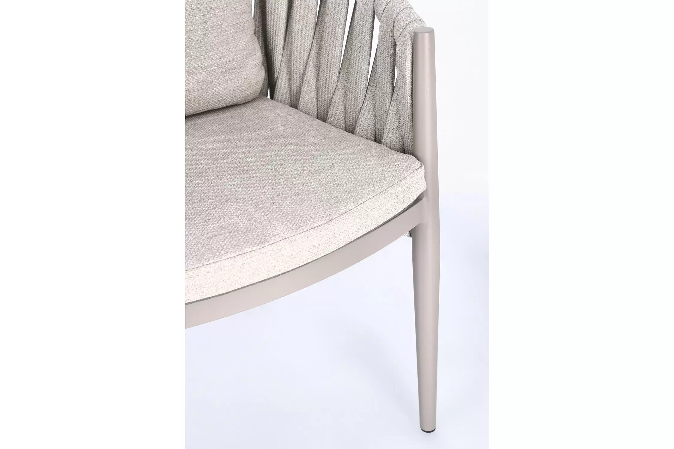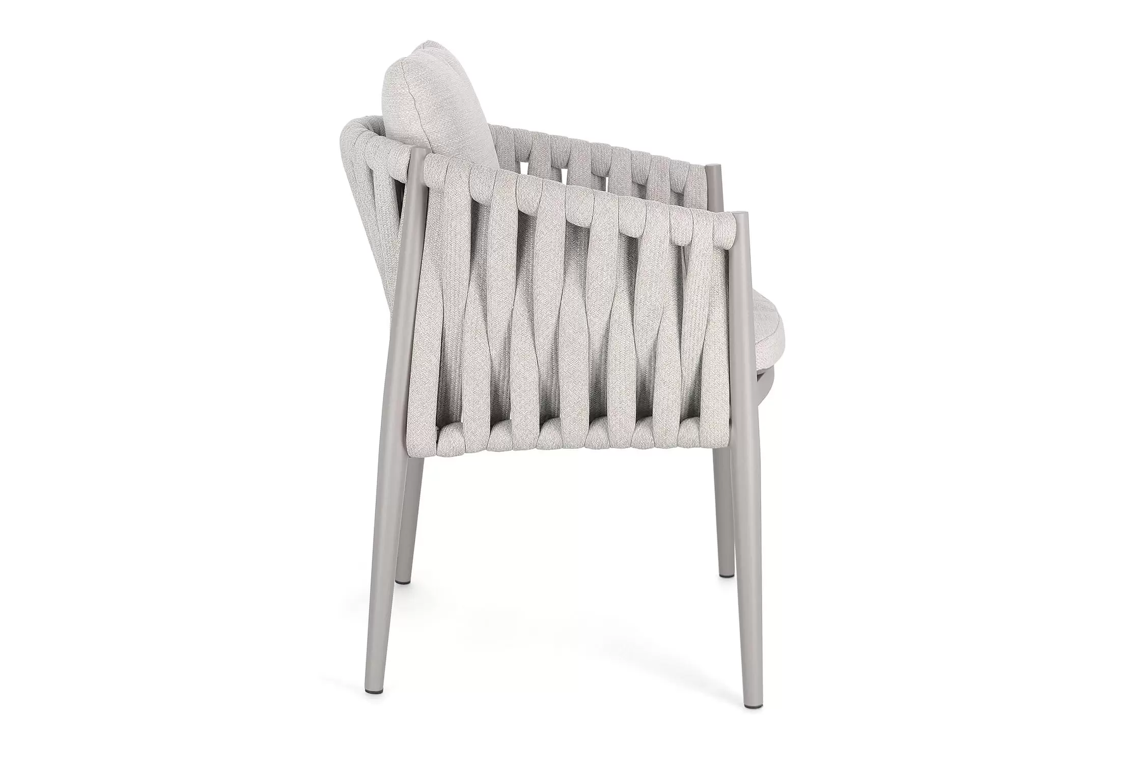 Ekskluzywne krzesło stołowe do użytku na tarasie w oryginalnym i co najważniejsze odpornym na warunki atmosferyczne wykonaniu. Delikatnie wygięte podłokietniki i wygodne oparcie oraz siedzisko w formie miękkich poduszek, zostało wykonane z wodoodpornej tkaniny Olefin. Materiał, która jest barwioną na wskroś tkaniną akrylową odporną na zabrudzenia, jest również odporna na działanie wody i pleśni. Ciekawą formą urozmaicenia budowy krzesła jest zastosowanie warkoczowego splotu po bokach i z tyłu stelaża. Stelaż krzesła, a także nogi wykonano z aluminium w malowaniu proszkowym. Wykorzystano tu system QDF, który jest bardzo odpornym na warunki atmosferyczne wypełnieniem poduch lub siedzisk, z wysokiej jakości szybkoschnącej pianki tapicerskiej Quick Dry Foam o właściwościach antybakteryjnych. Wytrzymałość materiałów, a także odporność na korozję, umożliwiają zastosowanie zarówno w domu jak i na zewnątrz - w ogrodzie lub na tarasie. Meble należy czyścić nie wykorzystując silnych środków chemicznych.
