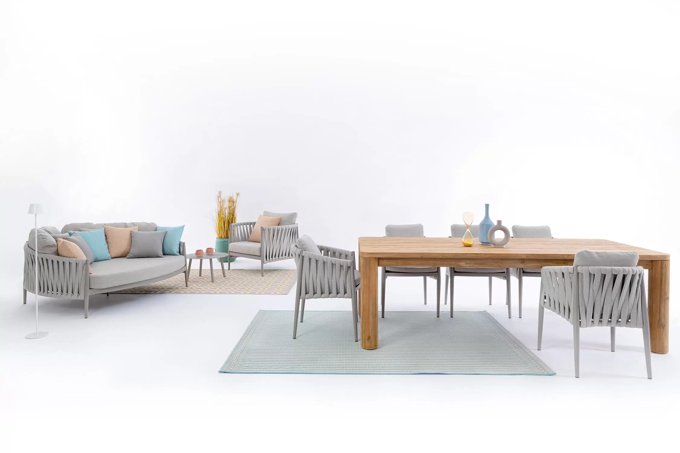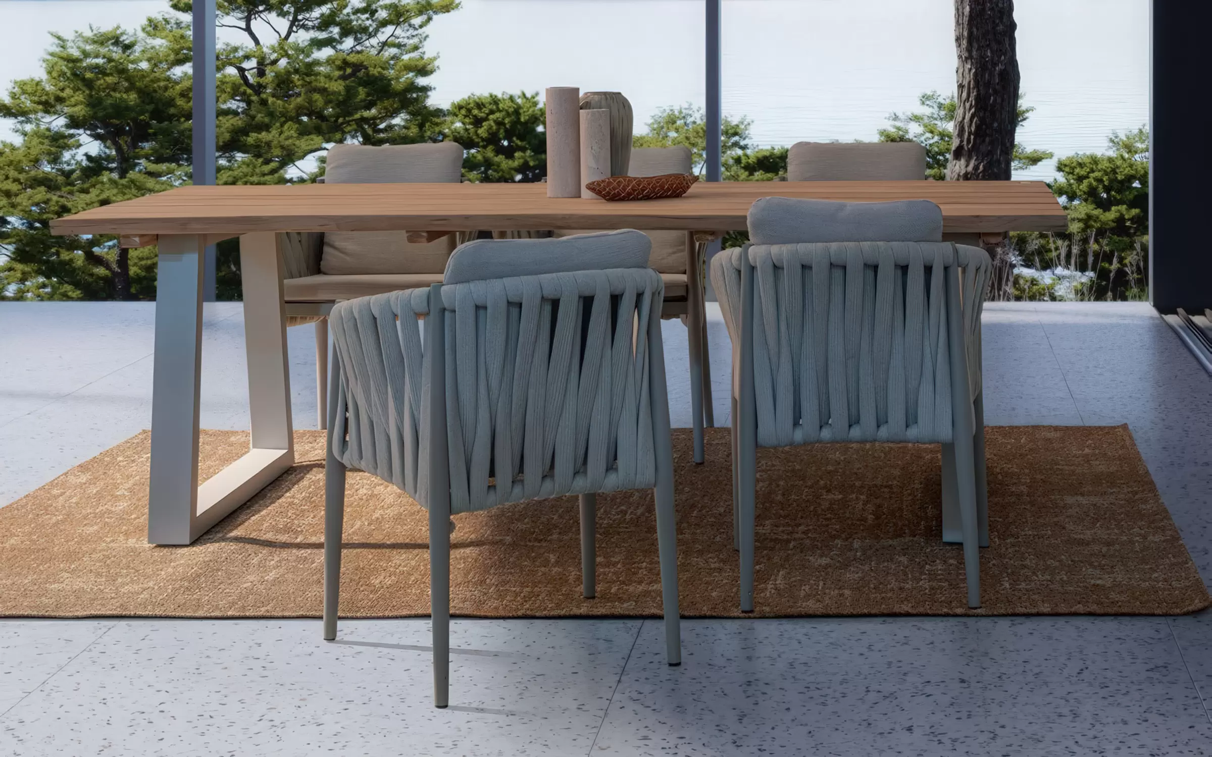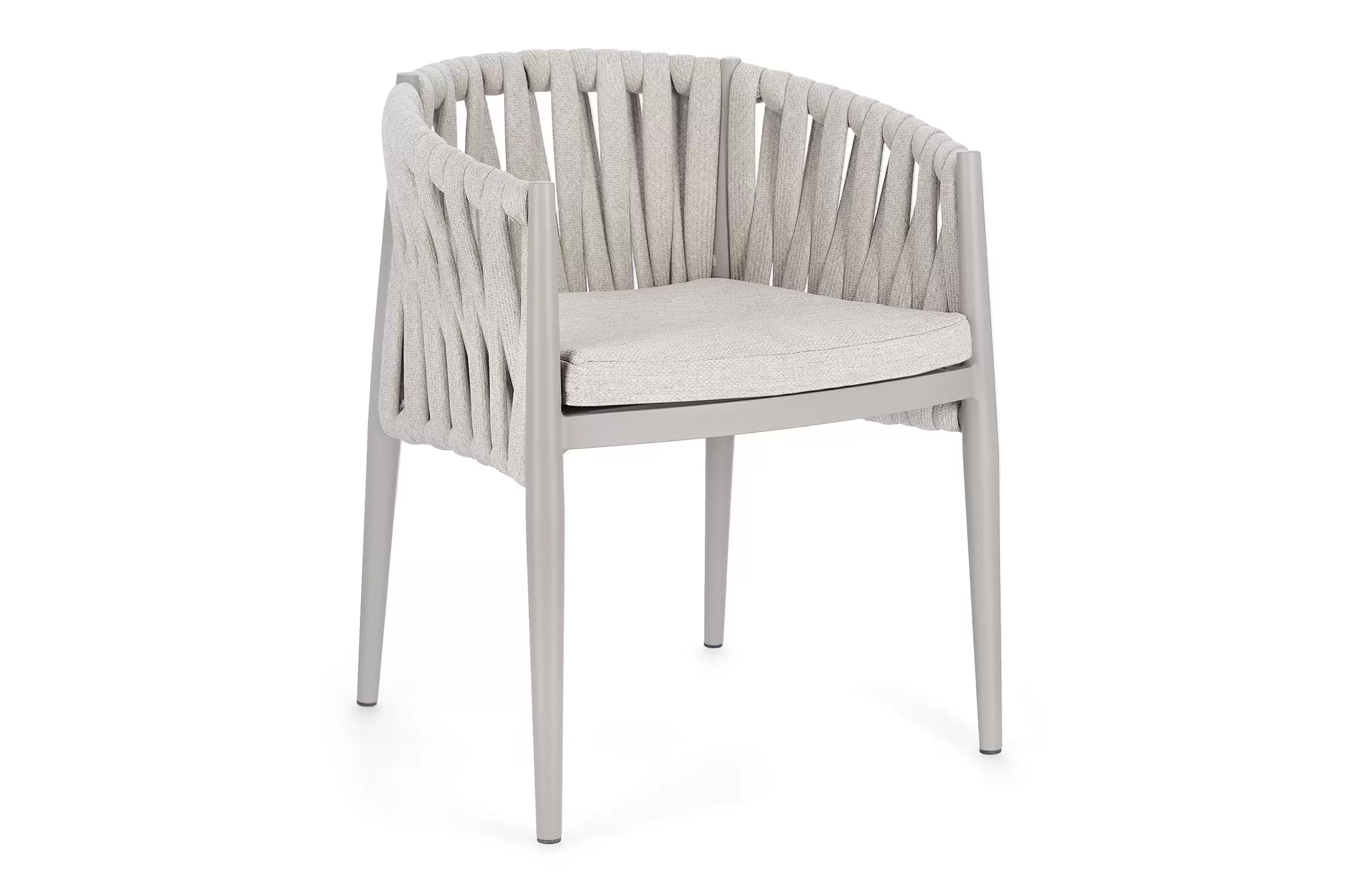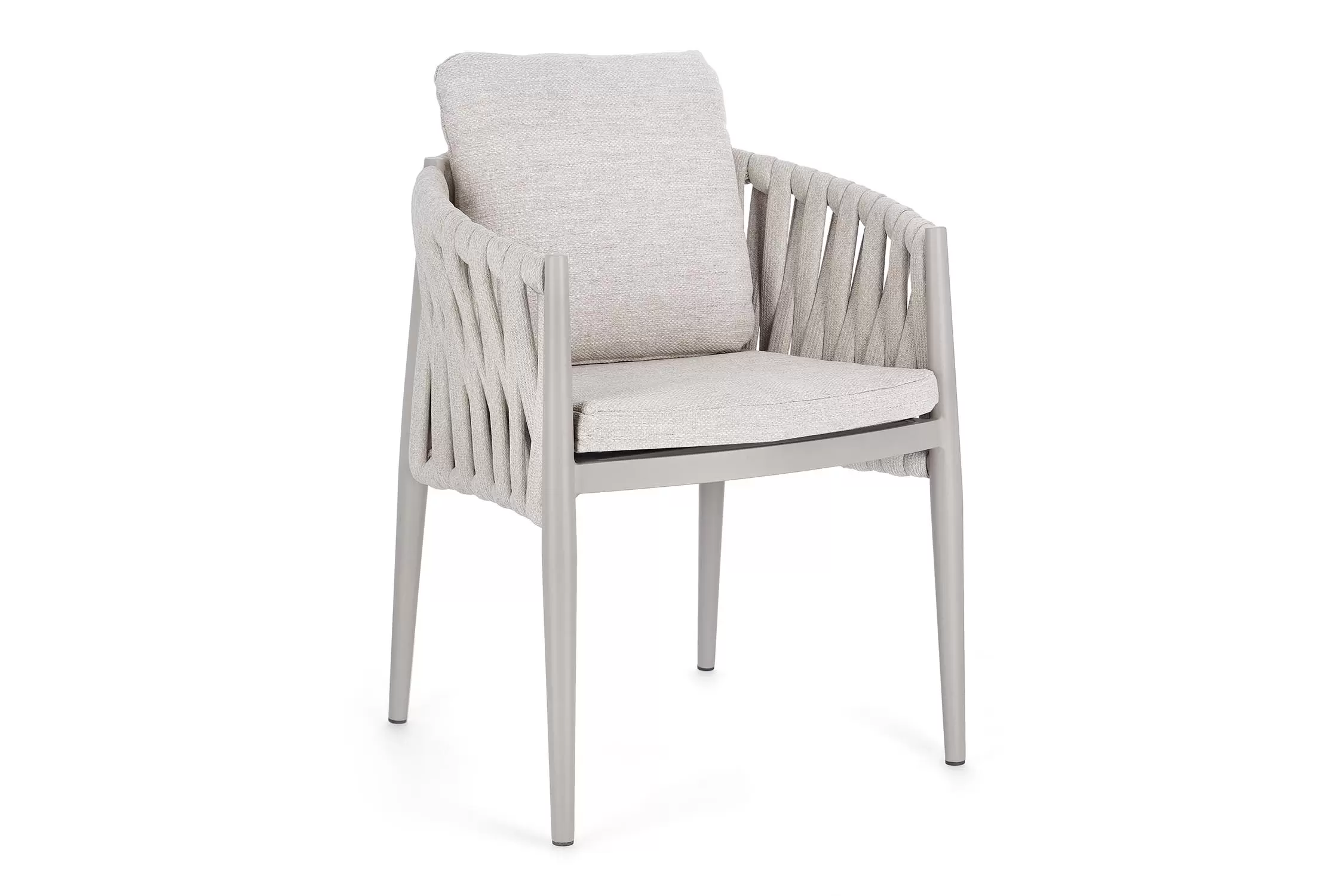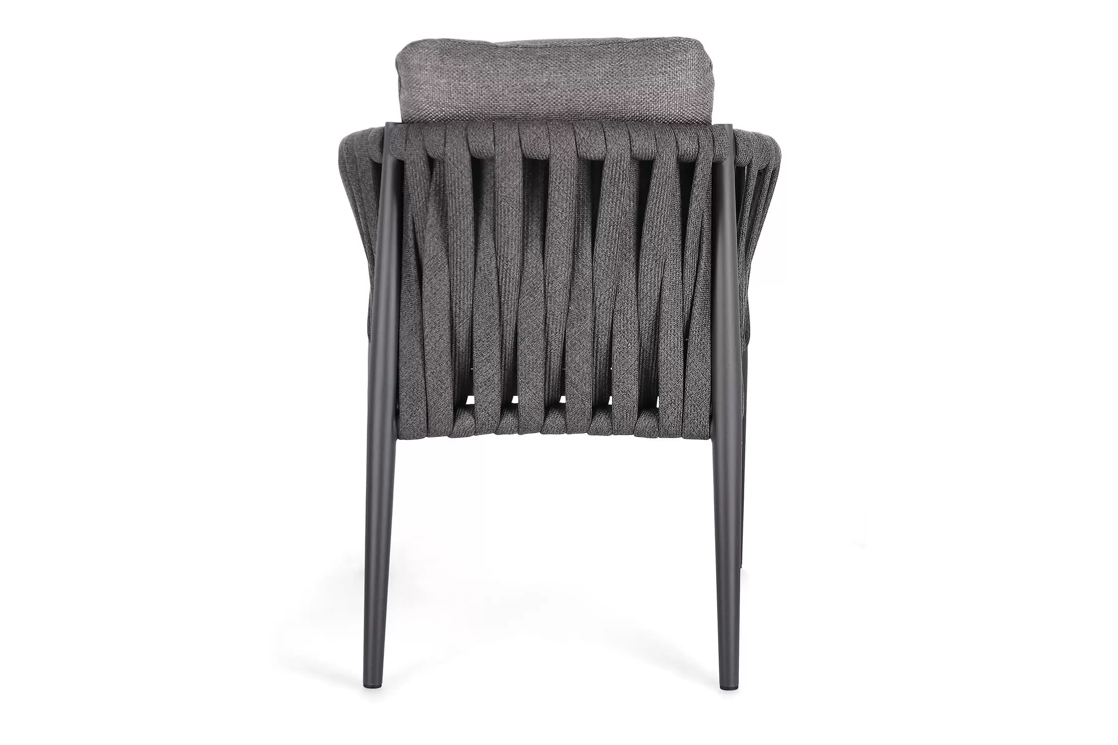 Ekskluzywne krzesło stołowe do użytku na tarasie w oryginalnym i co najważniejsze odpornym na warunki atmosferyczne wykonaniu. Delikatnie wygięte podłokietniki i wygodne oparcie oraz siedzisko w formie miękkich poduszek, zostało wykonane z wodoodpornej tkaniny Olefin. Materiał, która jest barwioną na wskroś tkaniną akrylową odporną na zabrudzenia, jest również odporna na działanie wody i pleśni. Ciekawą formą urozmaicenia budowy krzesła jest zastosowanie warkoczowego splotu po bokach i z tyłu stelaża. Stelaż krzesła, a także nogi wykonano z aluminium w malowaniu proszkowym. Wykorzystano tu system QDF, który jest bardzo odpornym na warunki atmosferyczne wypełnieniem poduch lub siedzisk, z wysokiej jakości szybkoschnącej pianki tapicerskiej Quick Dry Foam o właściwościach antybakteryjnych. Wytrzymałość materiałów, a także odporność na korozję, umożliwiają zastosowanie zarówno w domu jak i na zewnątrz - w ogrodzie lub na tarasie. Meble należy czyścić nie wykorzystując silnych środków chemicznych.
