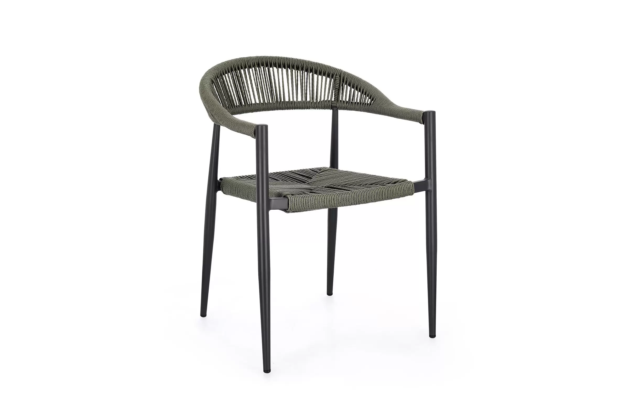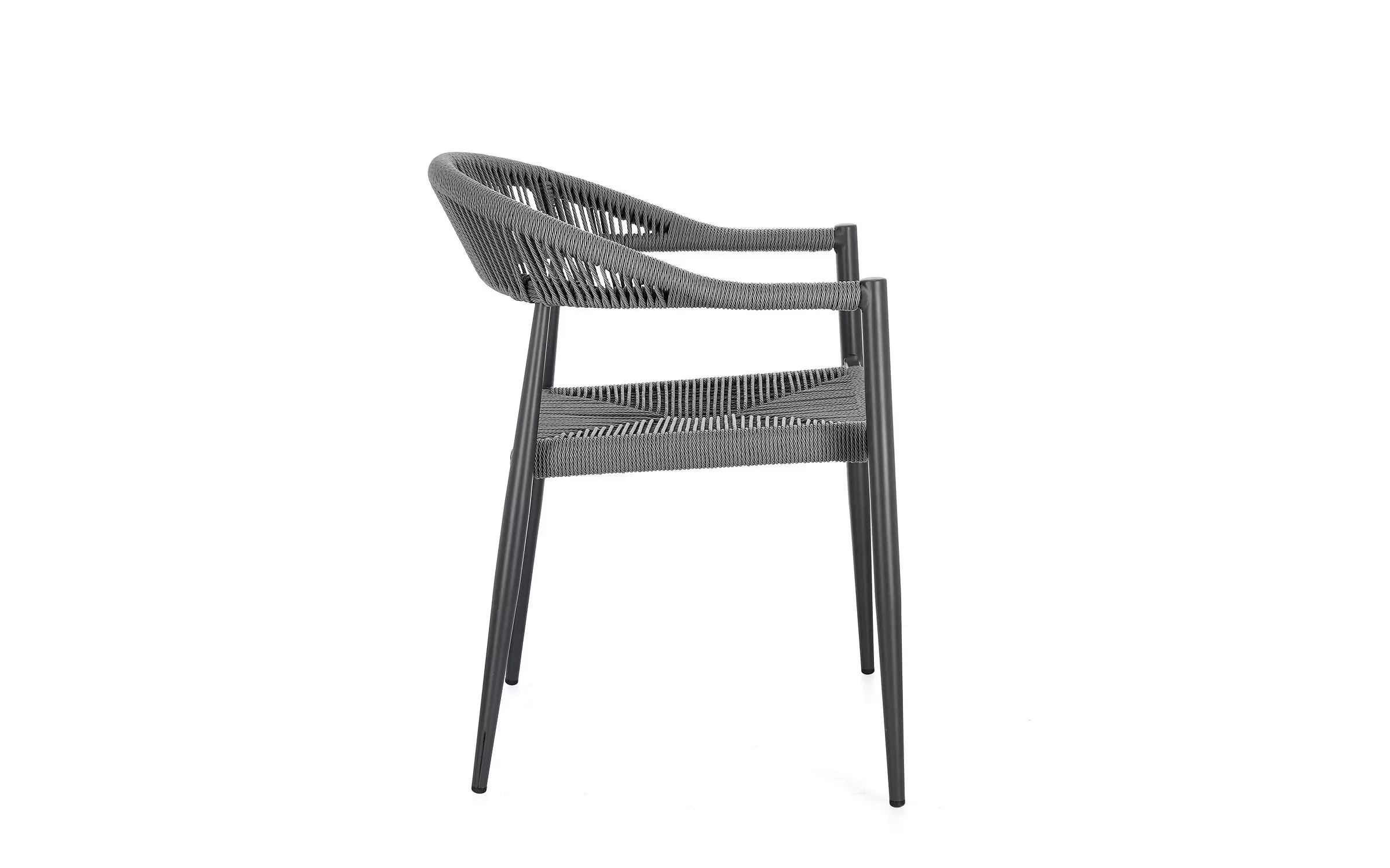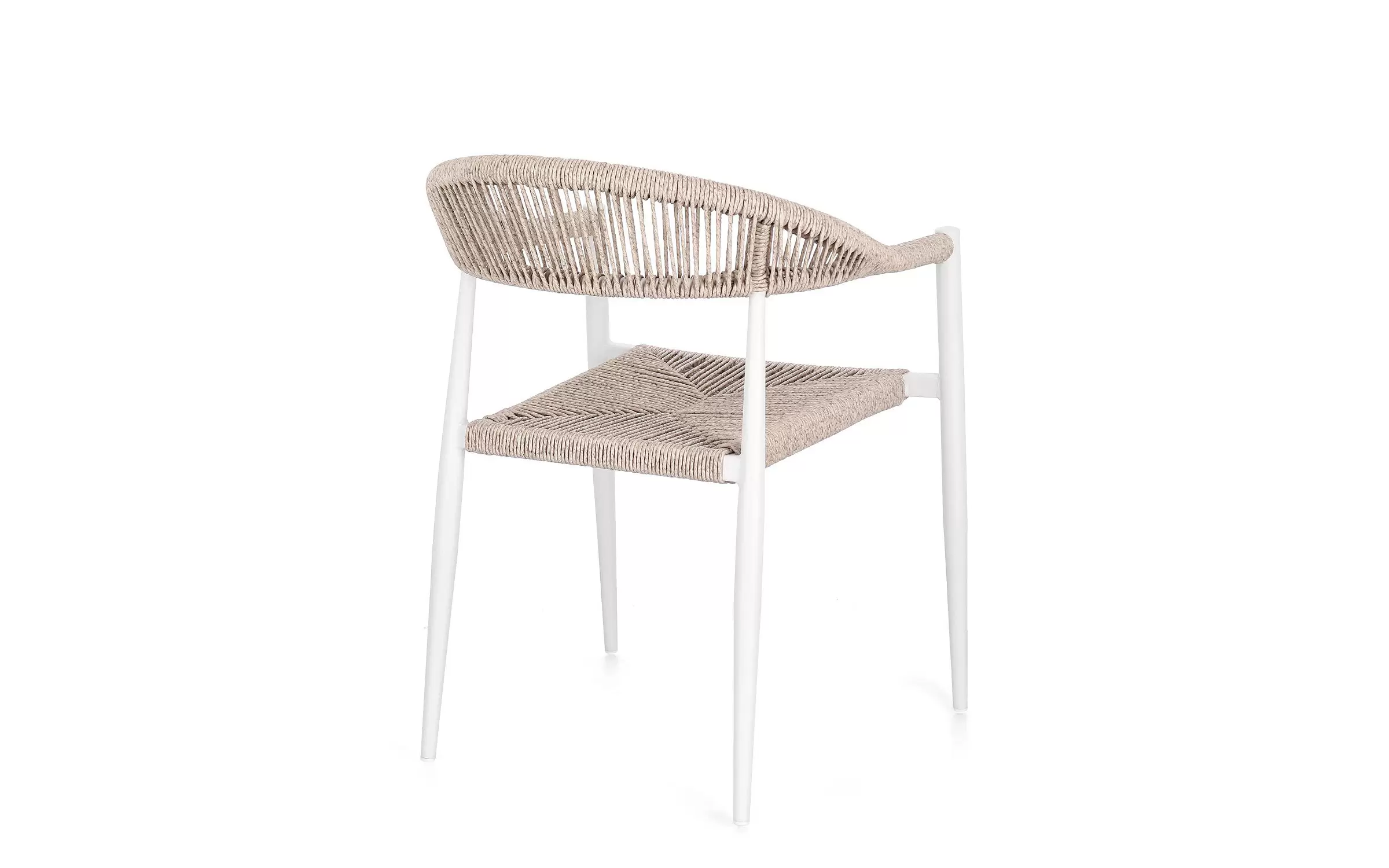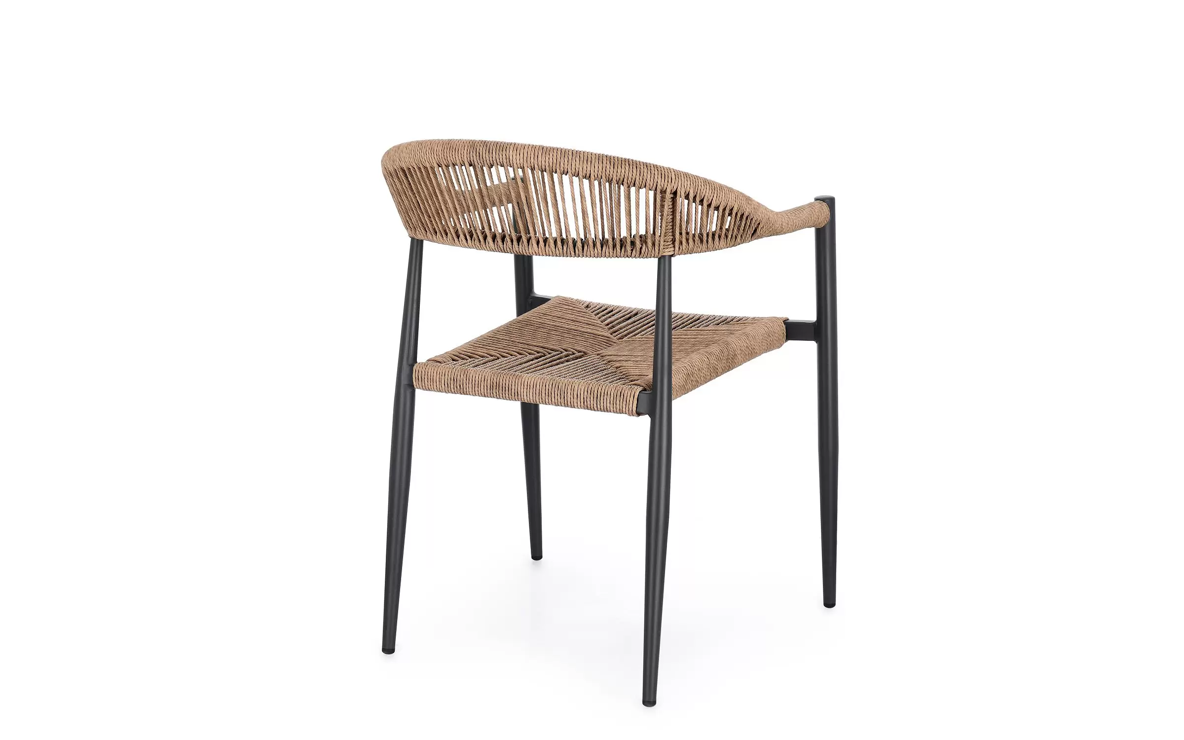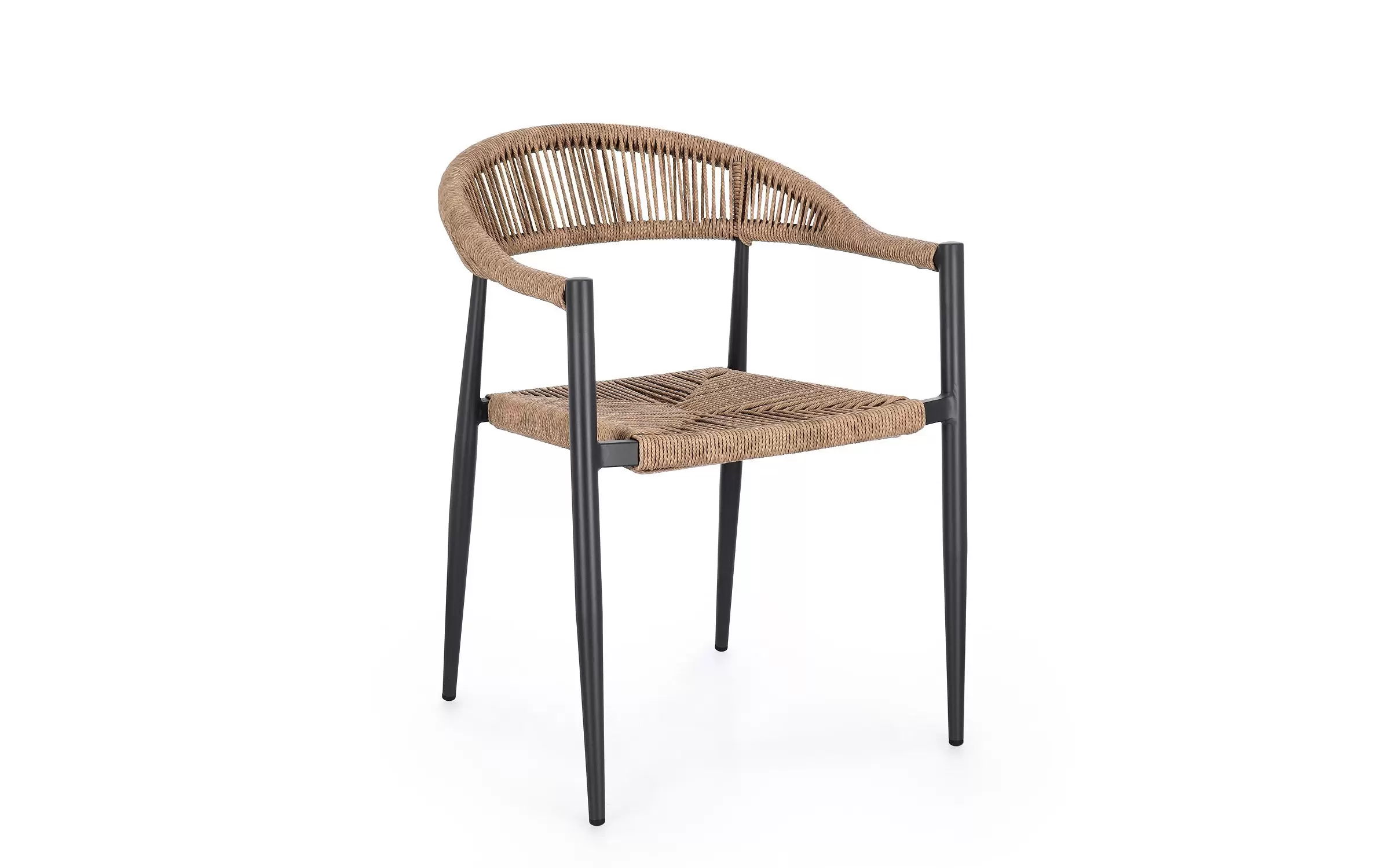 Krzesło o lekkiej konstrukcji wpasowujący się w nowoczesny styl na tarasie. Aluminiowa podstawa opleciona technorattanem zwijanym w stylu liścia bananowca, W komplecie poduszka mocowana wstążkami do siedzenia.