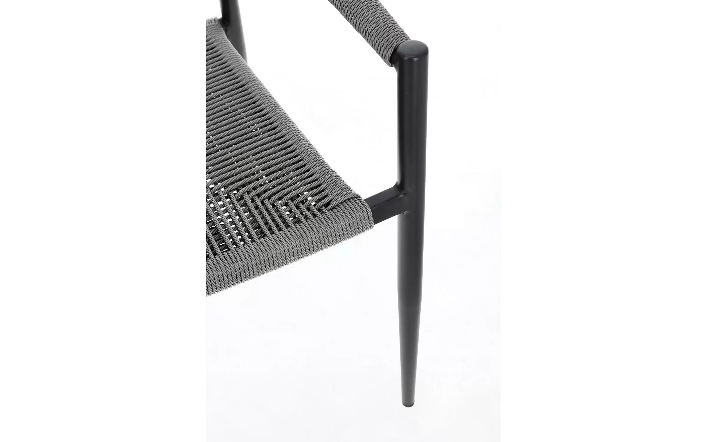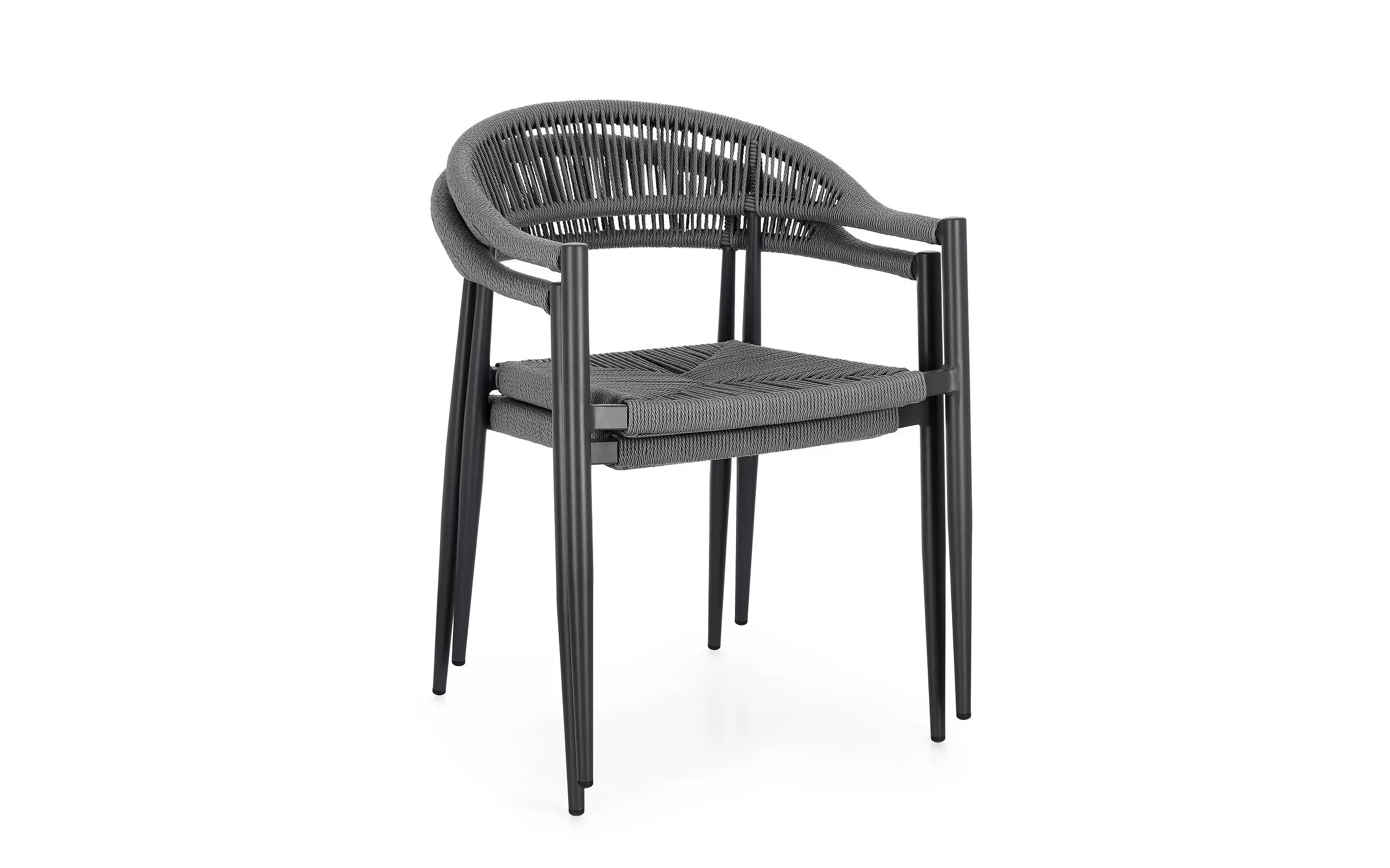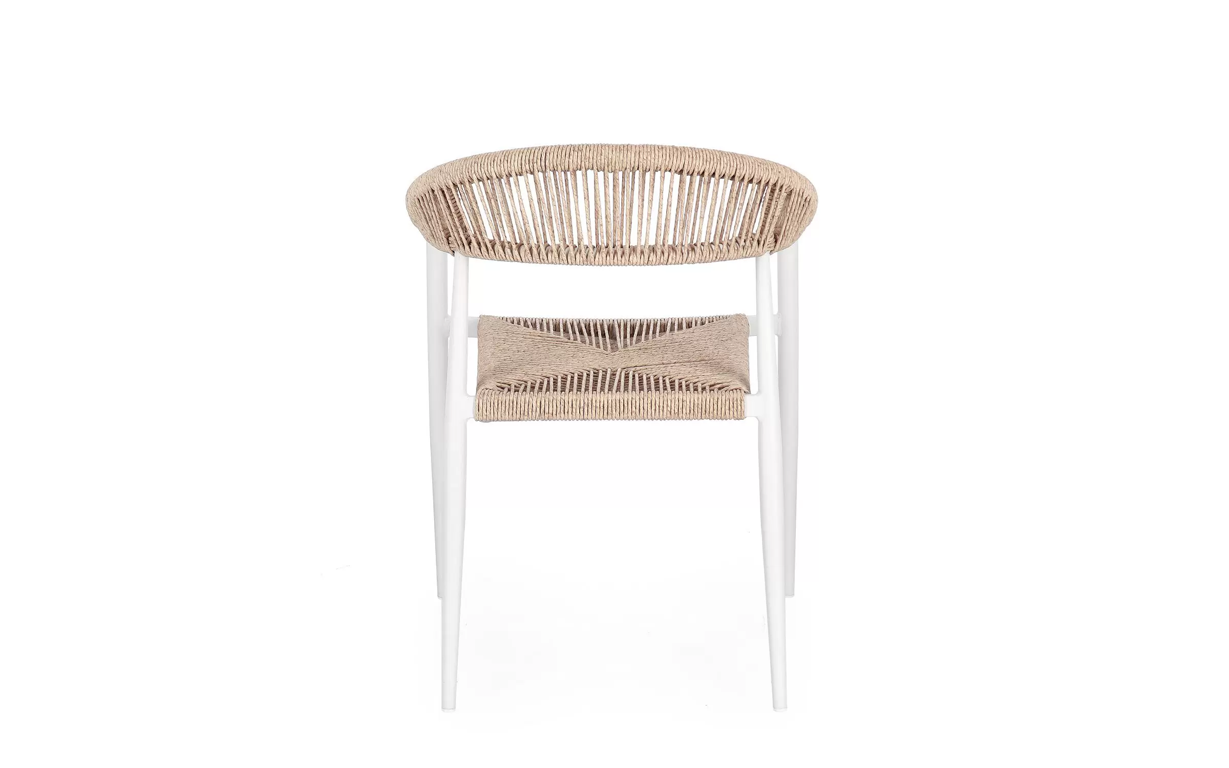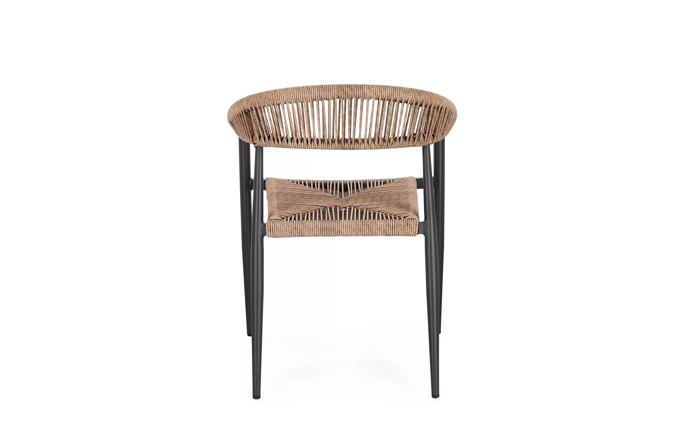 Krzesło o lekkiej konstrukcji wpasowujący się w nowoczesny styl na tarasie. Aluminiowa podstawa opleciona technorattanem zwijanym w stylu liścia bananowca, W komplecie poduszka mocowana wstążkami do siedzenia.