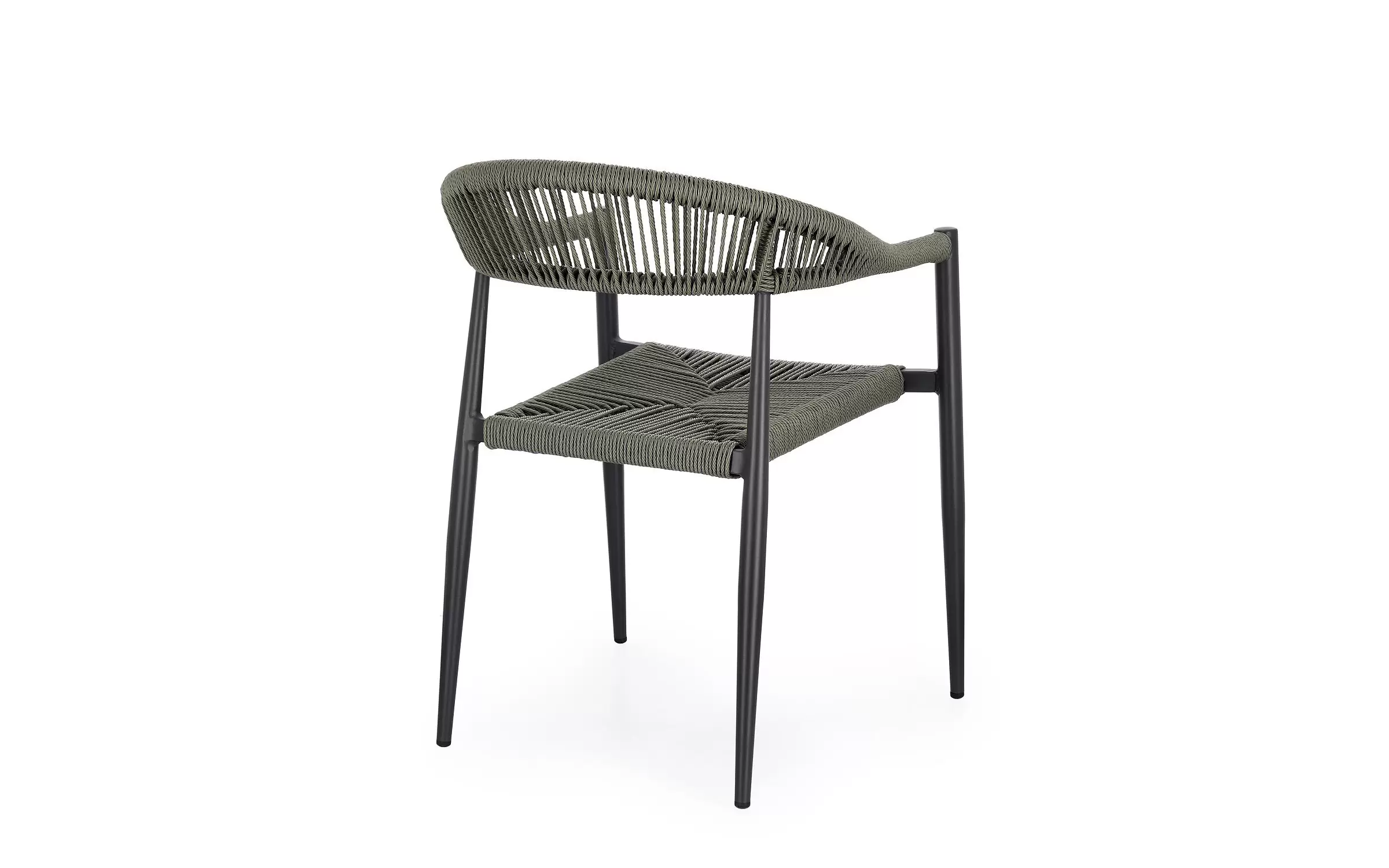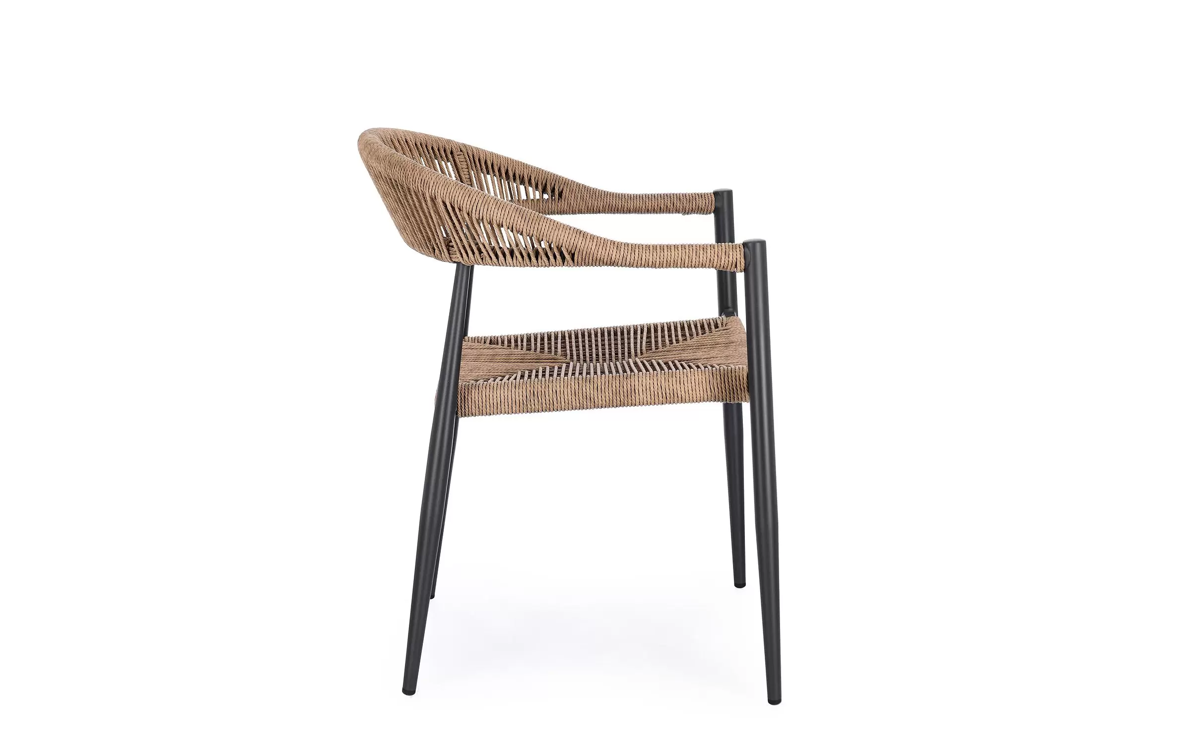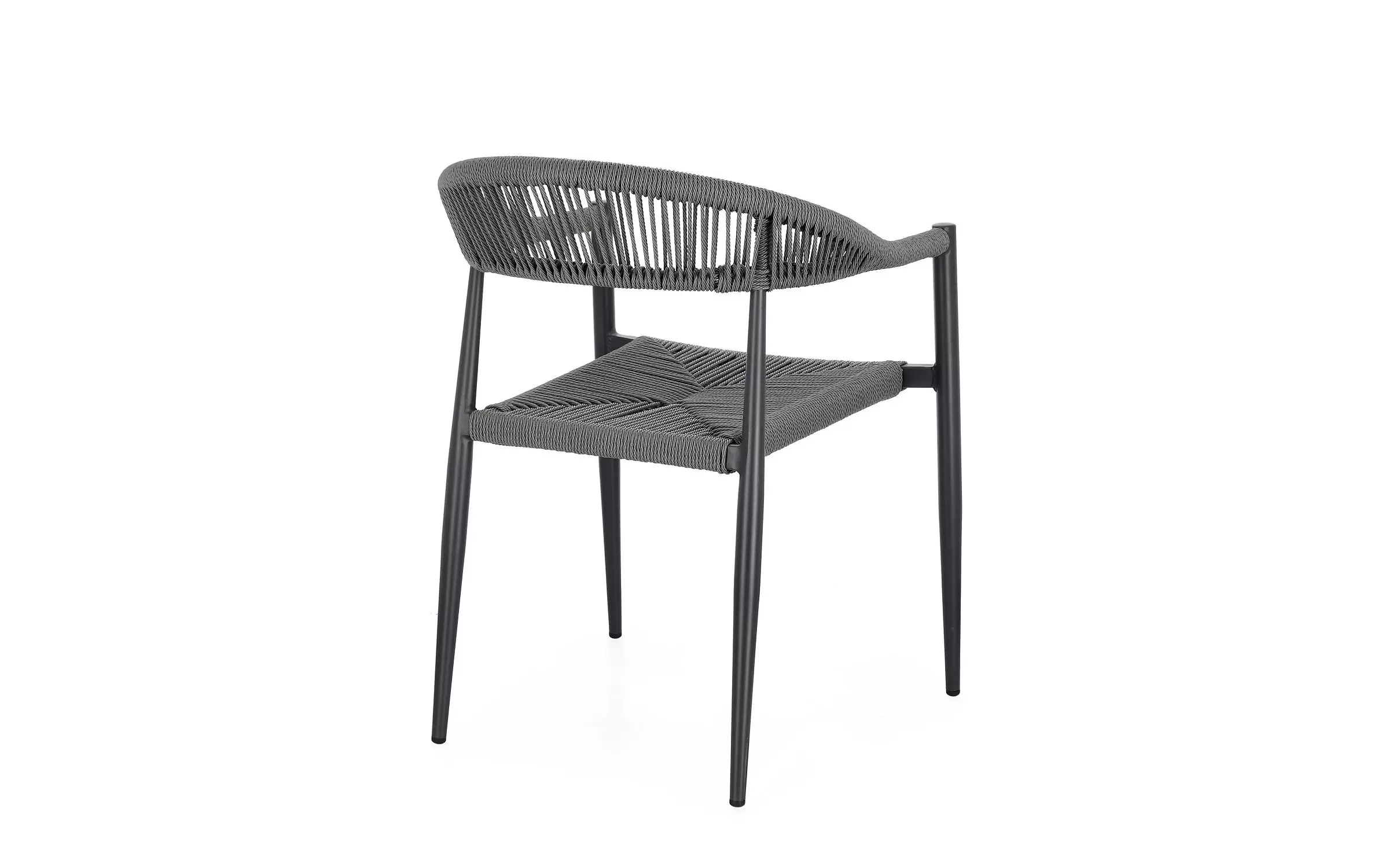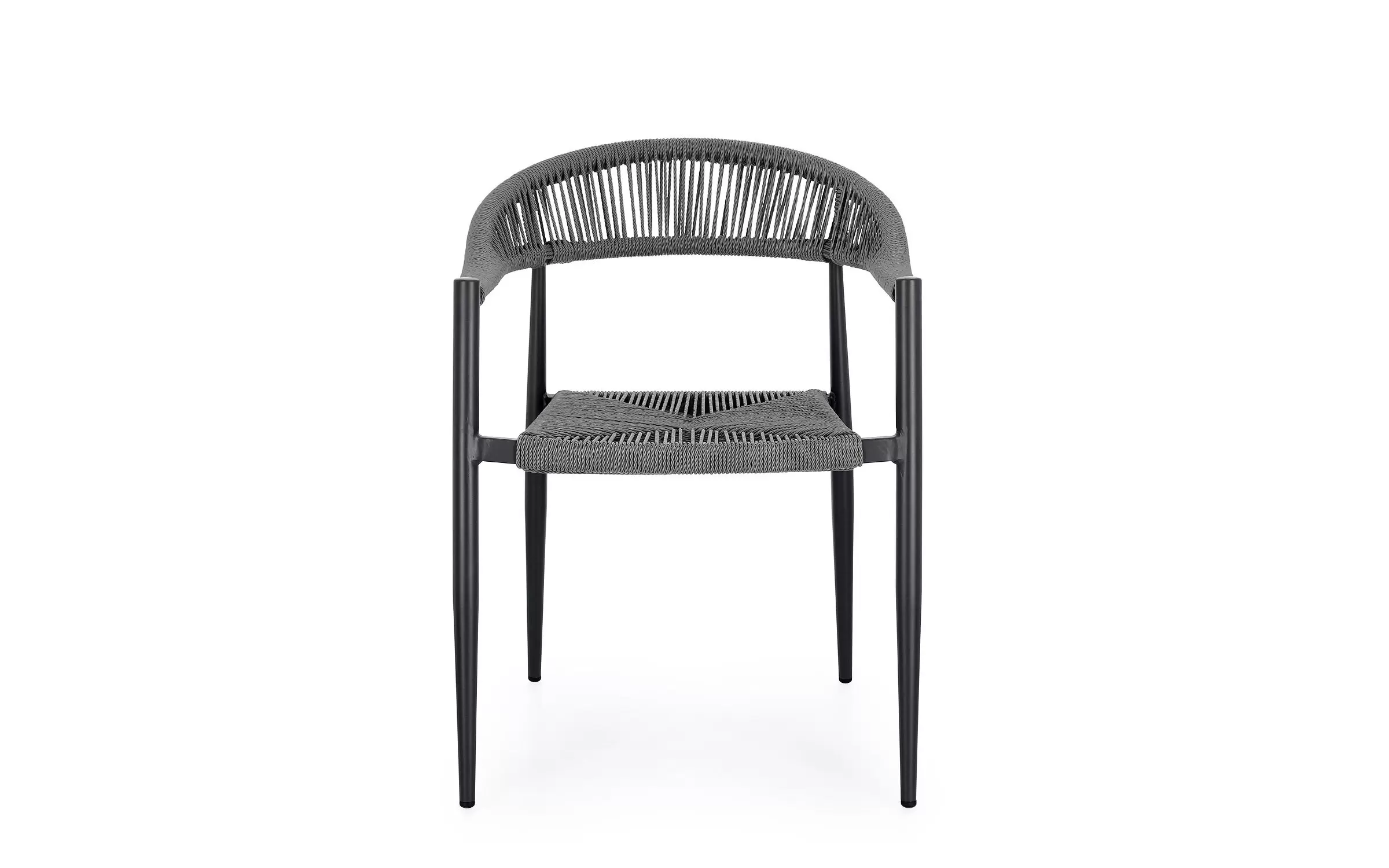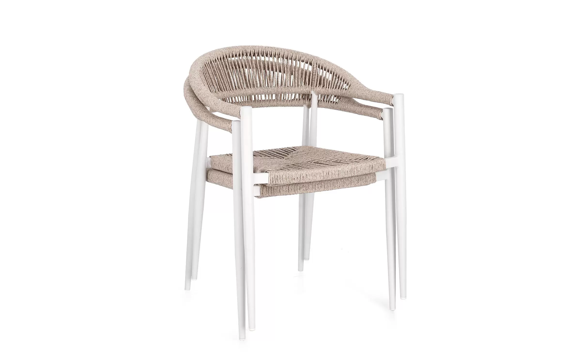Krzesło o lekkiej konstrukcji wpasowujący się w nowoczesny styl na tarasie. Aluminiowa podstawa opleciona technorattanem zwijanym w stylu liścia bananowca, W komplecie poduszka mocowana wstążkami do siedzenia.