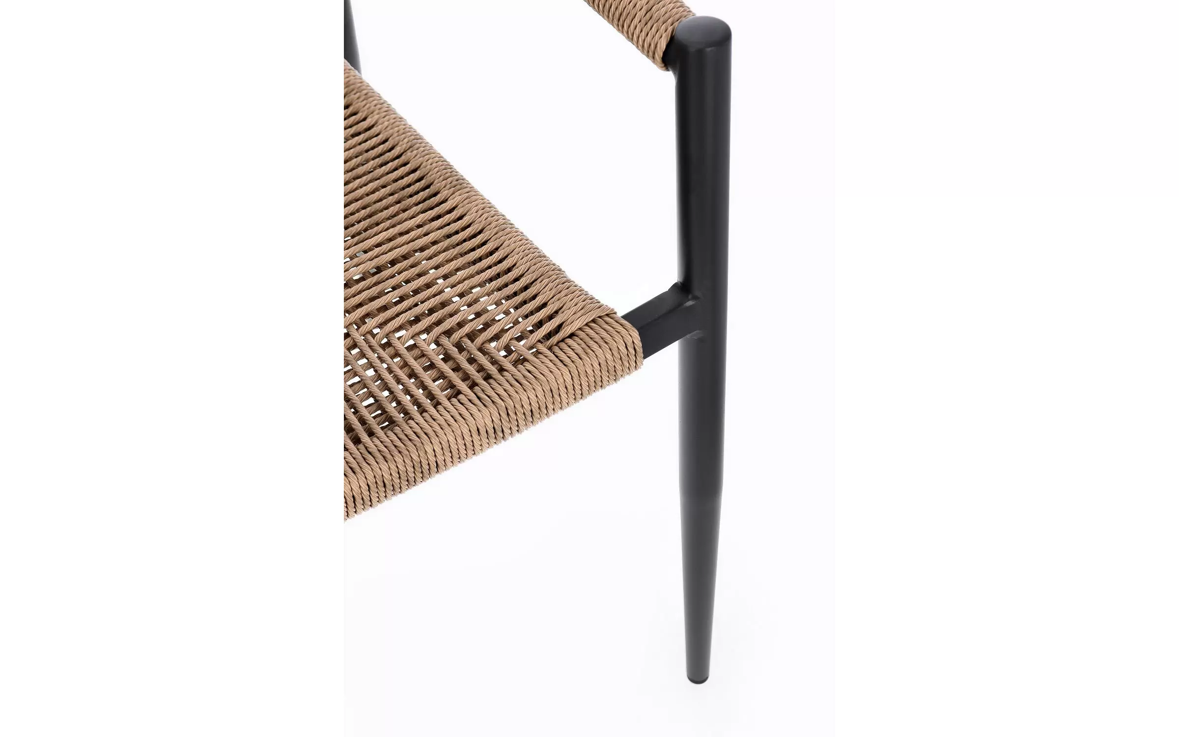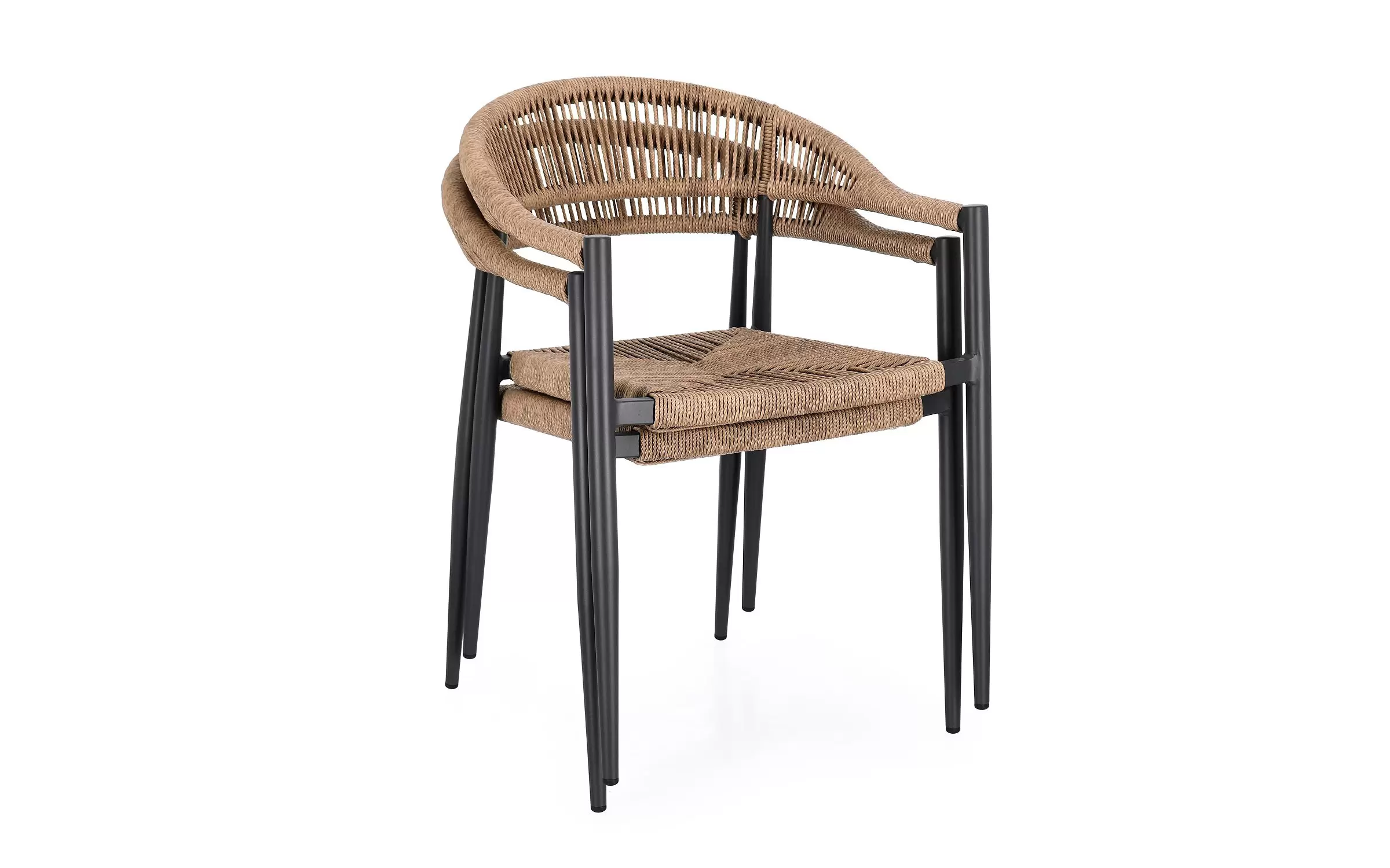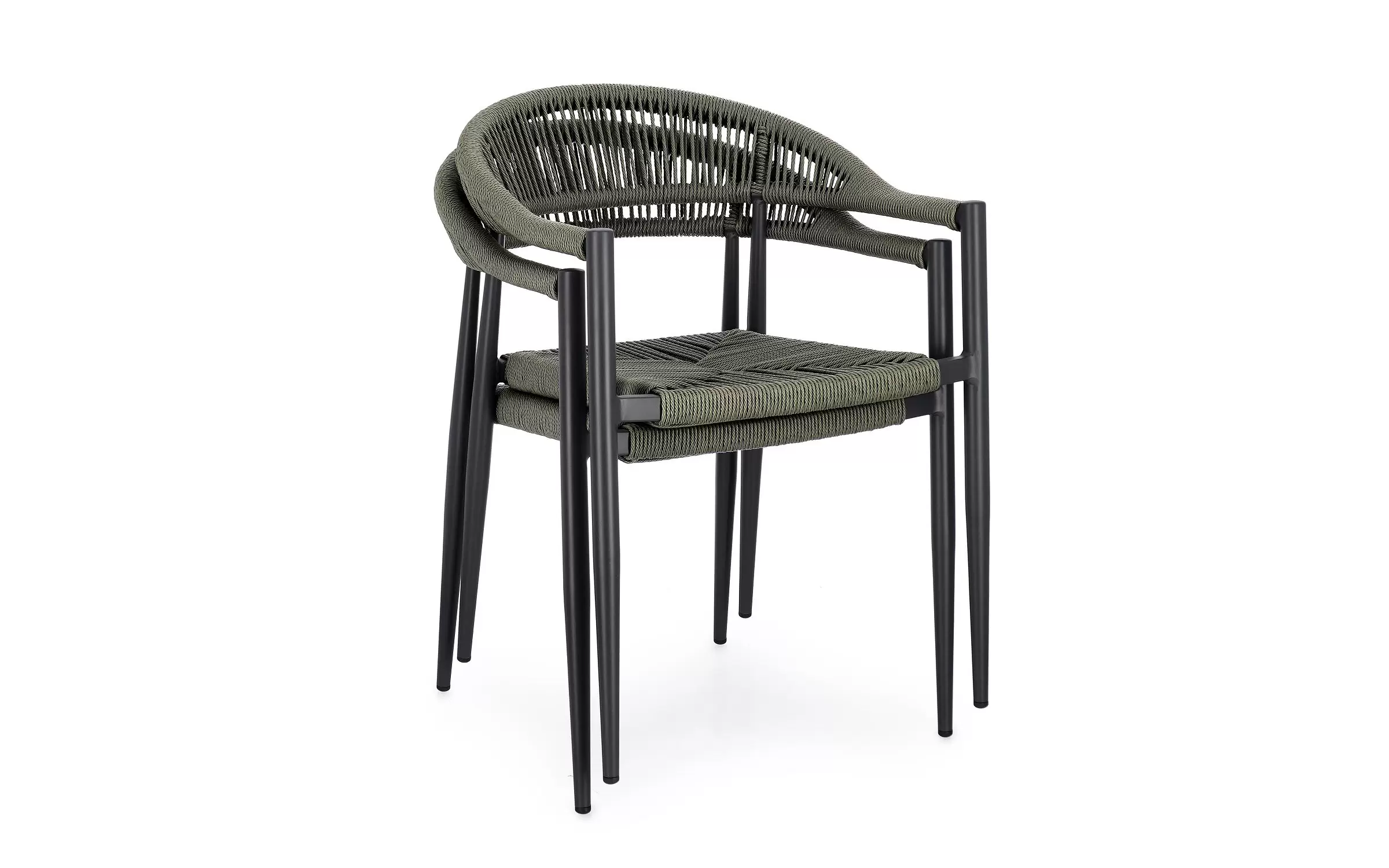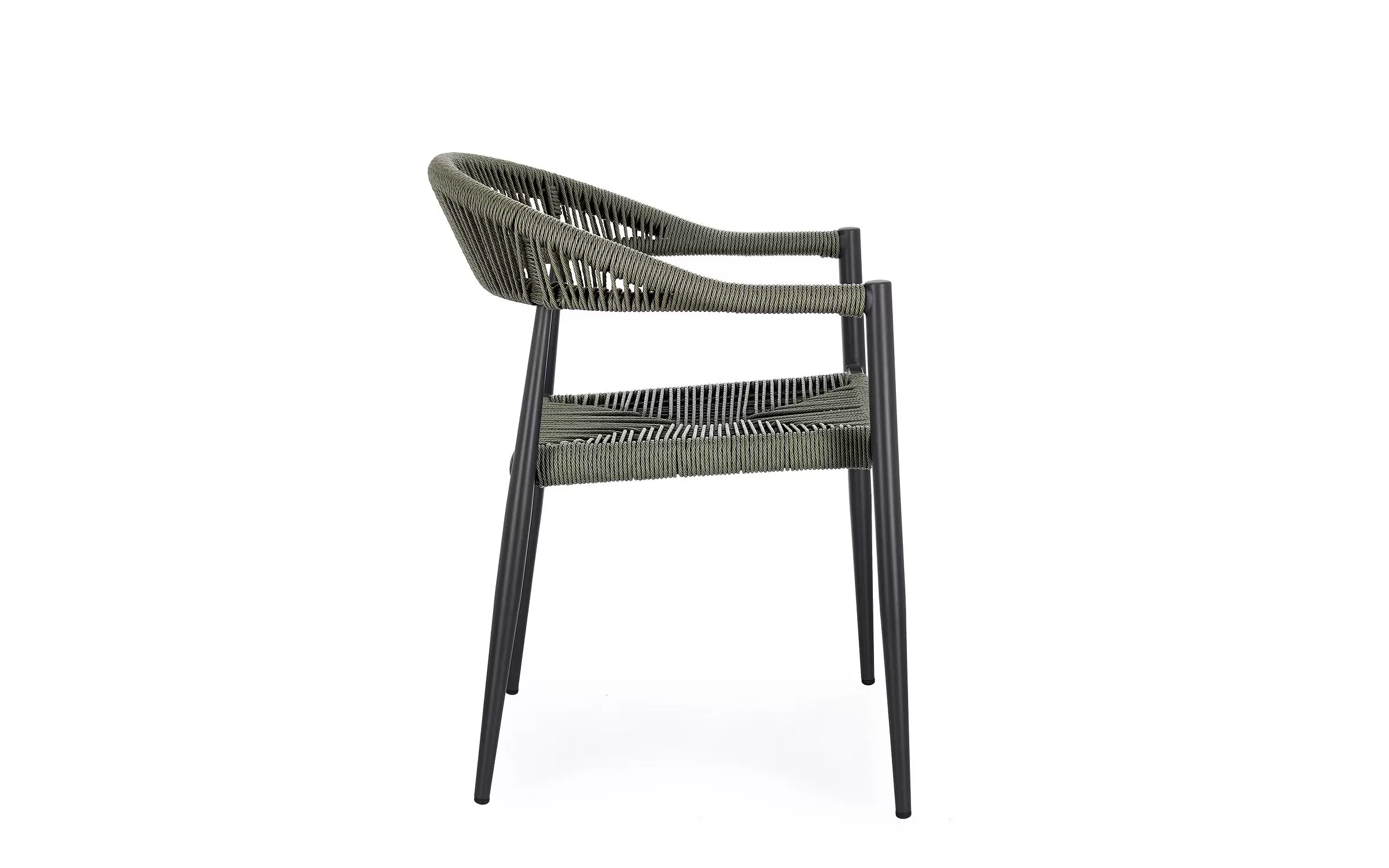 Krzesło o lekkiej konstrukcji wpasowujący się w nowoczesny styl na tarasie. Aluminiowa podstawa opleciona technorattanem zwijanym w stylu liścia bananowca, W komplecie poduszka mocowana wstążkami do siedzenia.