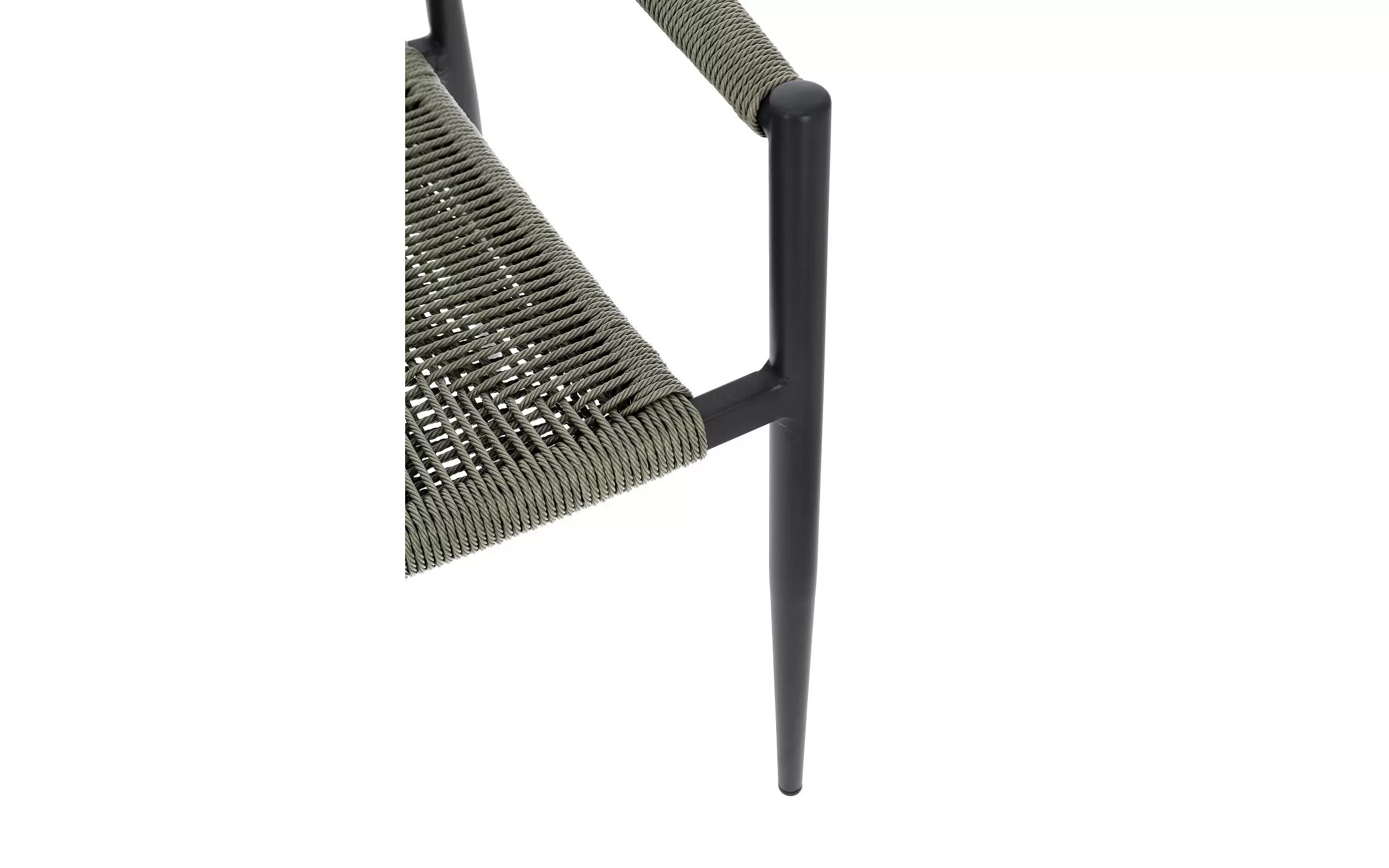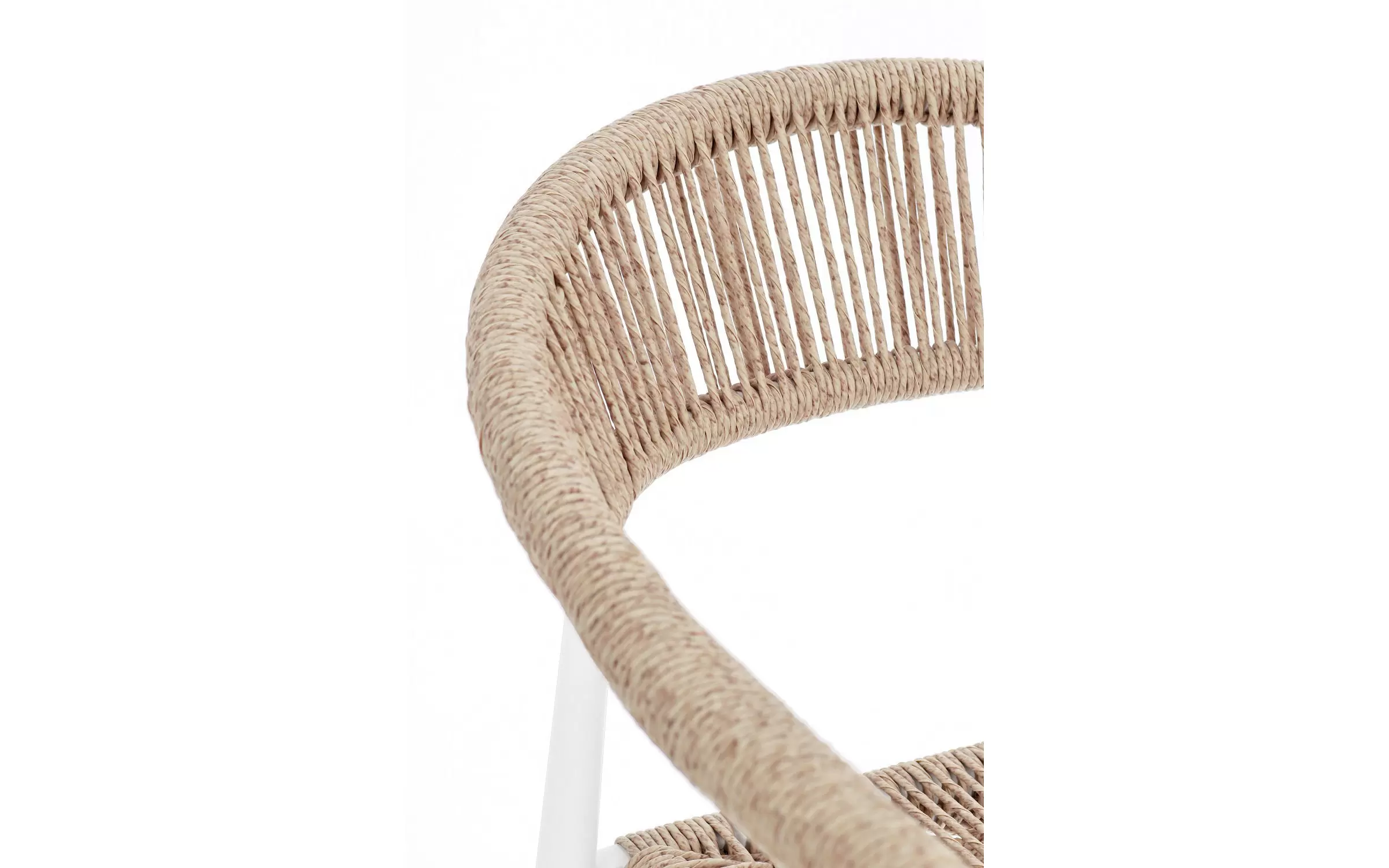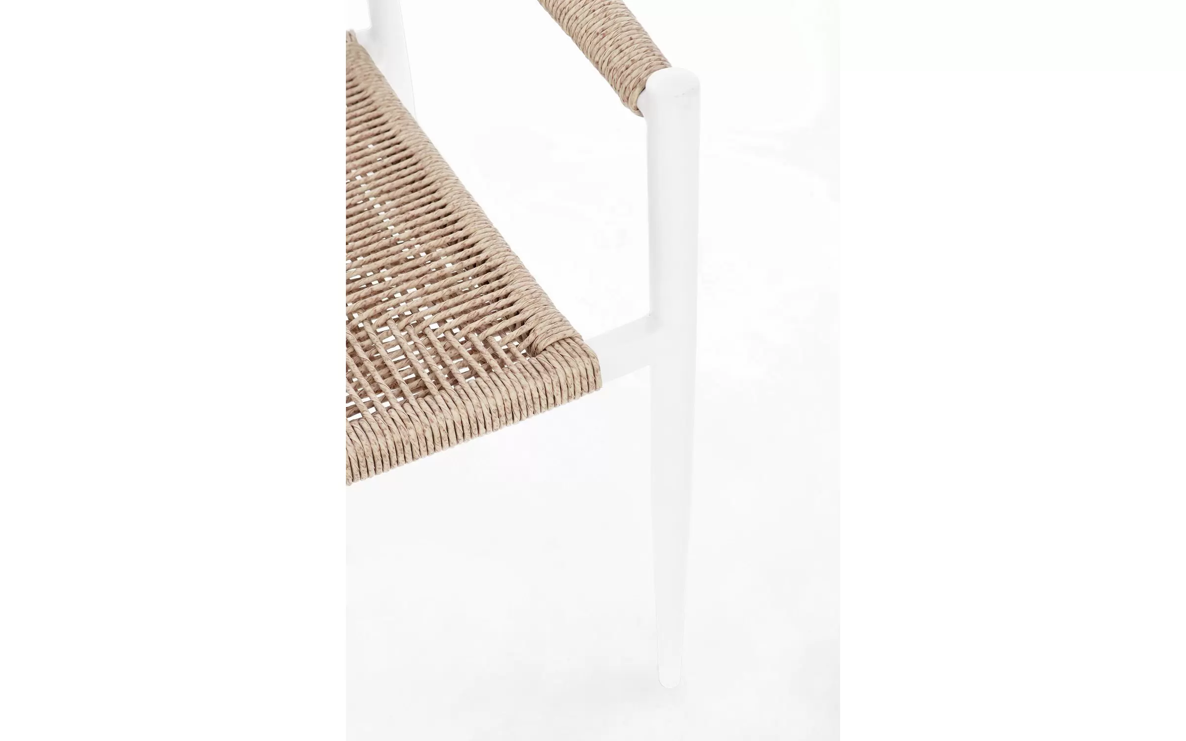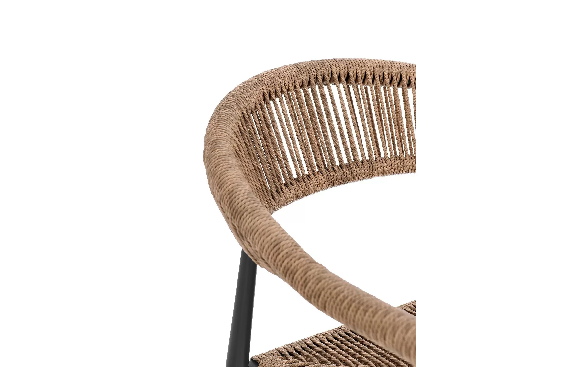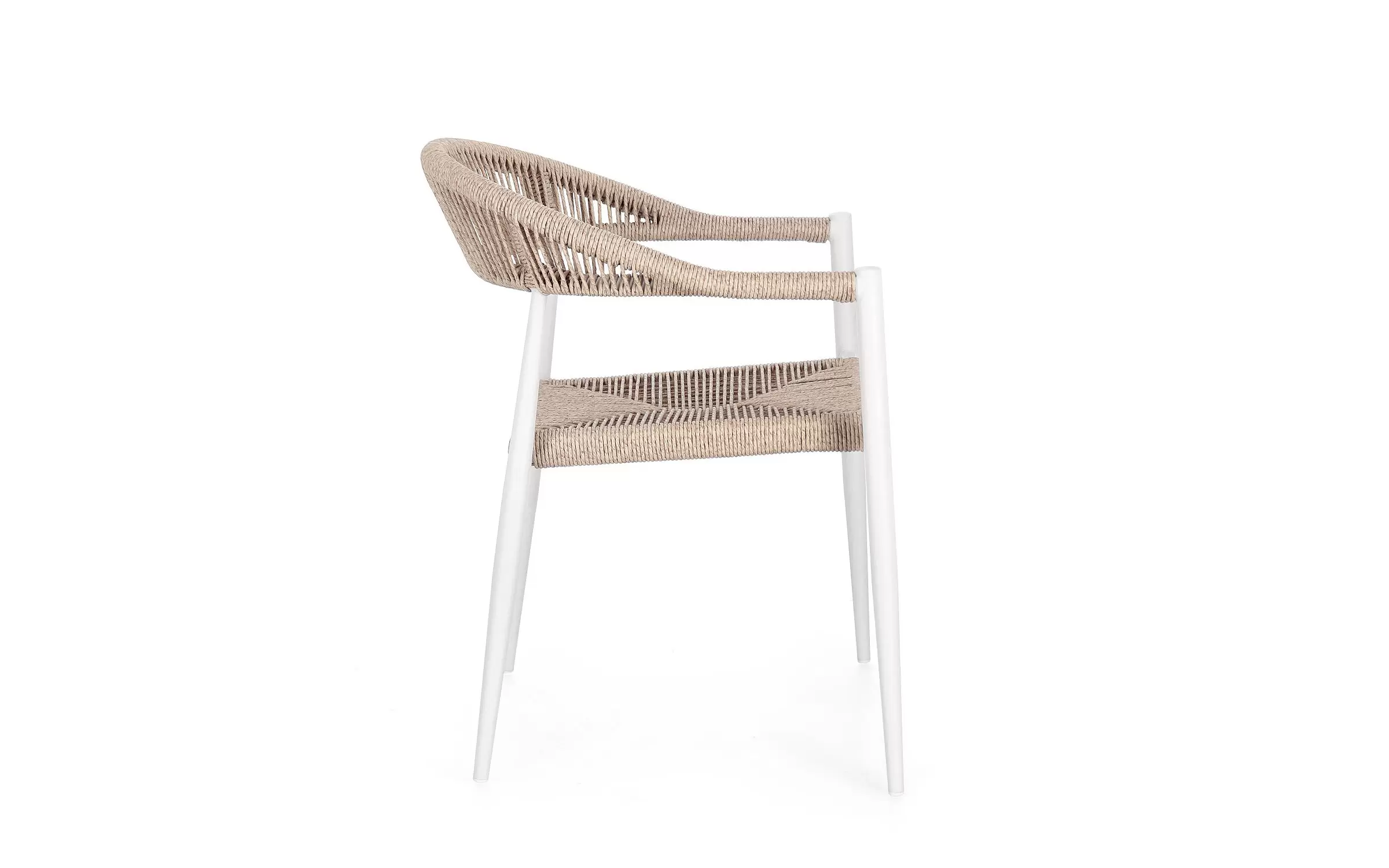 Krzesło o lekkiej konstrukcji wpasowujący się w nowoczesny styl na tarasie. Aluminiowa podstawa opleciona technorattanem zwijanym w stylu liścia bananowca, W komplecie poduszka mocowana wstążkami do siedzenia.