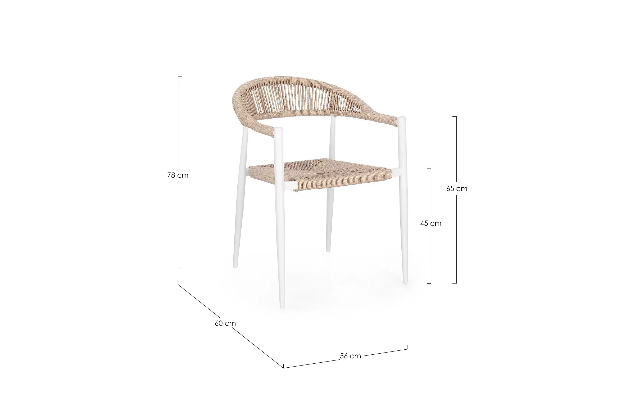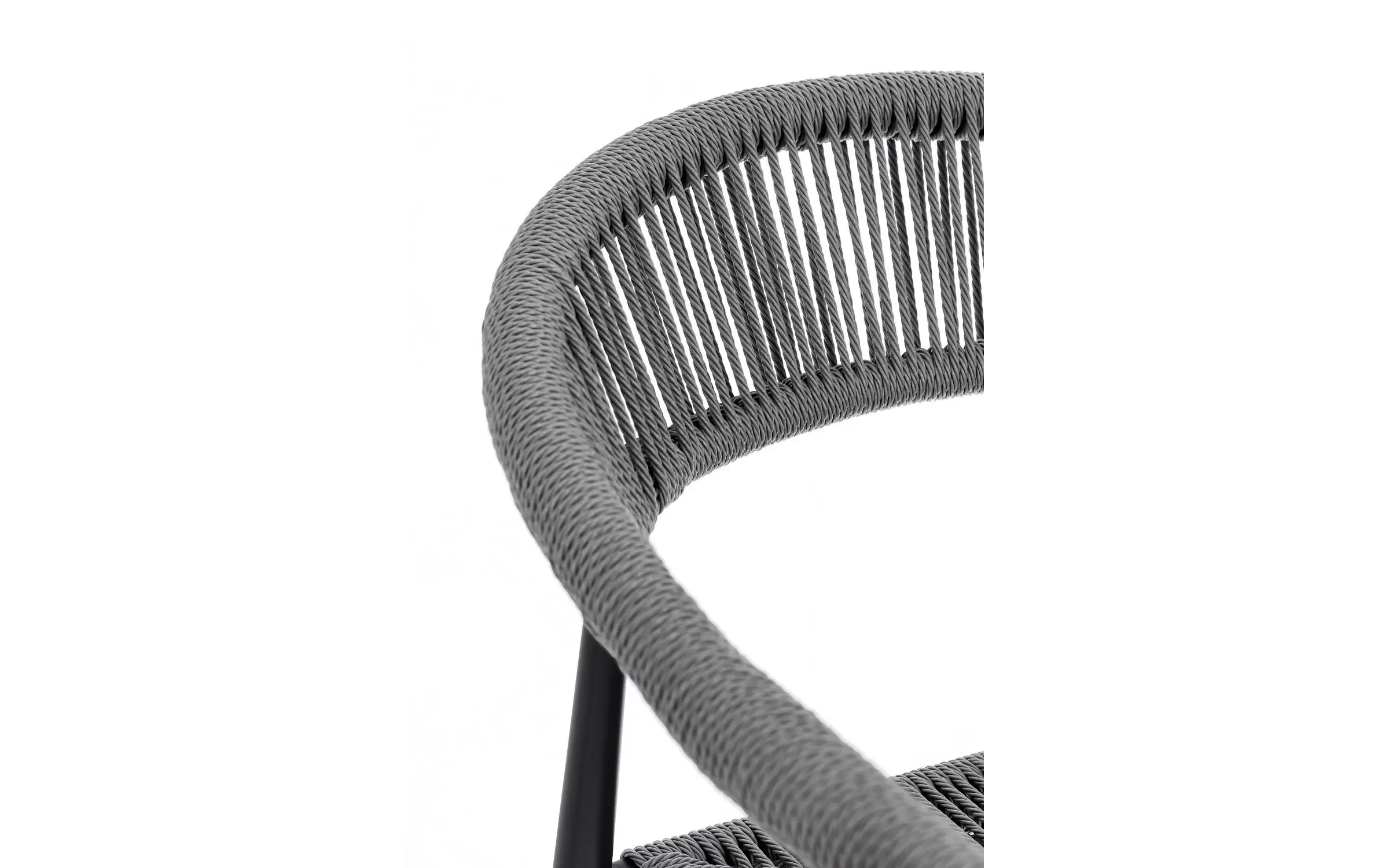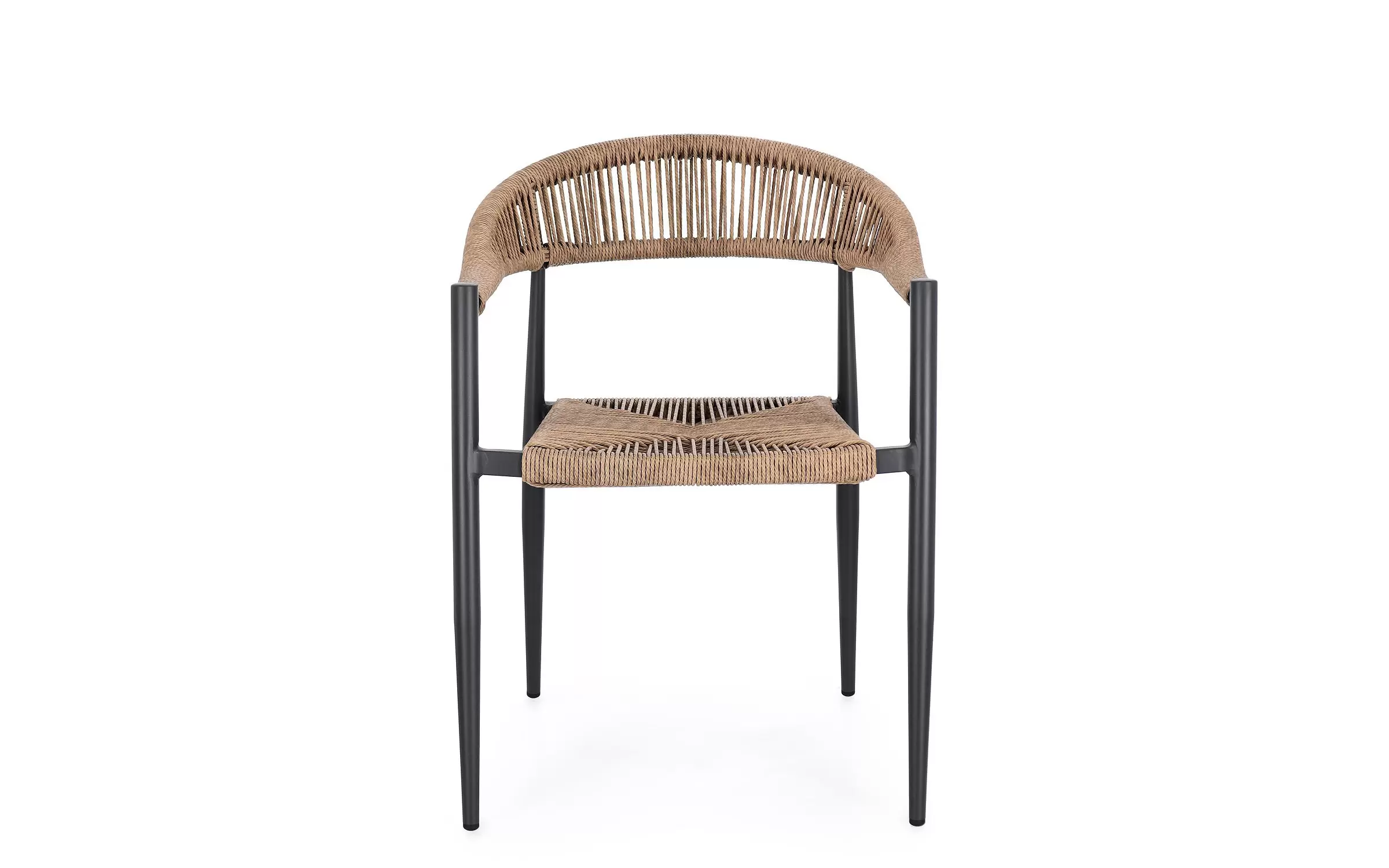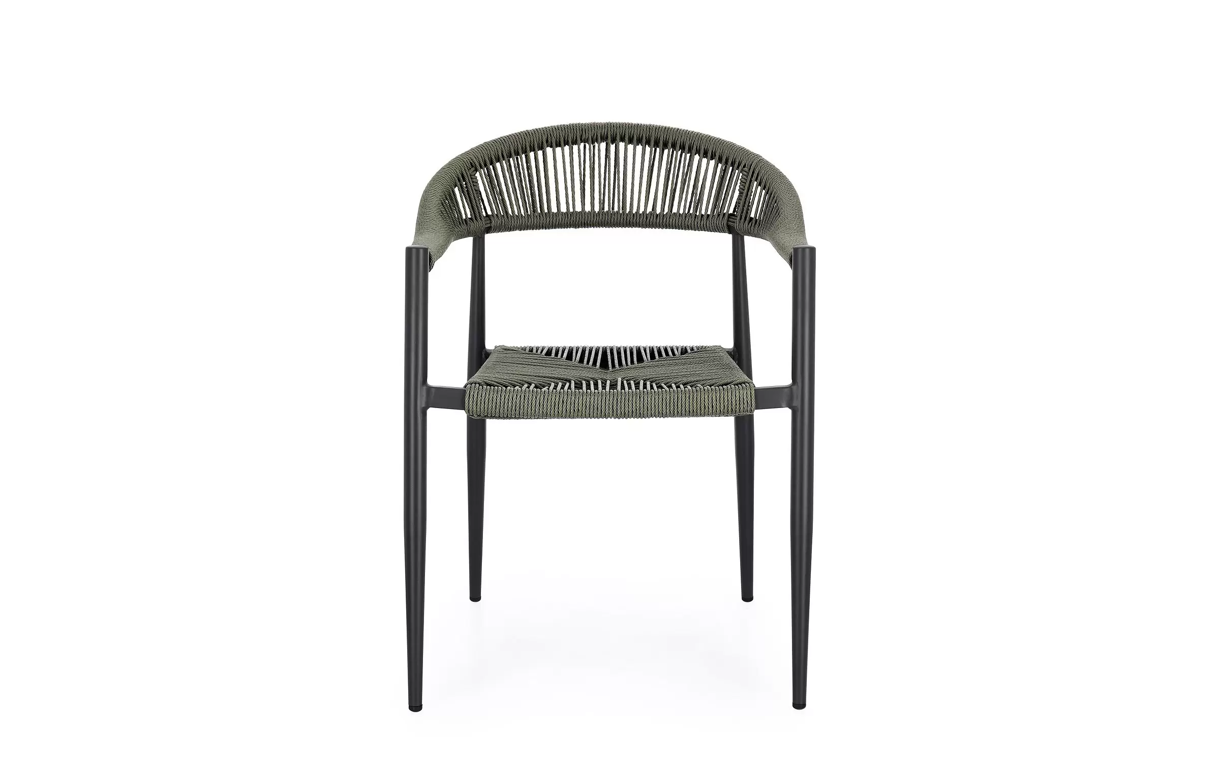 Krzesło o lekkiej konstrukcji wpasowujący się w nowoczesny styl na tarasie. Aluminiowa podstawa opleciona technorattanem zwijanym w stylu liścia bananowca, W komplecie poduszka mocowana wstążkami do siedzenia.