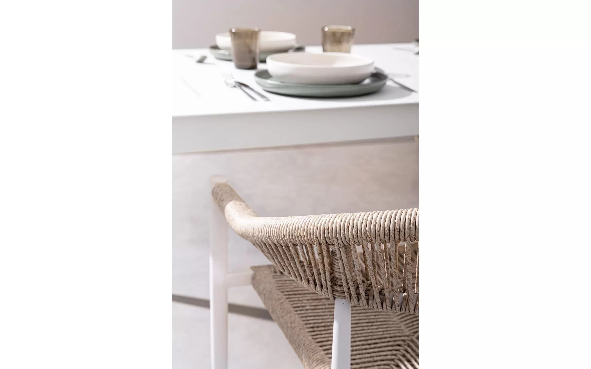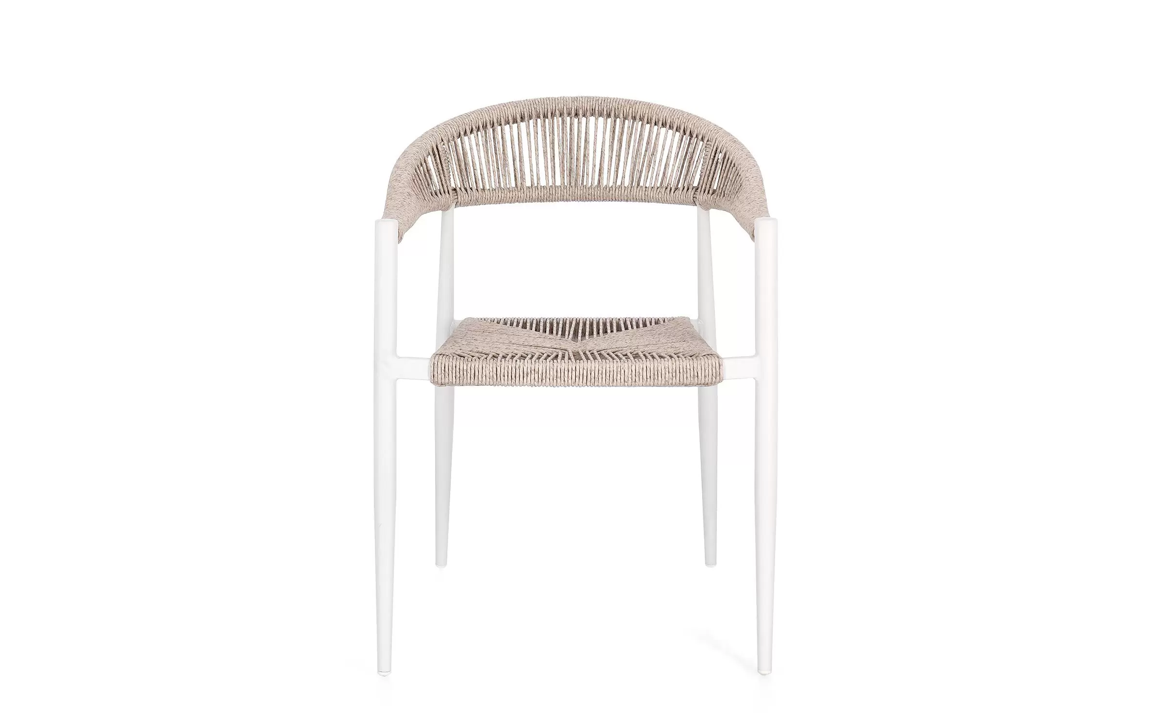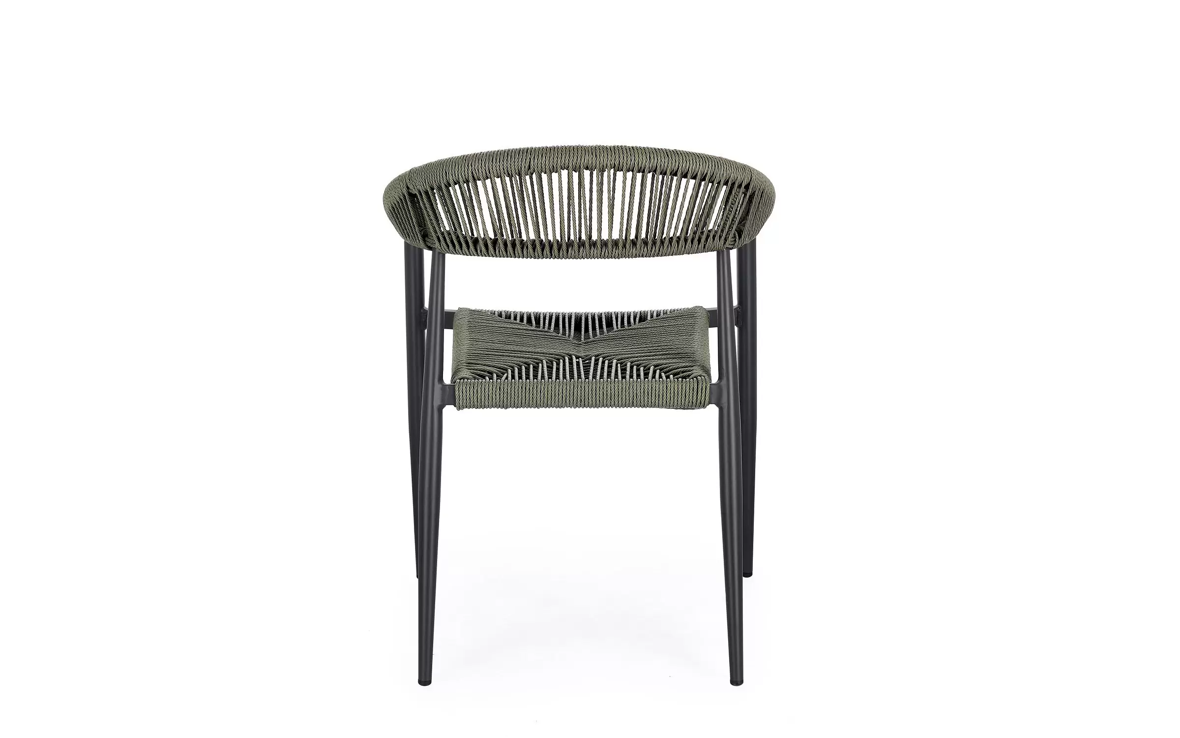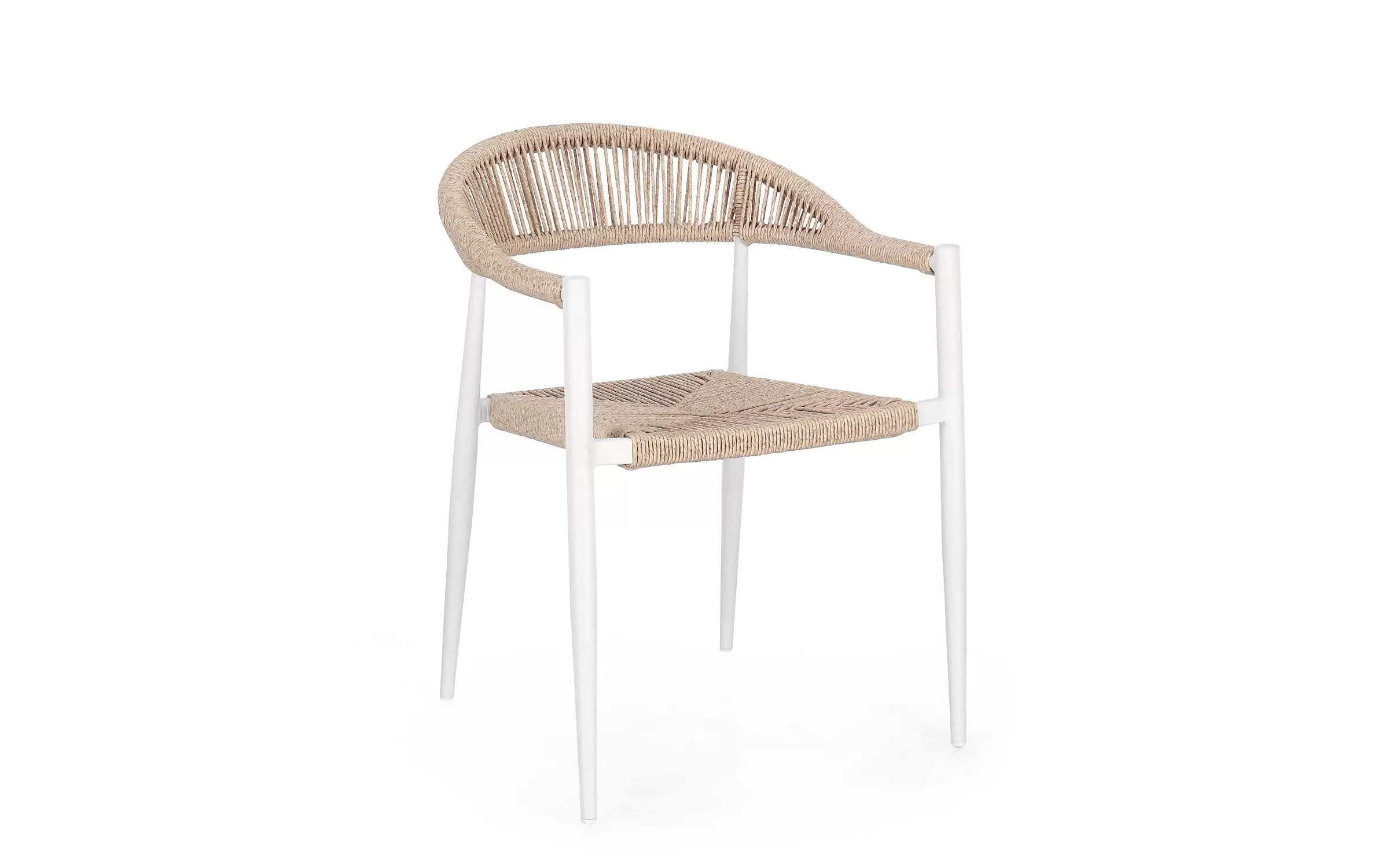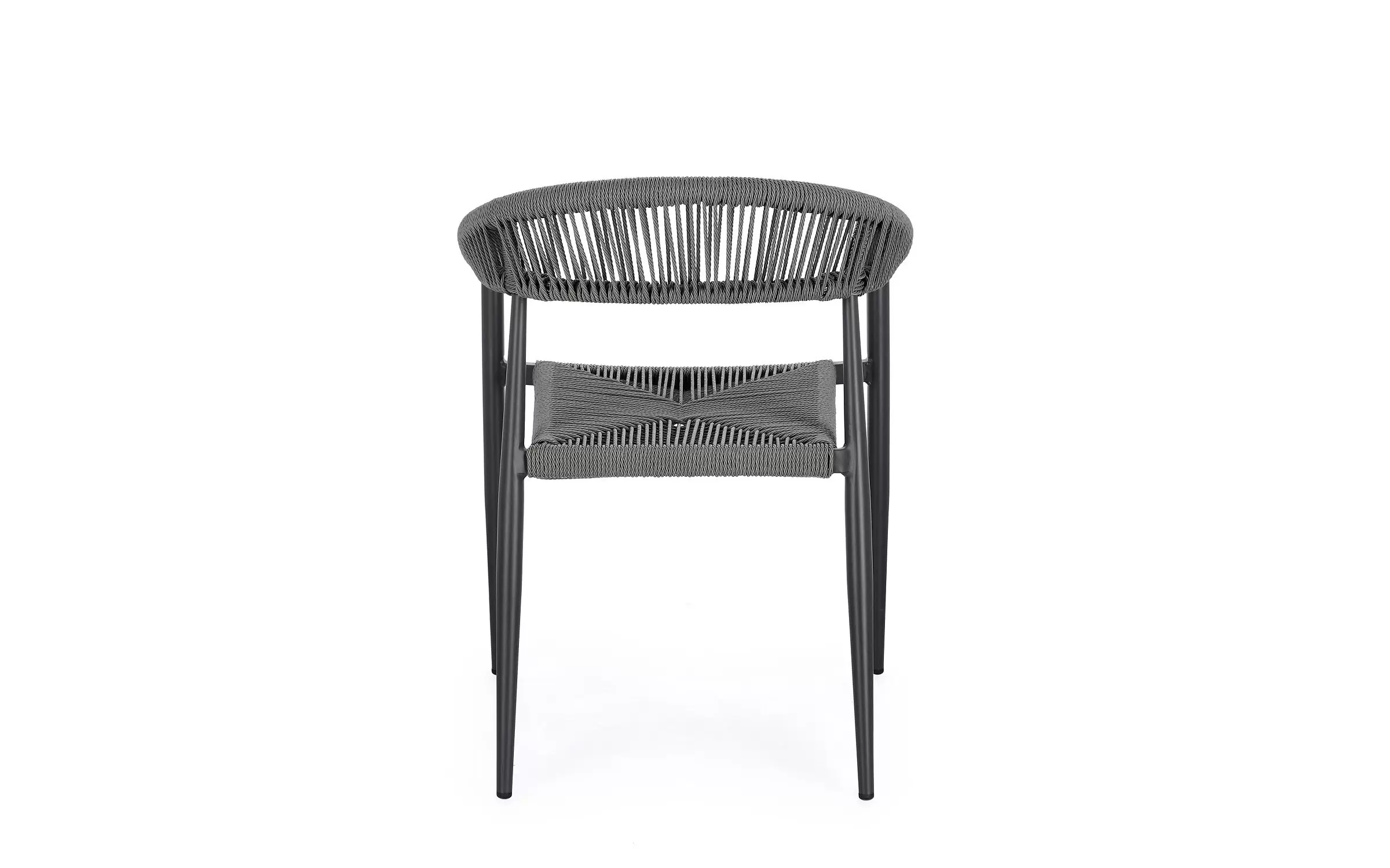 Krzesło o lekkiej konstrukcji wpasowujący się w nowoczesny styl na tarasie. Aluminiowa podstawa opleciona technorattanem zwijanym w stylu liścia bananowca, W komplecie poduszka mocowana wstążkami do siedzenia.