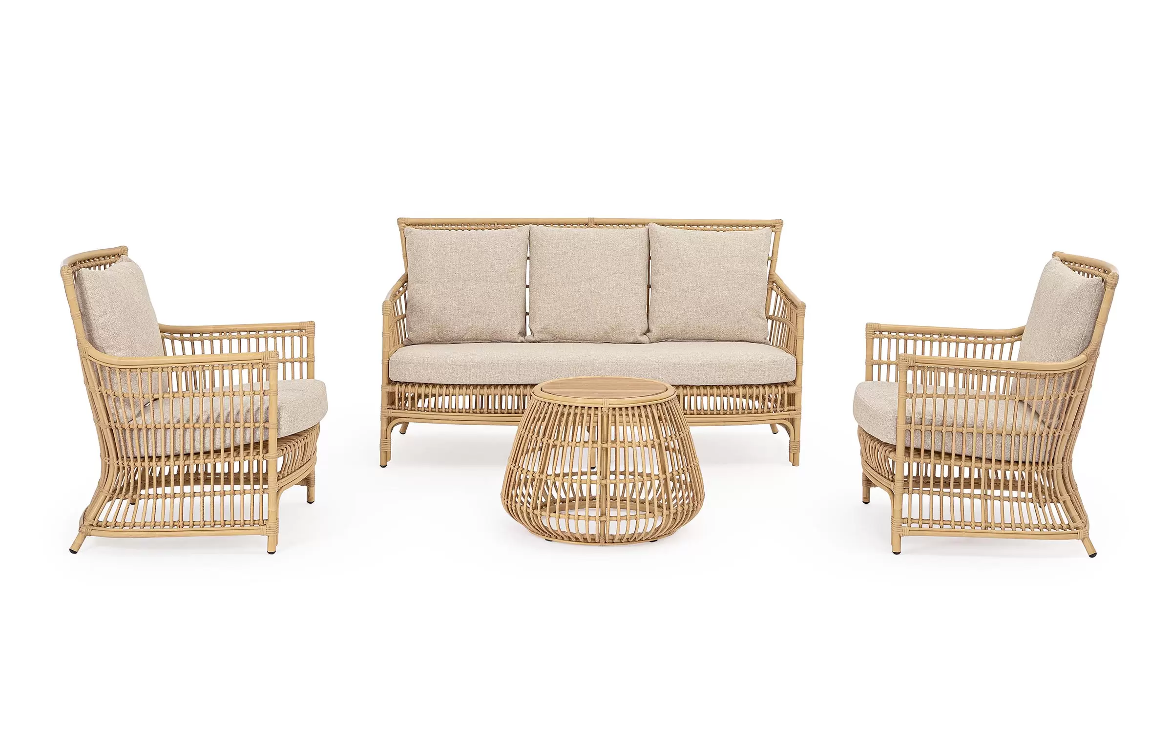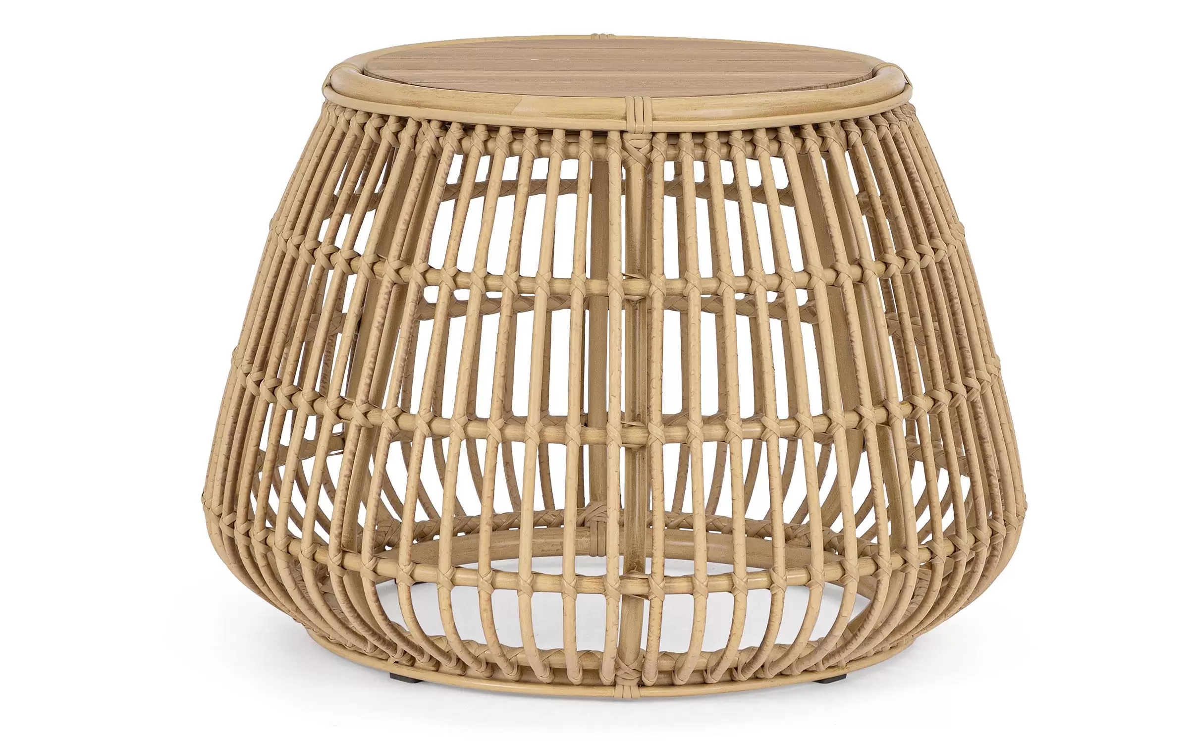 Klasyczny w formie stolik ogrodowy wykonany z nowoczesnych materiałów. Aluminiowe profile malowane proszkowo z technologią sublimacji tworzące powłokę imitująca naturalny rattan. Taka powłoka jest odporna na warunki atmosferyczne i UV.