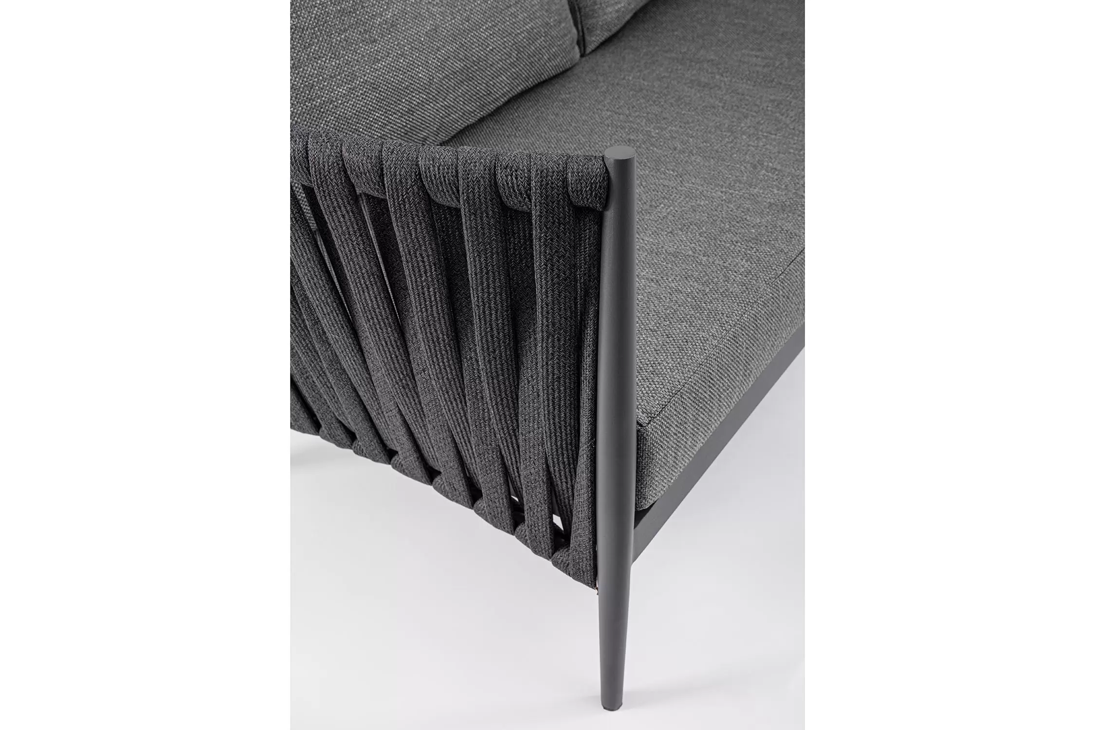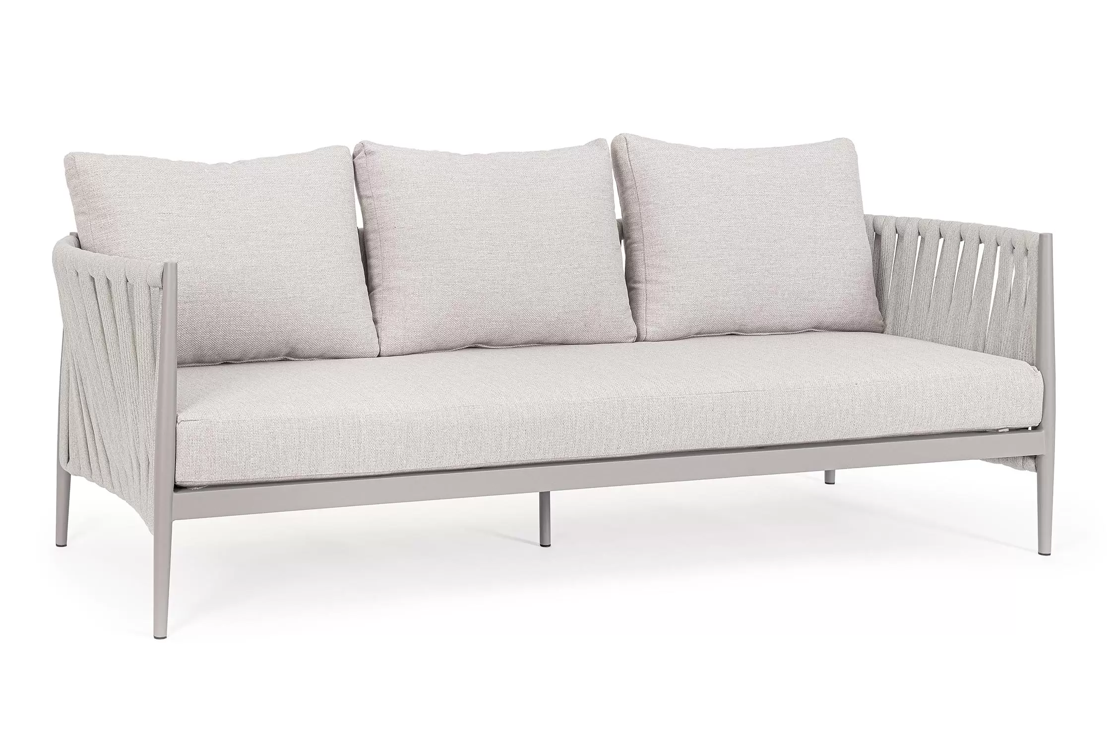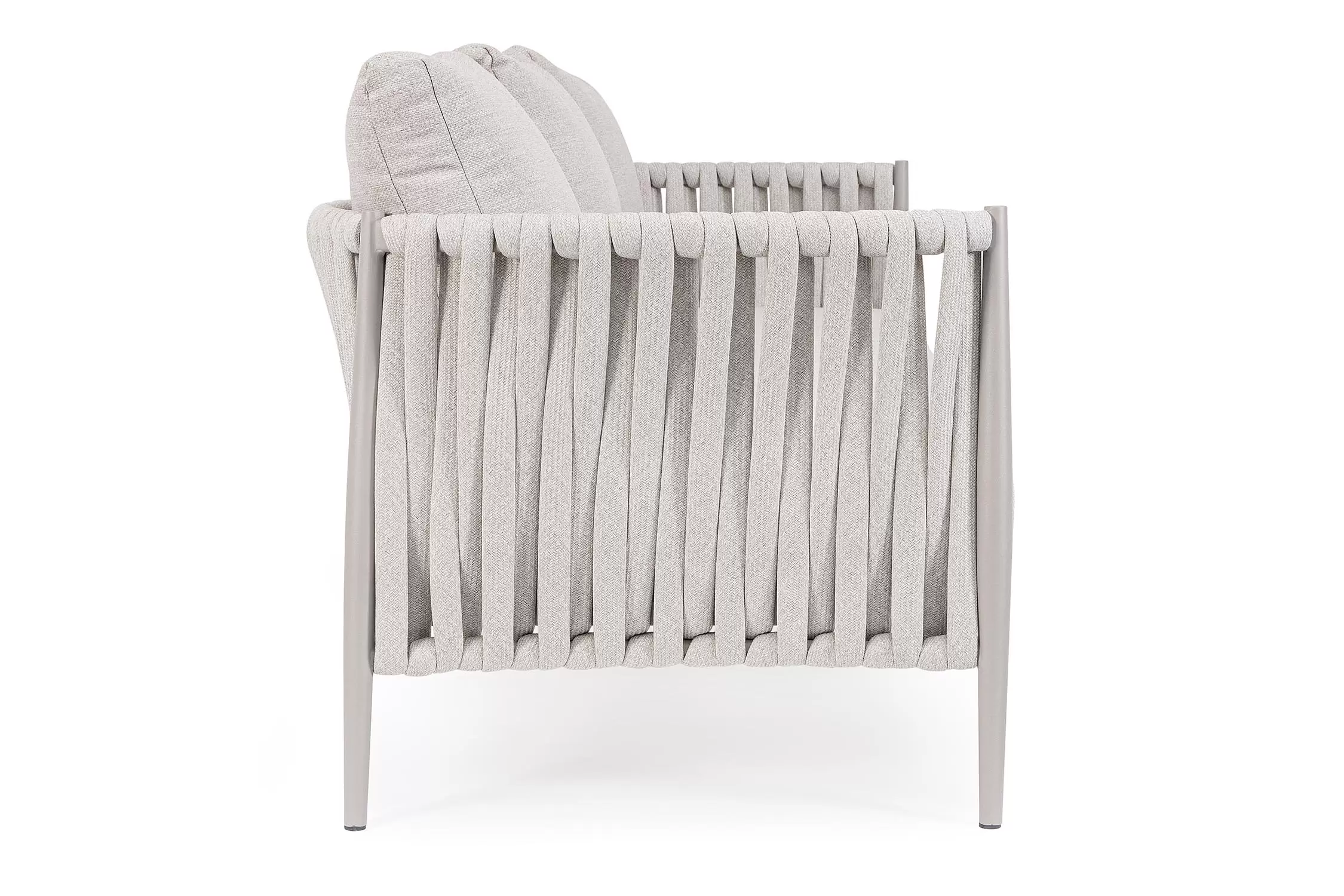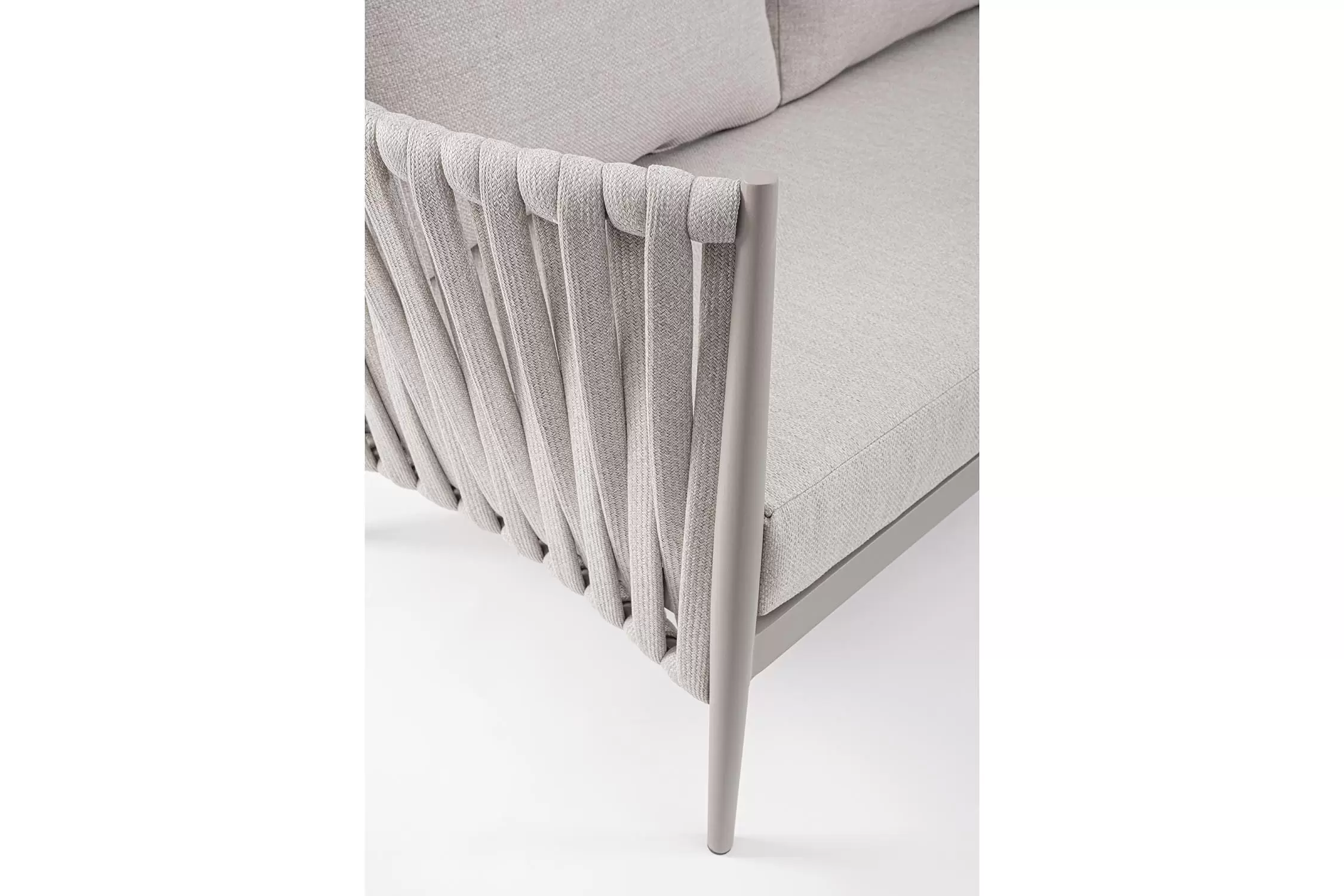 Ekskluzywna sofa wypoczynkowa na taras w oryginalnym i co najważniejsze odpornym na warunki atmosferyczne wykonaniu. Wygodna sofa dla trzech osób. Delikatnie wygięte podłokietniki i wygodne oparcie oraz siedzisko w formie miękkich poduszek, zostało wykonane z wodoodpornej tkaniny Olefin. Materiał, która jest barwioną na wskroś tkaniną akrylową odporną na zabrudzenia, jest również odporna na działanie wody i pleśni. Ciekawą formą urozmaicenia budowy sofy jest zastosowanie warkoczowego splotu po bokach i z tyłu stelaża. Stelaż sofy, a także nogi wykonano z aluminium w malowaniu proszkowym. Wykorzystano tu system QDF, który jest bardzo odpornym na warunki atmosferyczne wypełnieniem poduch lub siedzisk, z wysokiej jakości szybkoschnącej pianki tapicerskiej Quick Dry Foam o właściwościach antybakteryjnych. Wytrzymałość materiałów, a także odporność na korozję, umożliwiają zastosowanie zarówno w domu jak i na zewnątrz - w ogrodzie lub na tarasie. Meble należy czyścić nie wykorzystując silnych środków chemicznych.
