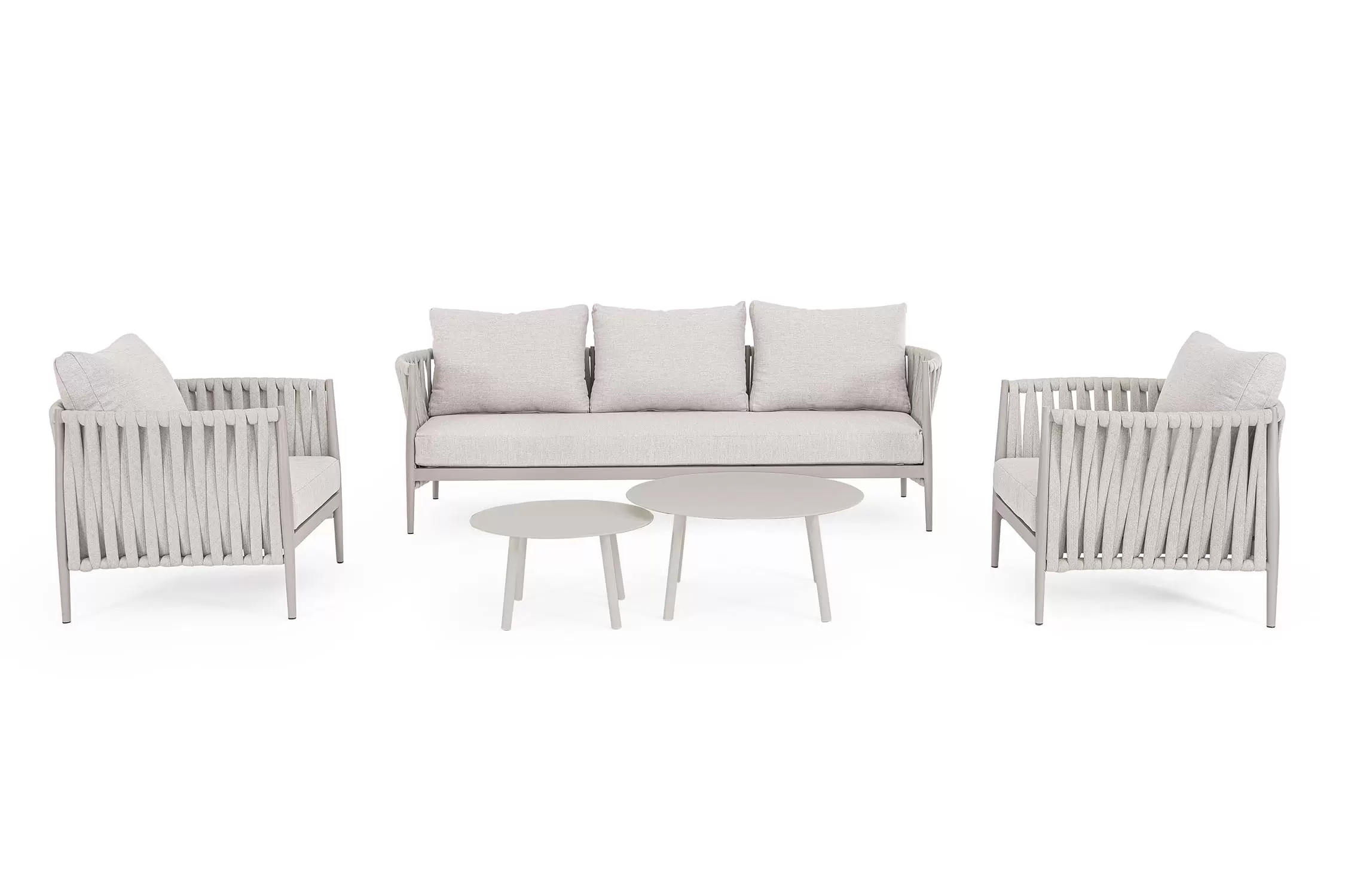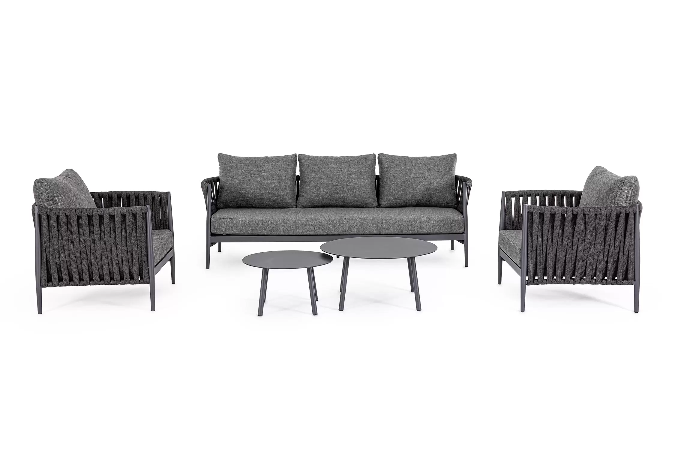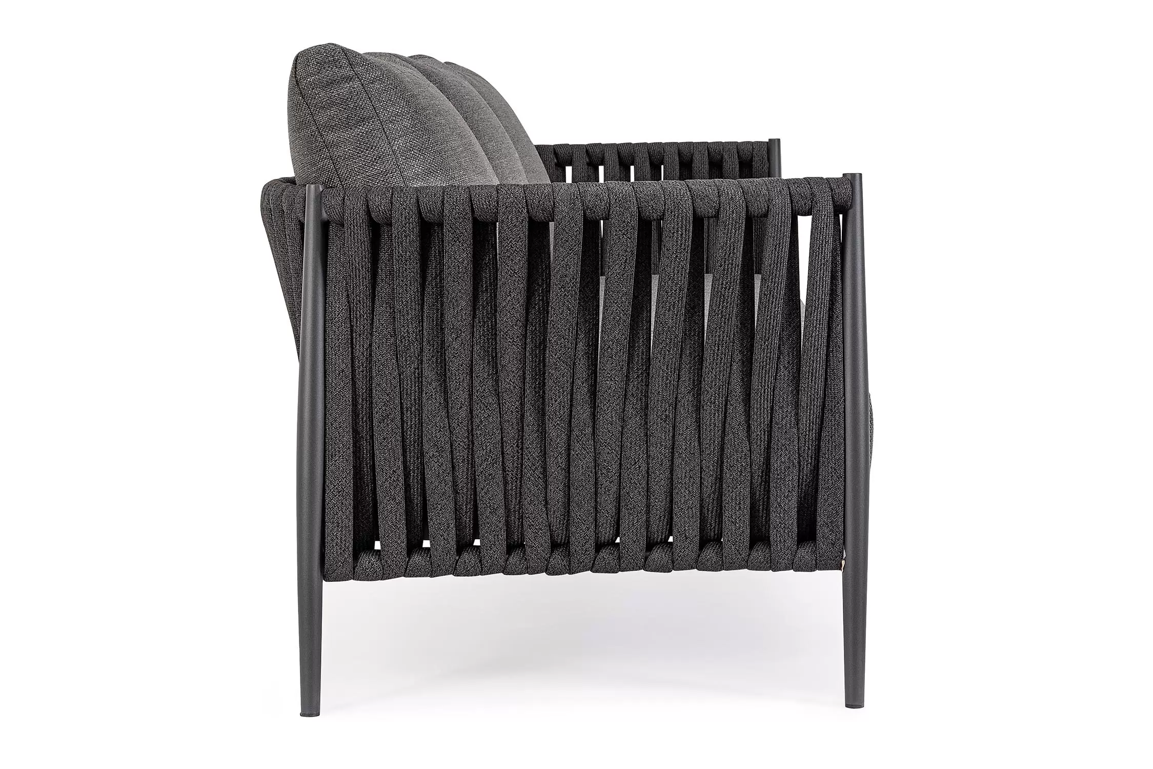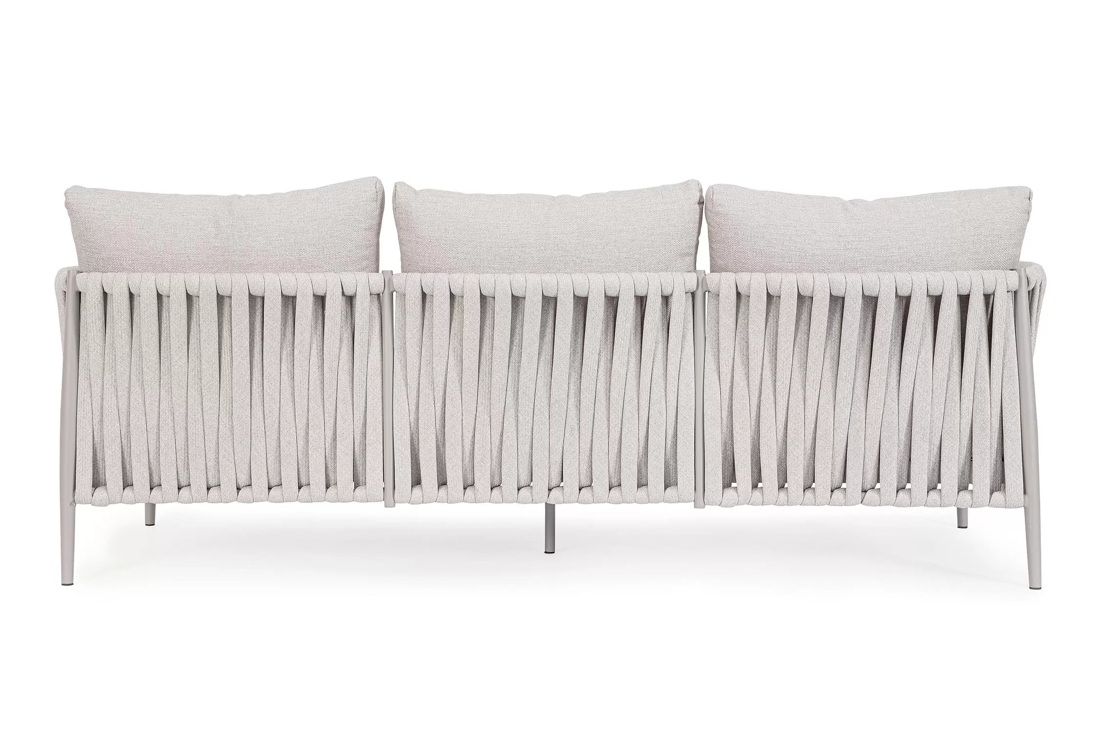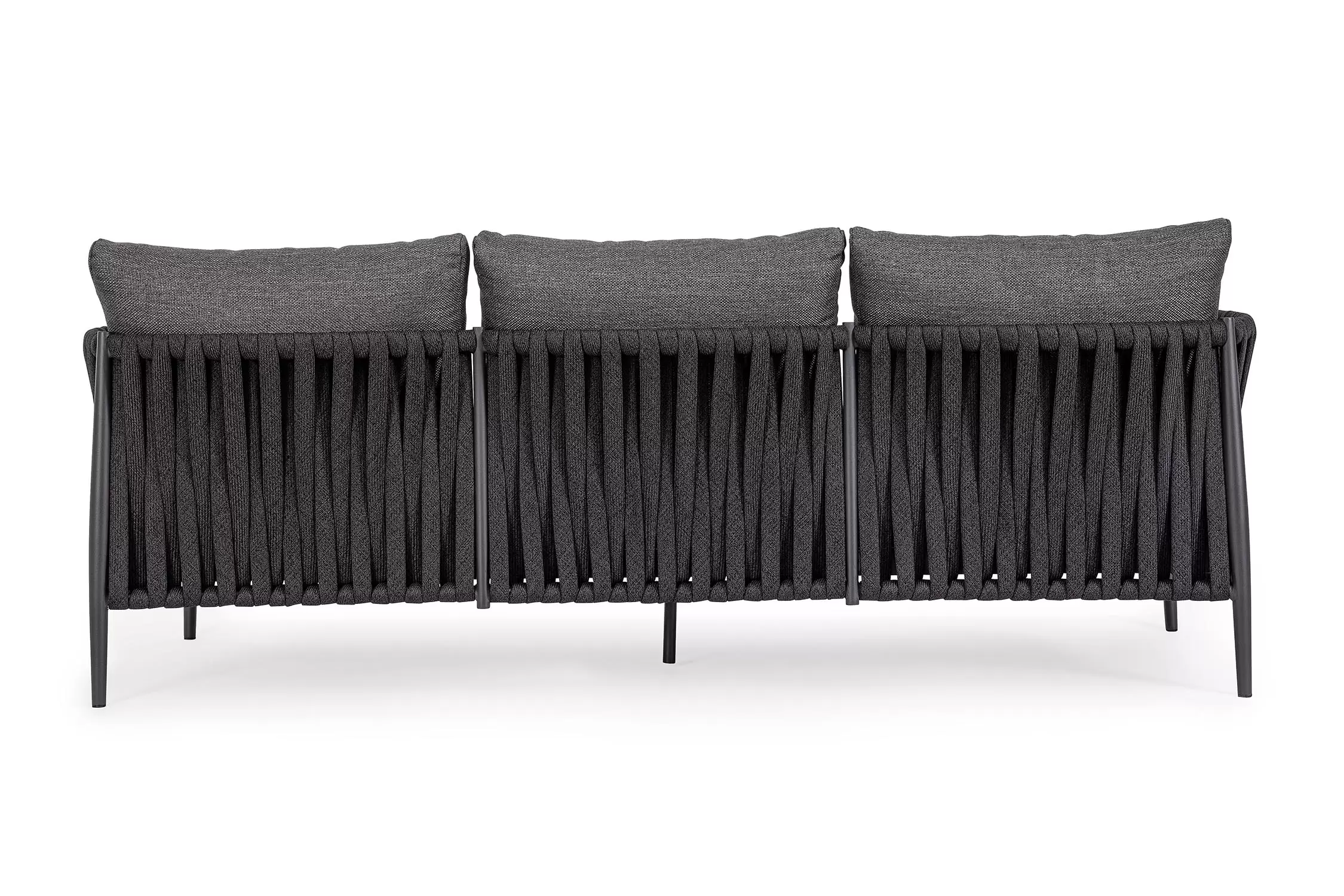 Ekskluzywna sofa wypoczynkowa na taras w oryginalnym i co najważniejsze odpornym na warunki atmosferyczne wykonaniu. Wygodna sofa dla trzech osób. Delikatnie wygięte podłokietniki i wygodne oparcie oraz siedzisko w formie miękkich poduszek, zostało wykonane z wodoodpornej tkaniny Olefin. Materiał, która jest barwioną na wskroś tkaniną akrylową odporną na zabrudzenia, jest również odporna na działanie wody i pleśni. Ciekawą formą urozmaicenia budowy sofy jest zastosowanie warkoczowego splotu po bokach i z tyłu stelaża. Stelaż sofy, a także nogi wykonano z aluminium w malowaniu proszkowym. Wykorzystano tu system QDF, który jest bardzo odpornym na warunki atmosferyczne wypełnieniem poduch lub siedzisk, z wysokiej jakości szybkoschnącej pianki tapicerskiej Quick Dry Foam o właściwościach antybakteryjnych. Wytrzymałość materiałów, a także odporność na korozję, umożliwiają zastosowanie zarówno w domu jak i na zewnątrz - w ogrodzie lub na tarasie. Meble należy czyścić nie wykorzystując silnych środków chemicznych.