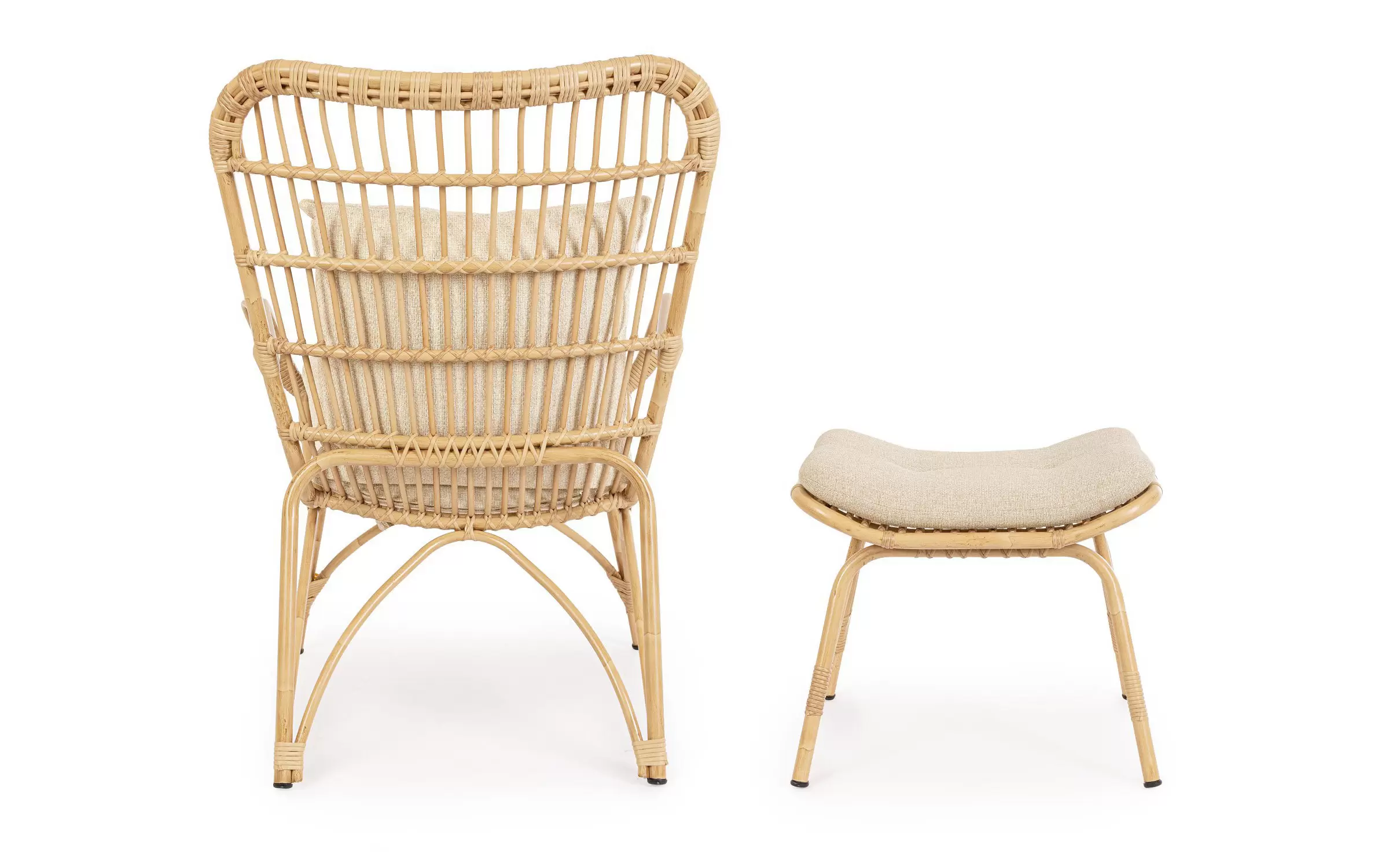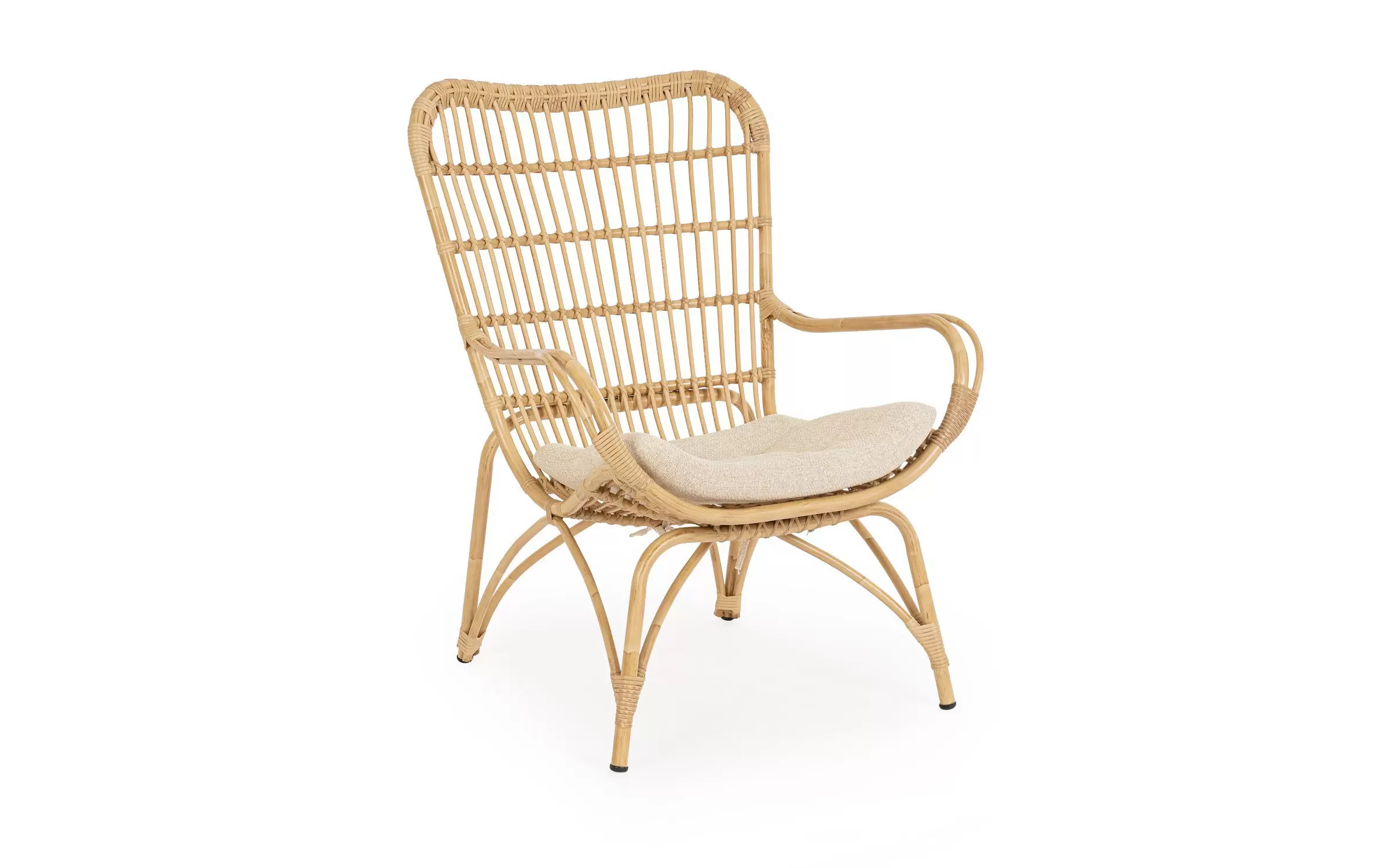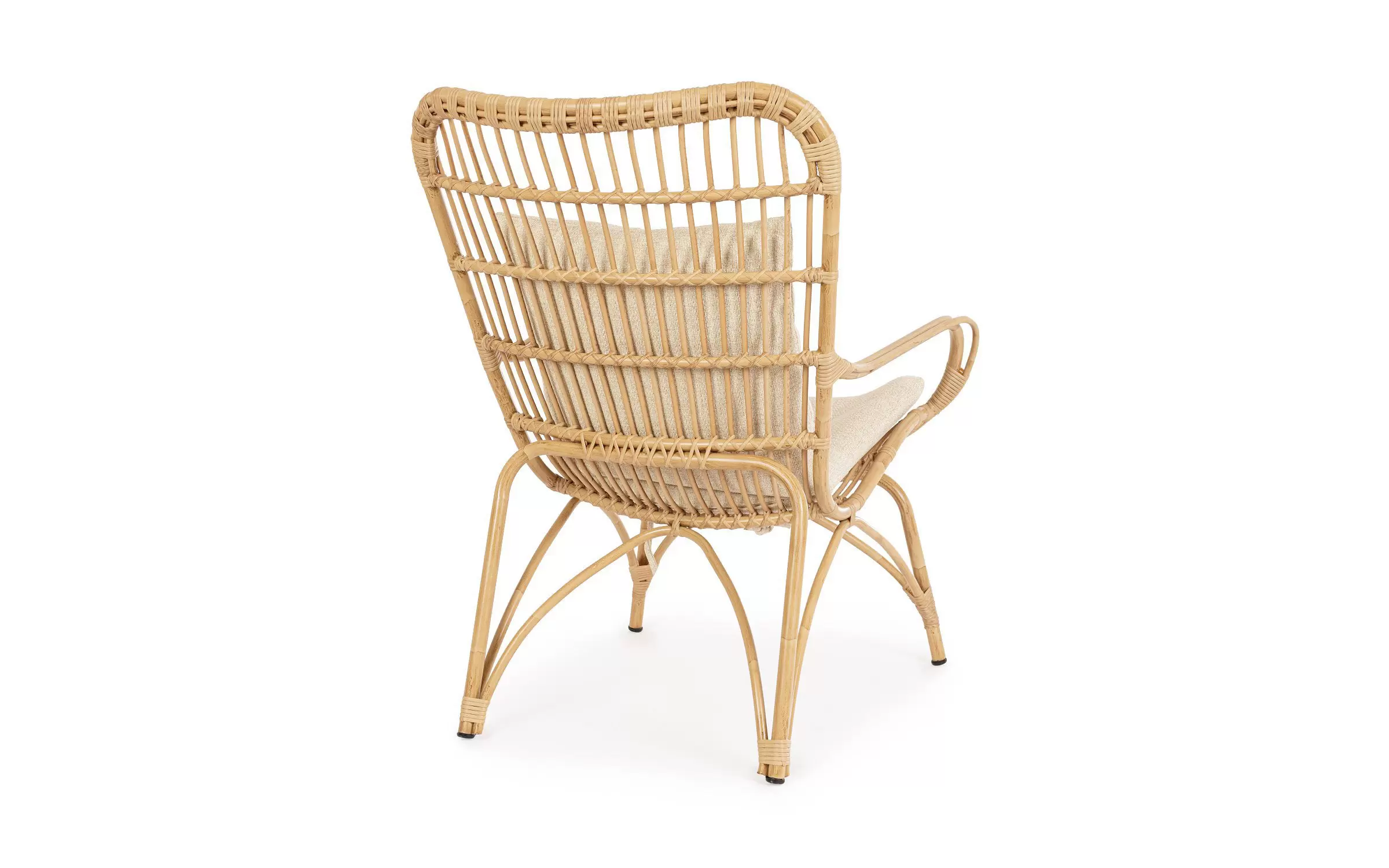 Klasyczny w formie fotel ogrodowy wykonany z nowoczesnych materiałów. Aluminiowe profile malowane proszkowo z technologią sublimacji tworzące powłokę imitująca naturalny rattan. Taka powłoka jest odporna na warunki atmosferyczne i UV.