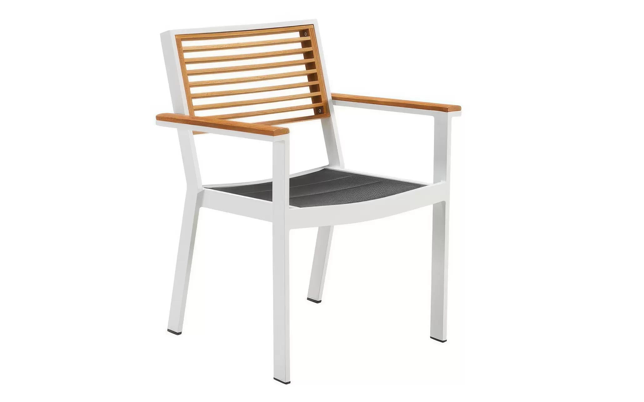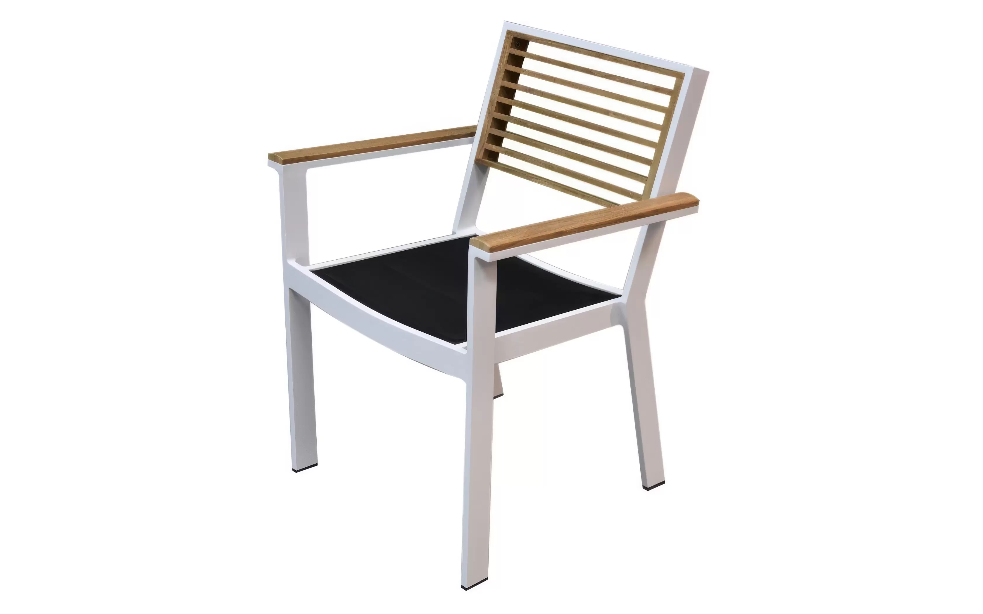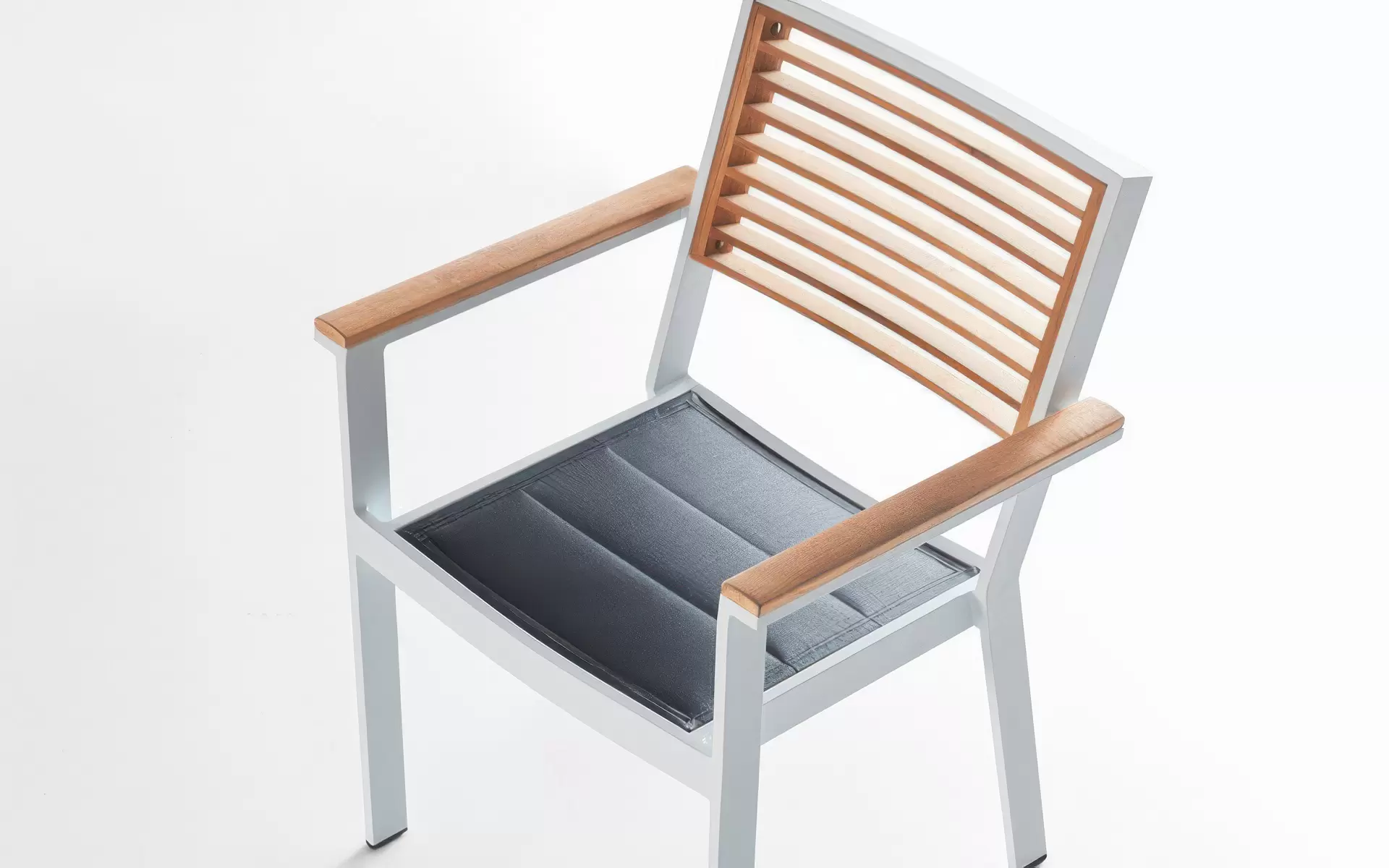 Kolorystyka krzesła dzięki elementom z drewna teak oraz czarną podwójną tekstyliną pasuje stylowo do różnych stołów zarówno czysto aluminiowych jak i z drewna teak, zarówno białych jak i czarnych.
