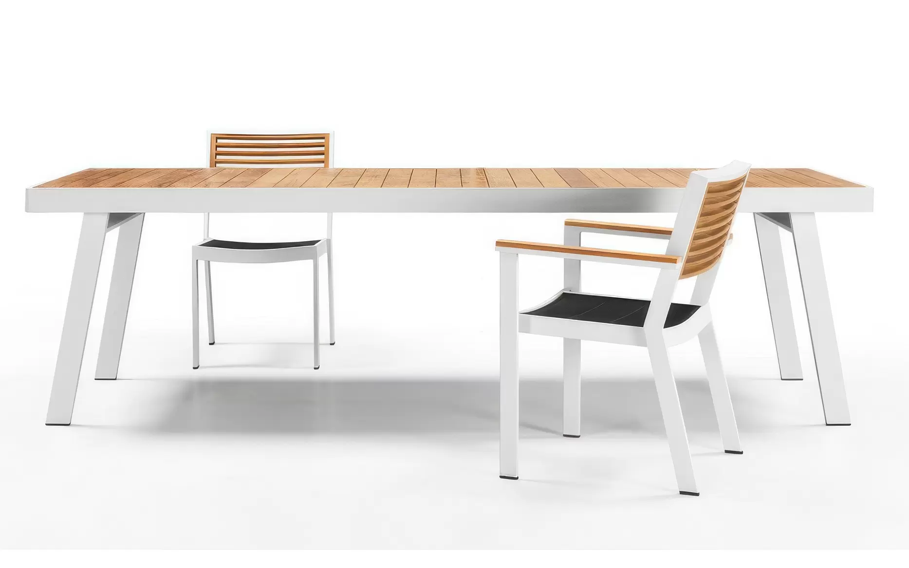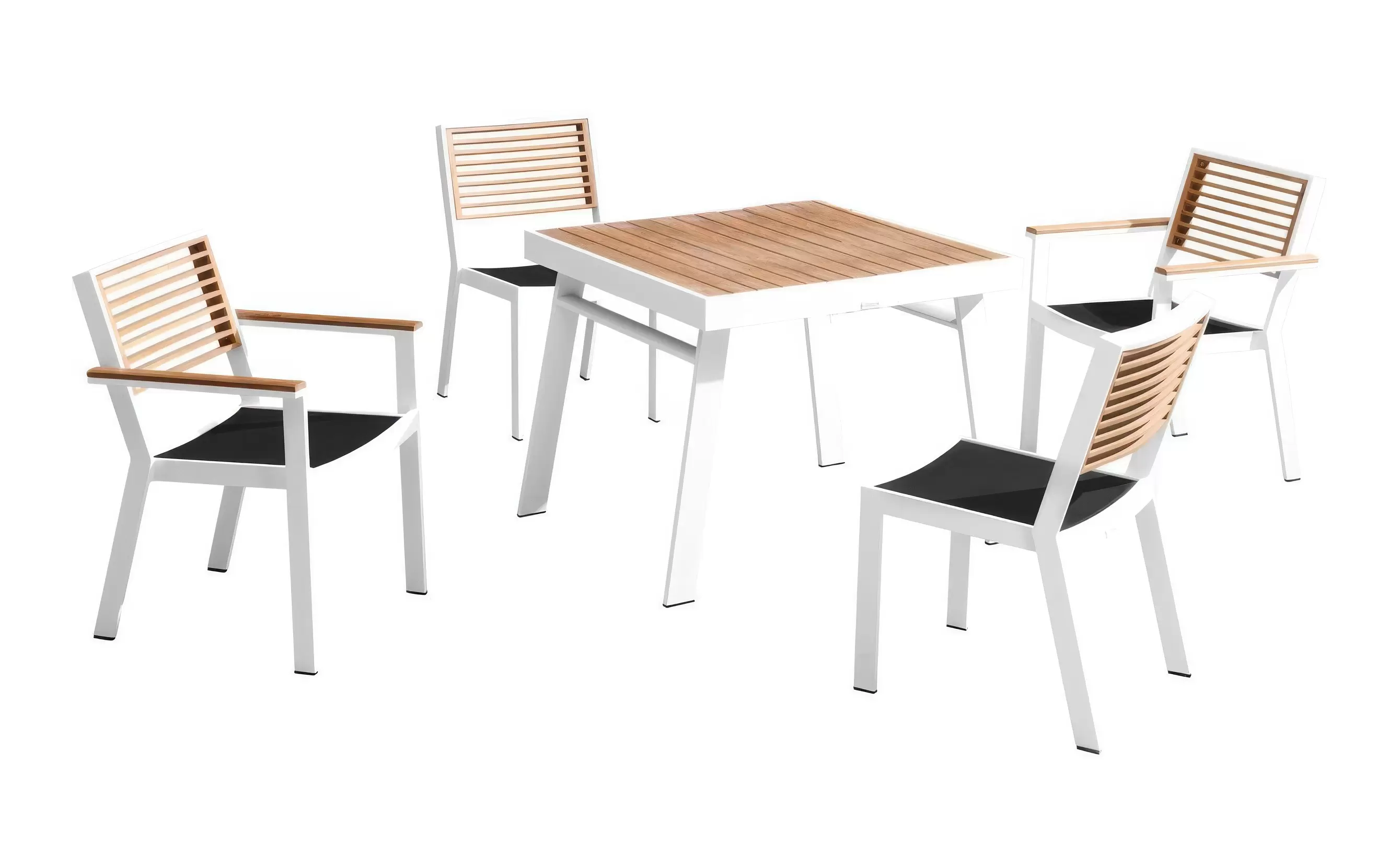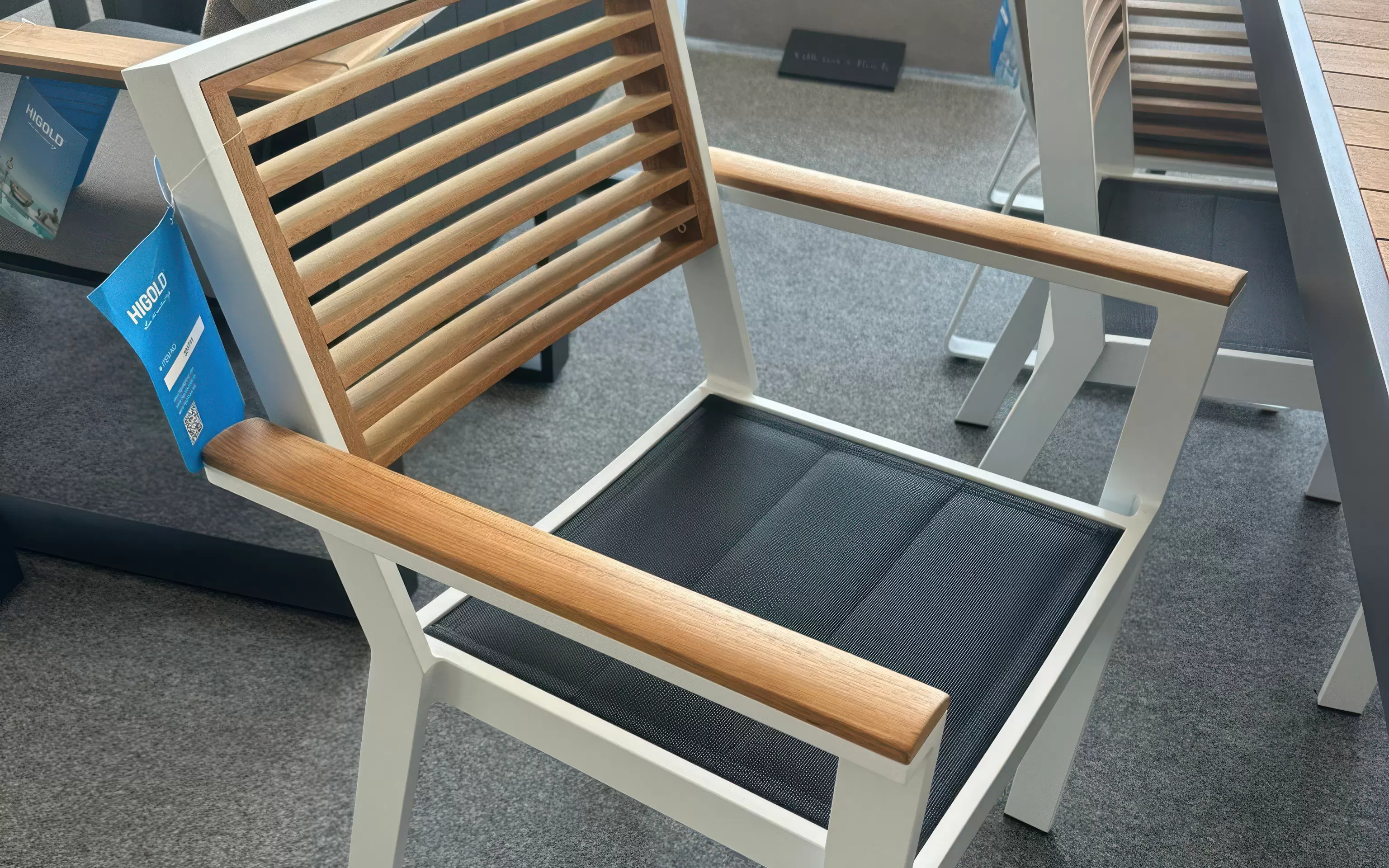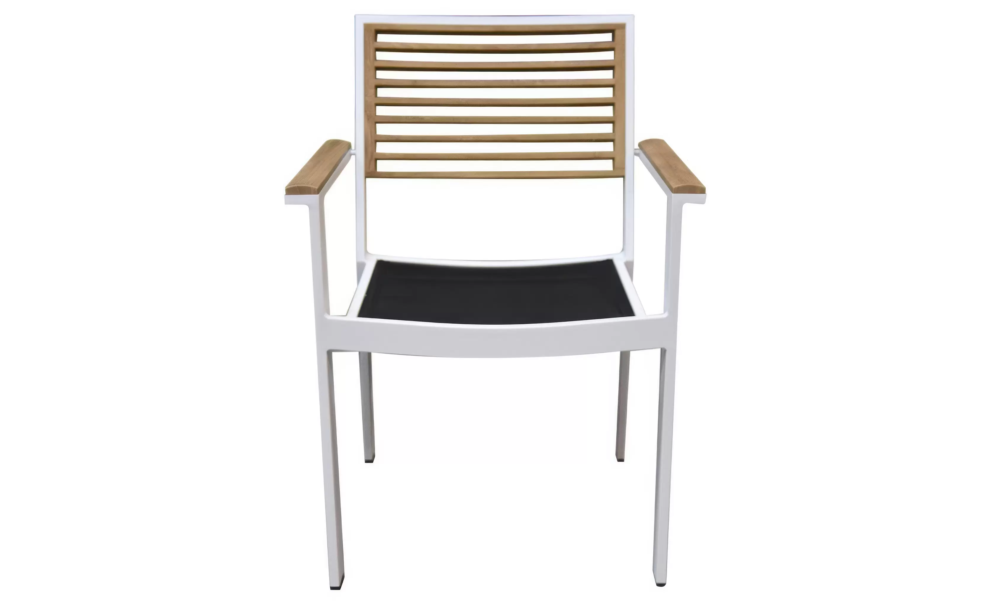 Kolorystyka krzesła dzięki elementom z drewna teak oraz czarną podwójną tekstyliną pasuje stylowo do różnych stołów zarówno czysto aluminiowych jak i z drewna teak, zarówno białych jak i czarnych.