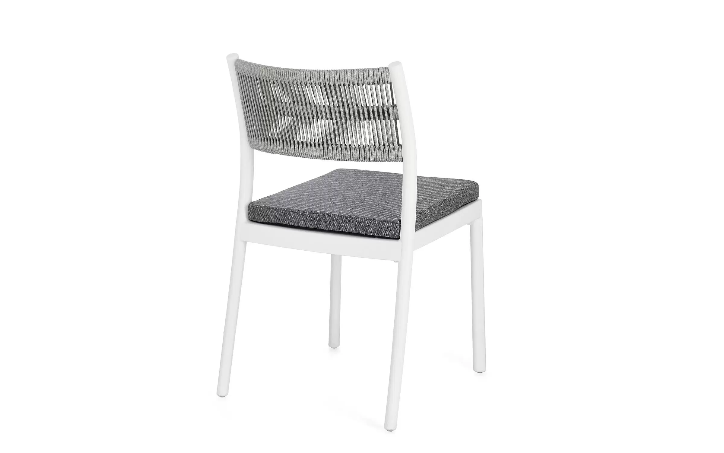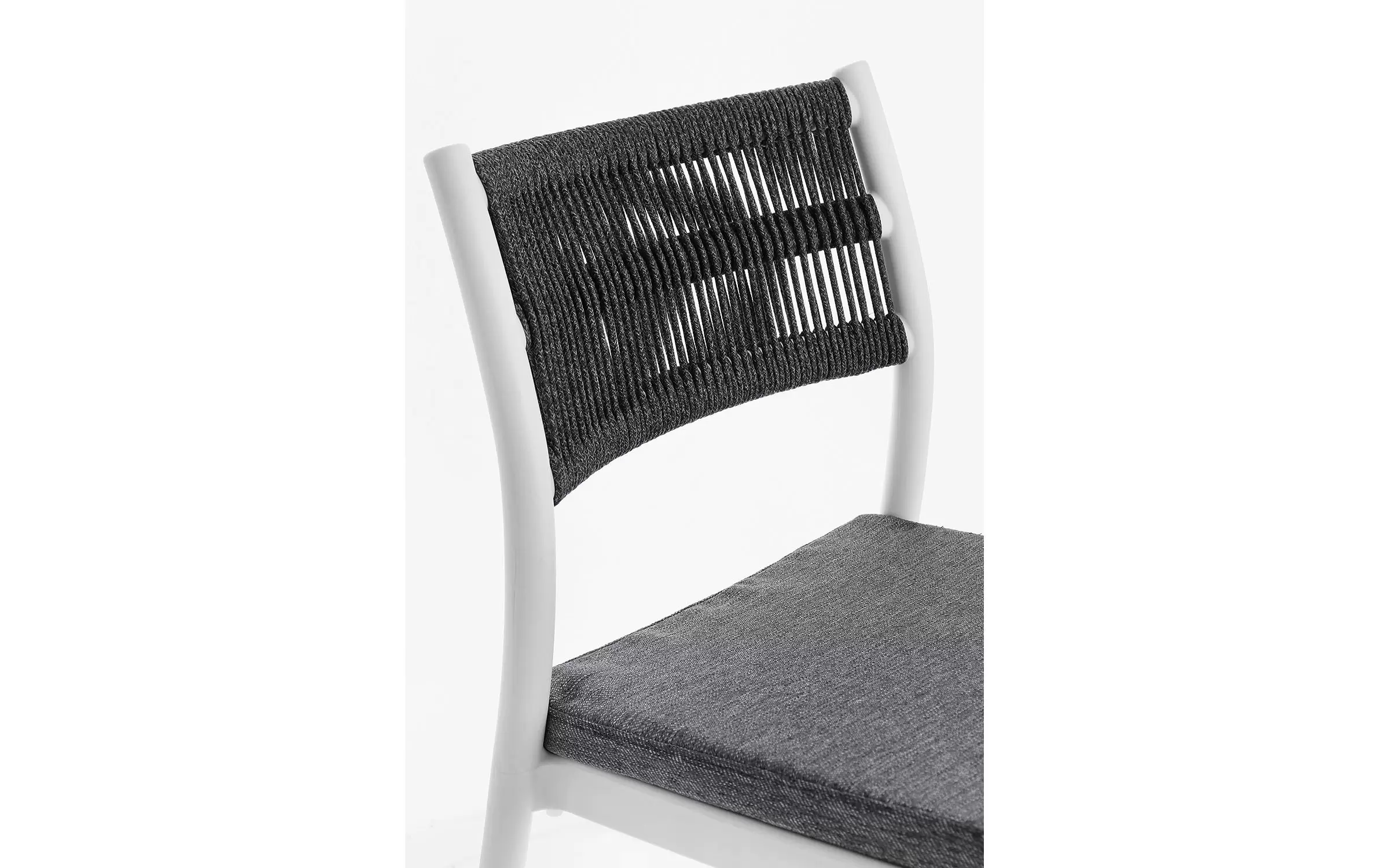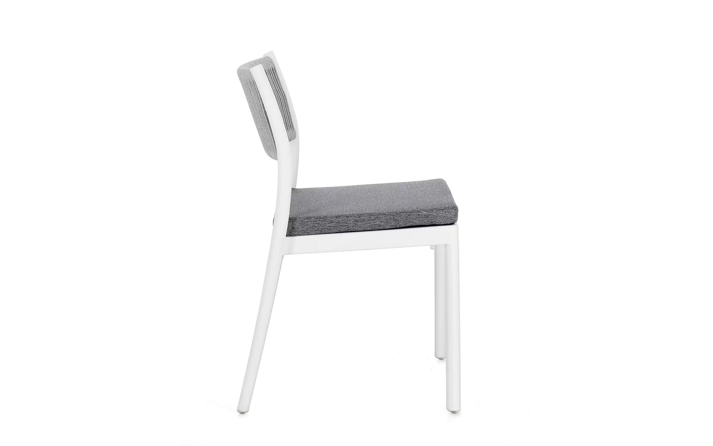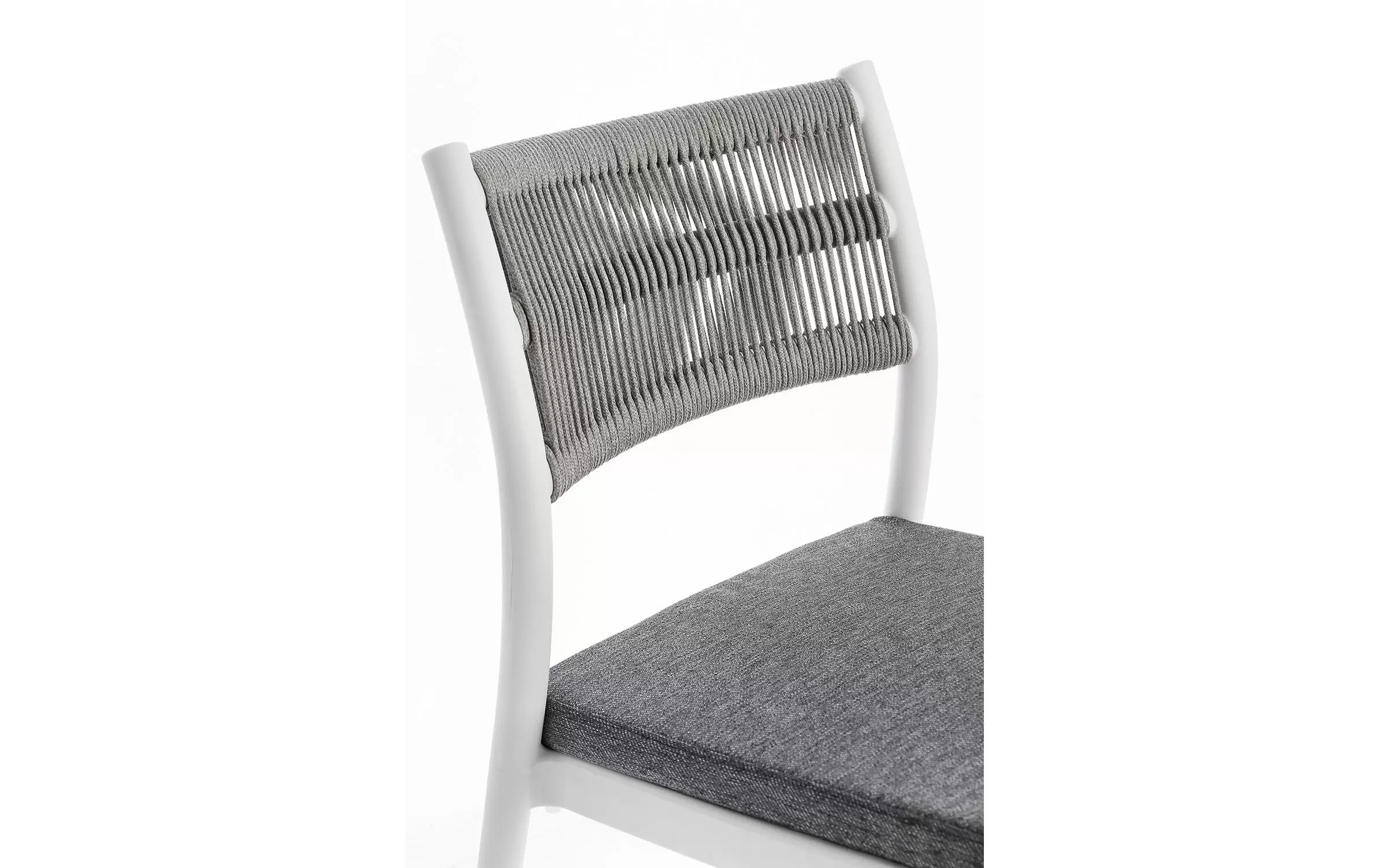 Aluminiowe krzesło na taras w kolorze białym z możliwością sztaplowania. Oparcie oplecione liną.