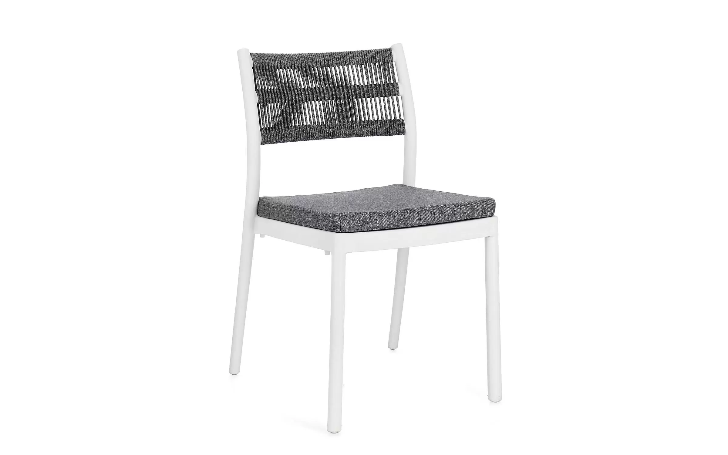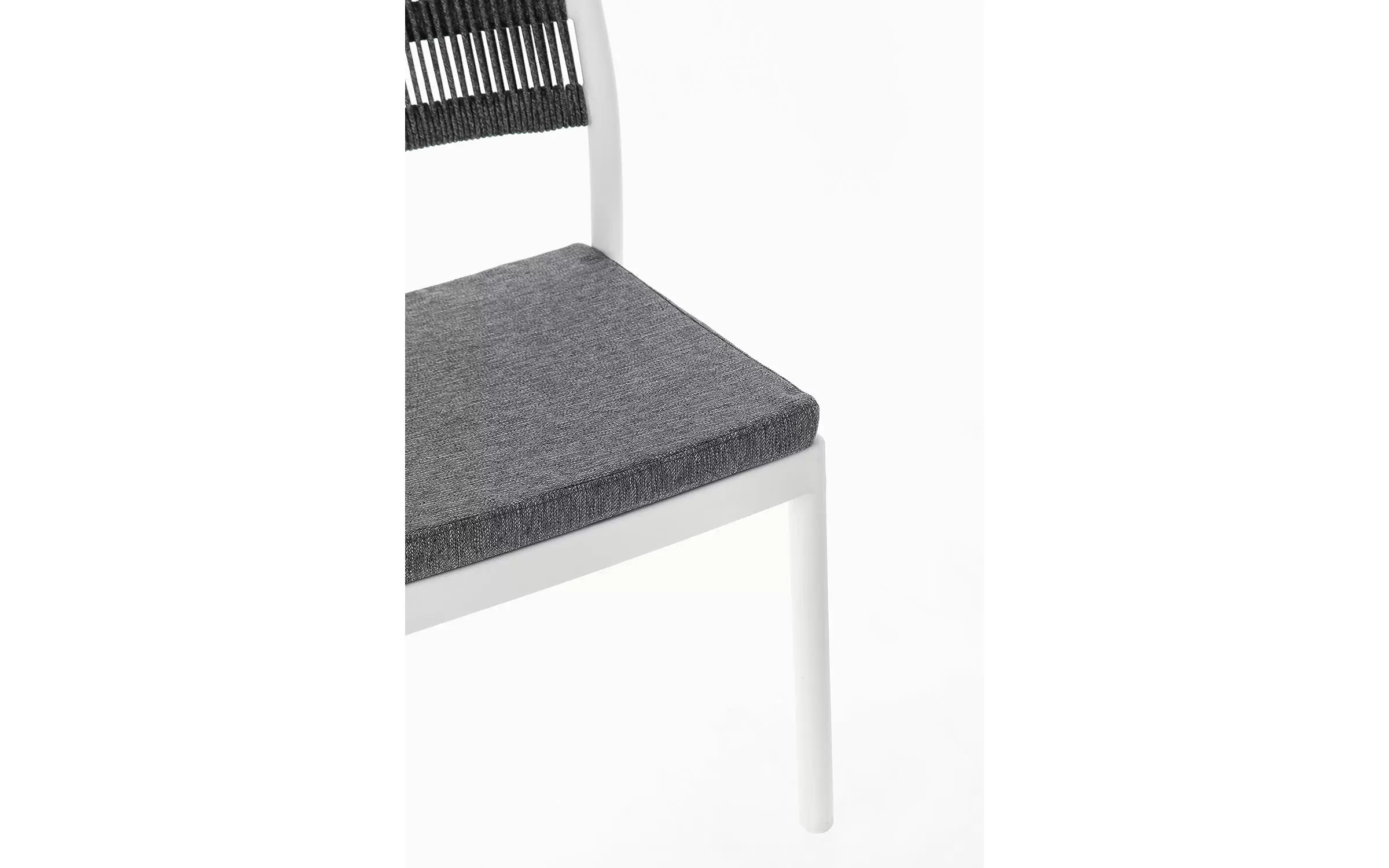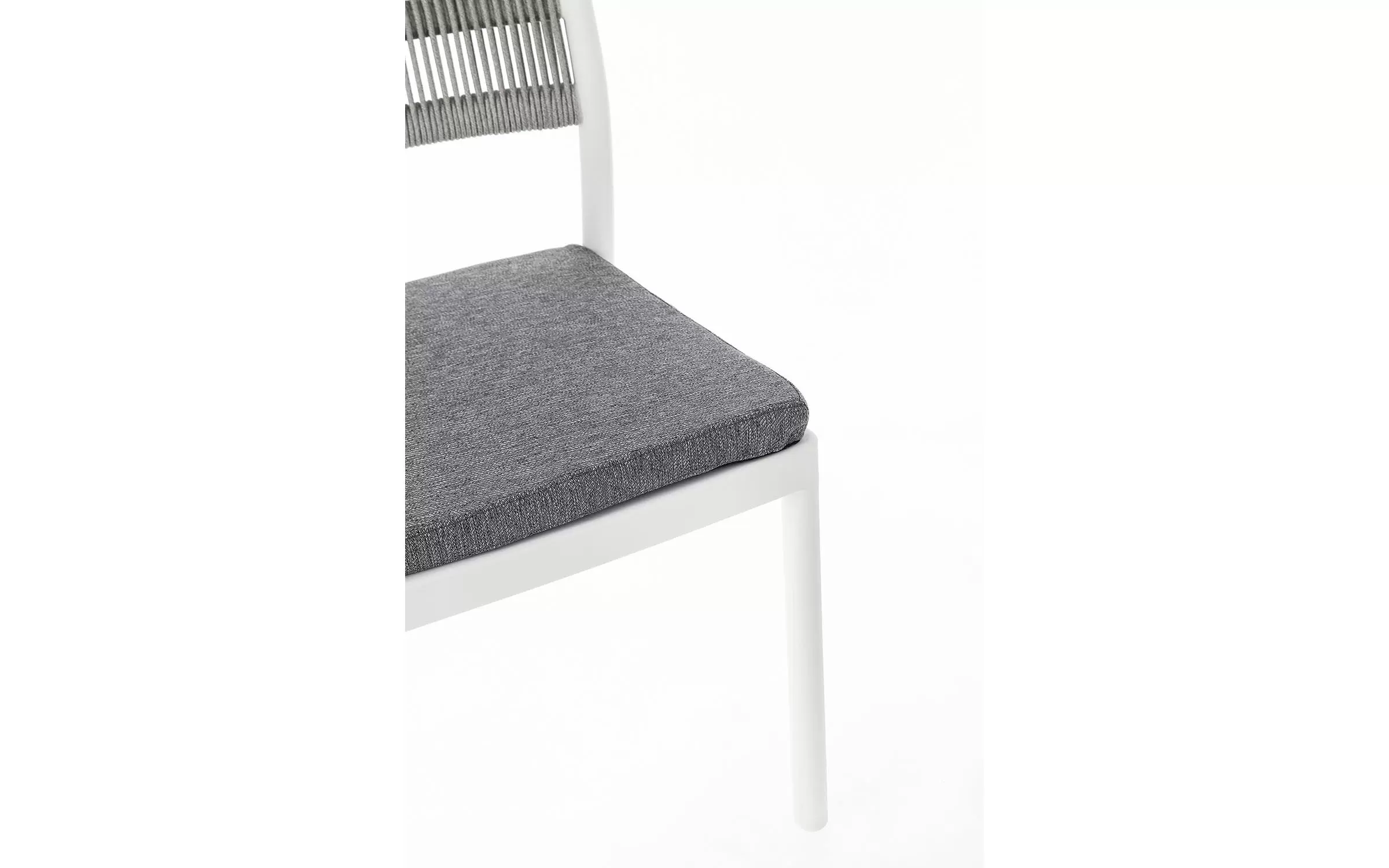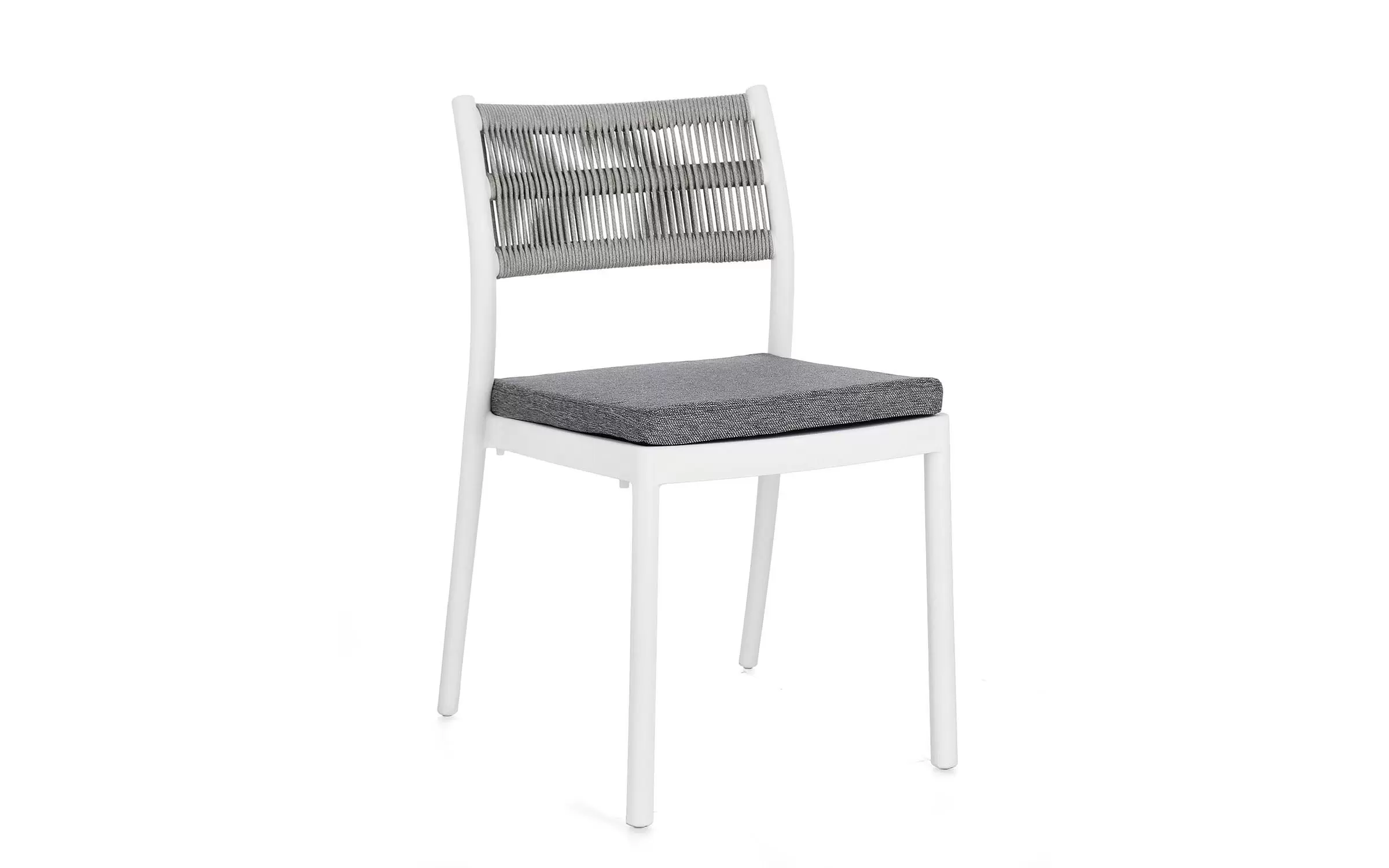 Aluminiowe krzesło na taras w kolorze białym z możliwością sztaplowania. Oparcie oplecione liną.